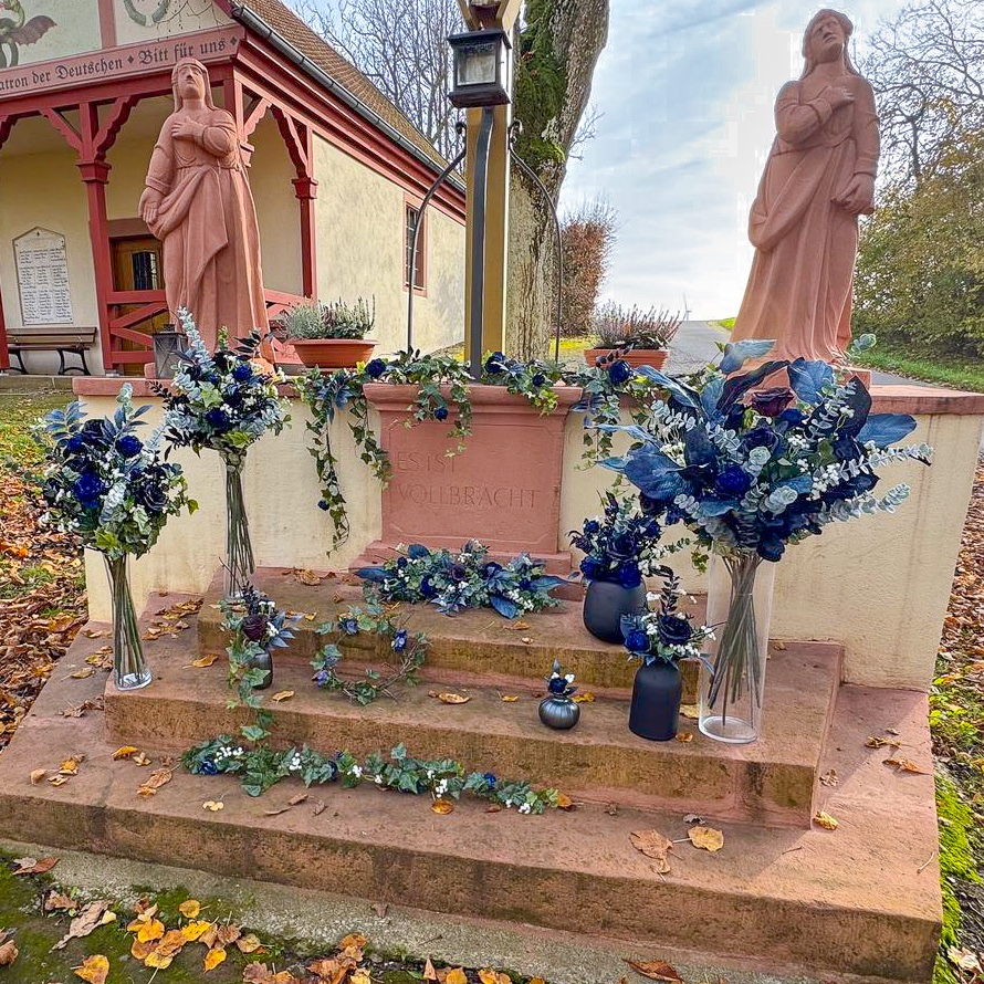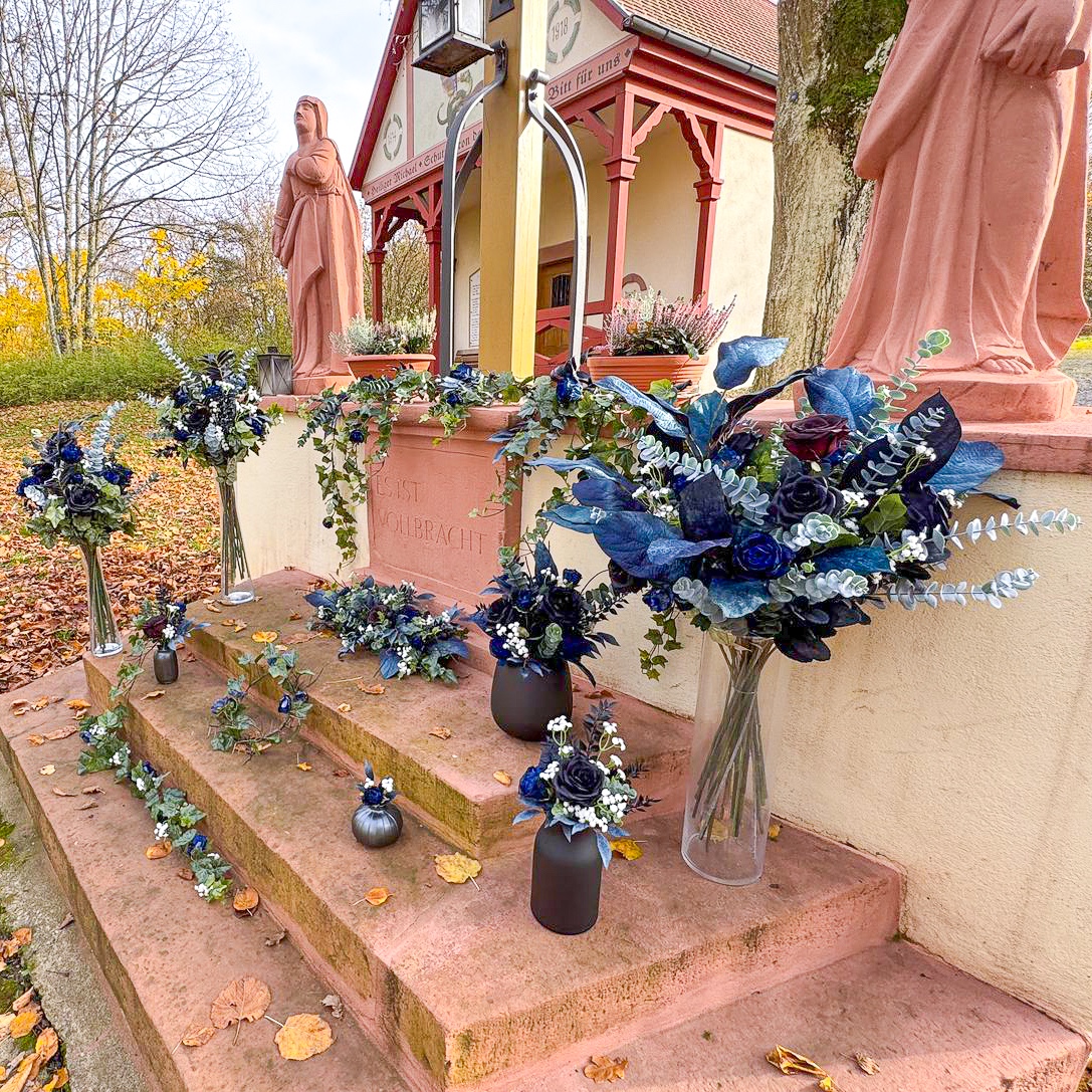When floral art meets timeless elegance! We had the privilege of designing all the floral arrangements for a dream wedding in the south of France on an idyllic peninsula. The celebration took place in mid-November – a time when elegance and depth in colour design are particularly effective. The client wanted a modern, elegant concept in black and dark blue, complemented by subtle white accents for a classic wedding look. All dark blue elements were given a velvety finish, which creates an elegant, warm effect, especially in the cooler months. Would you also like to celebrate your wedding with artificial flowers? Shop the look!