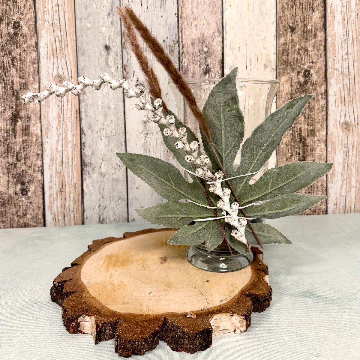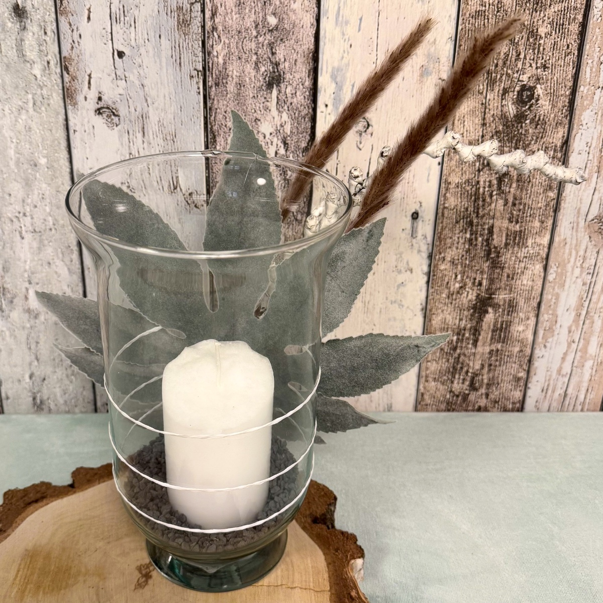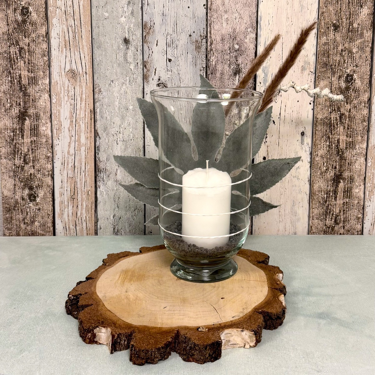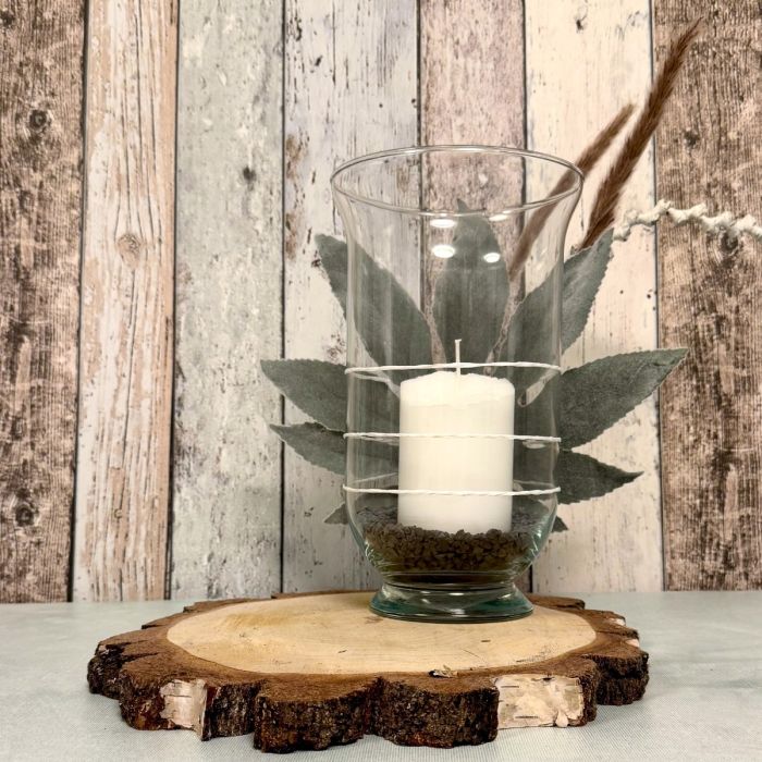 Earthy, authentic and simply beautiful! This lovingly arranged lantern brings a piece of nature into your home. A tall lantern glass stands on a round birch wood disc with a natural bark edge, filled with dark cork granules and a white candle that provides soft, warm light. Behind the glass is a velvety artificial aralia leaf, which lends the look a soft, harmonious depth. The ensemble is complemented by dried grasses, which are decoratively attached to the glass together with the leaf using white paper wire – a fine detail that conveys a sense of naturalness and craftsmanship. A small, natural eye-catcher that radiates calm and warmth! Shop the look!