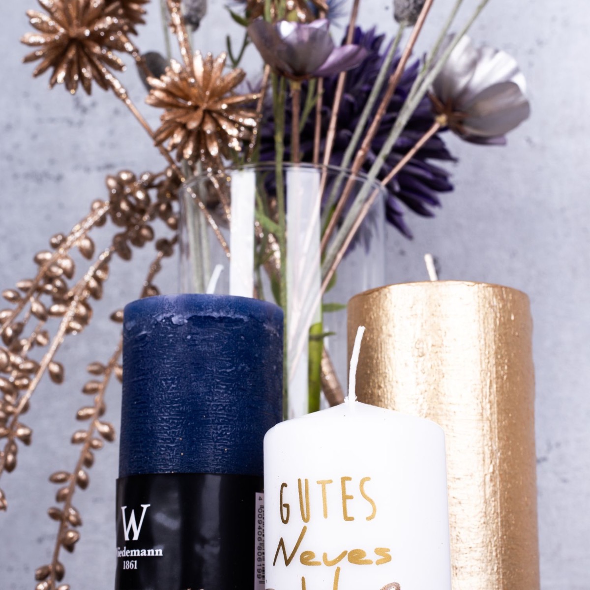 A firework display of gold and purple! A small bouquet of silver and gold flowers that is just high enough for you to be able to talk to the person opposite you makes the perfect table decoration for a New Year's Eve party. Various candles that match the colour of the bouquet are part of every good New Year's Eve party. Golden cornflowers and silvery-purple Christmas roses shimmer beautifully in the candlelight. That immediately creates a good mood. Shop the look!