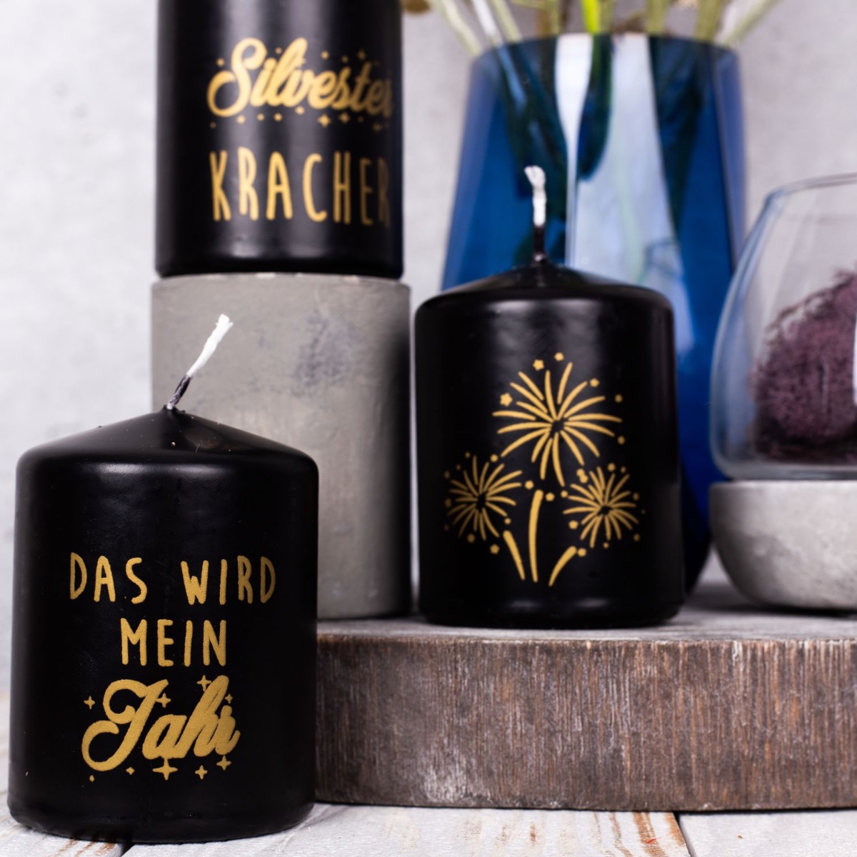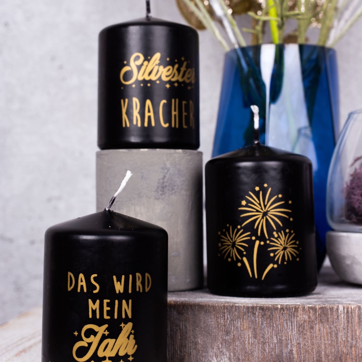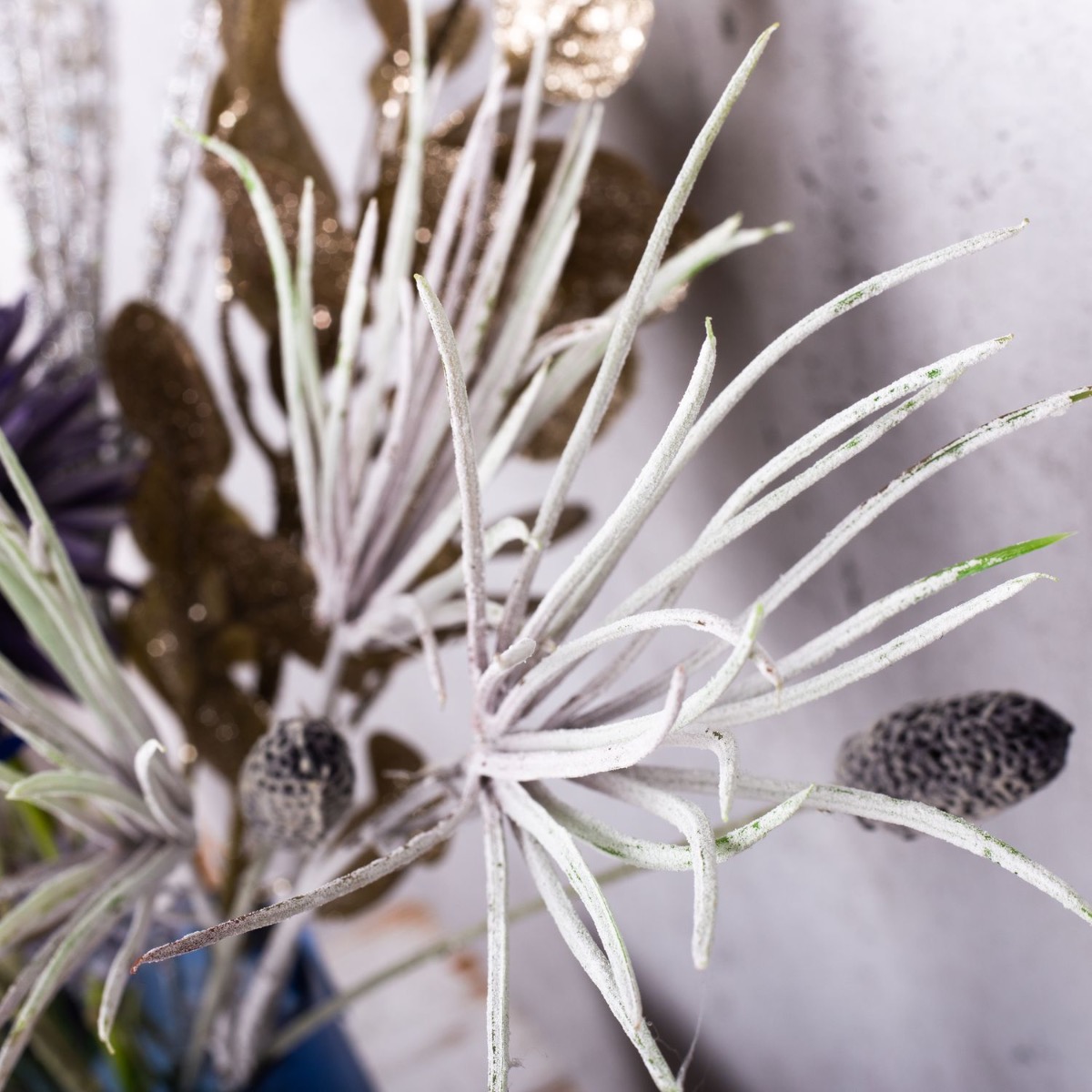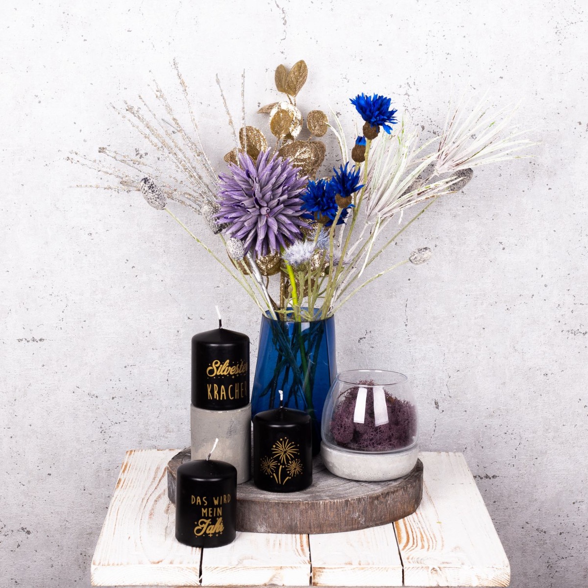 Purple and blue! An atypical colour combination that creates a fresh and colourful winter atmosphere. With the New Year's Eve candles, this look is perfect for a New Year's Eve party to end the year together. The small bouquet of blue cornflowers and a lilac-coloured ornamental leek already looks like a small firework, which is underlined by frosted pine branches and the glittering pine branch. We filled the candle glass with a concrete base with natural moss in a matching colour. Let the party begin. Shop the look!