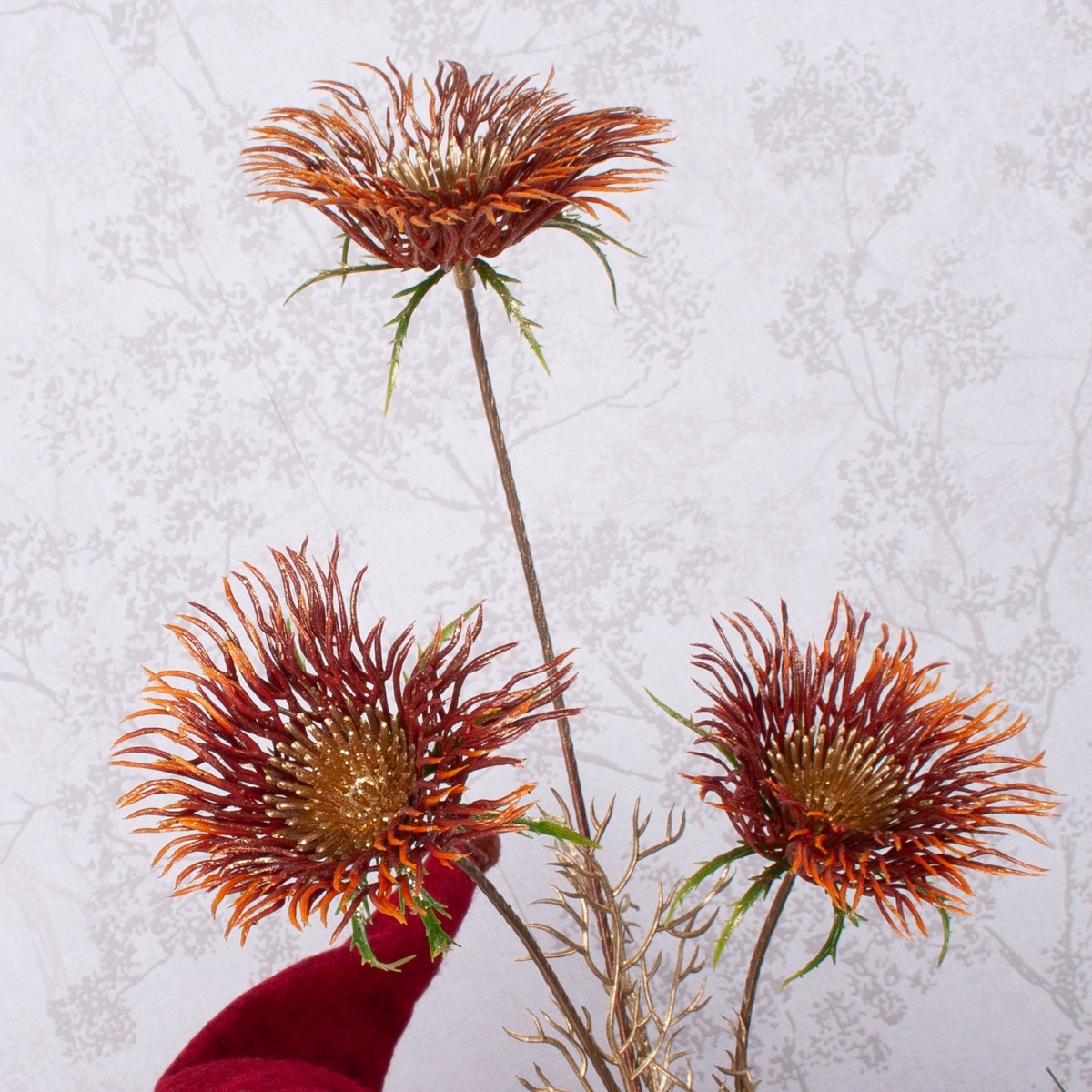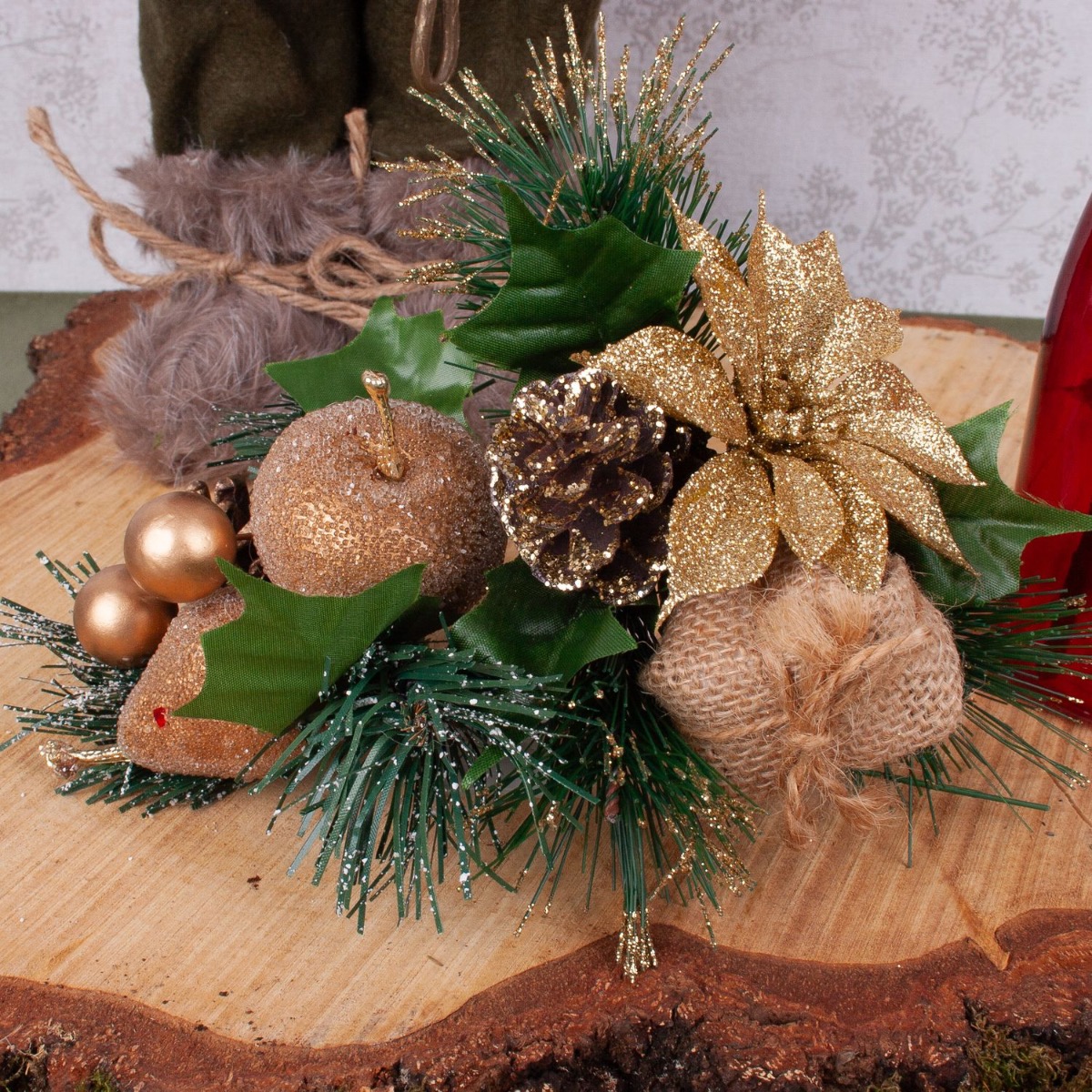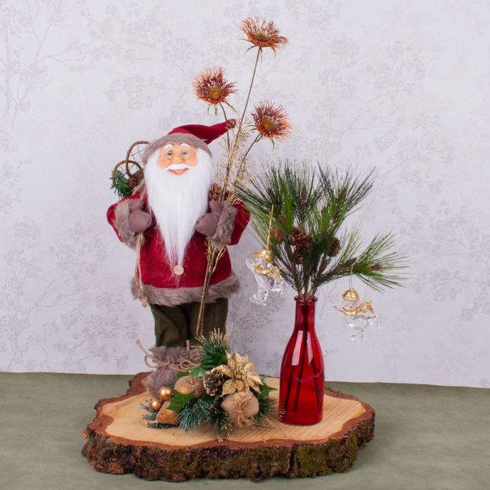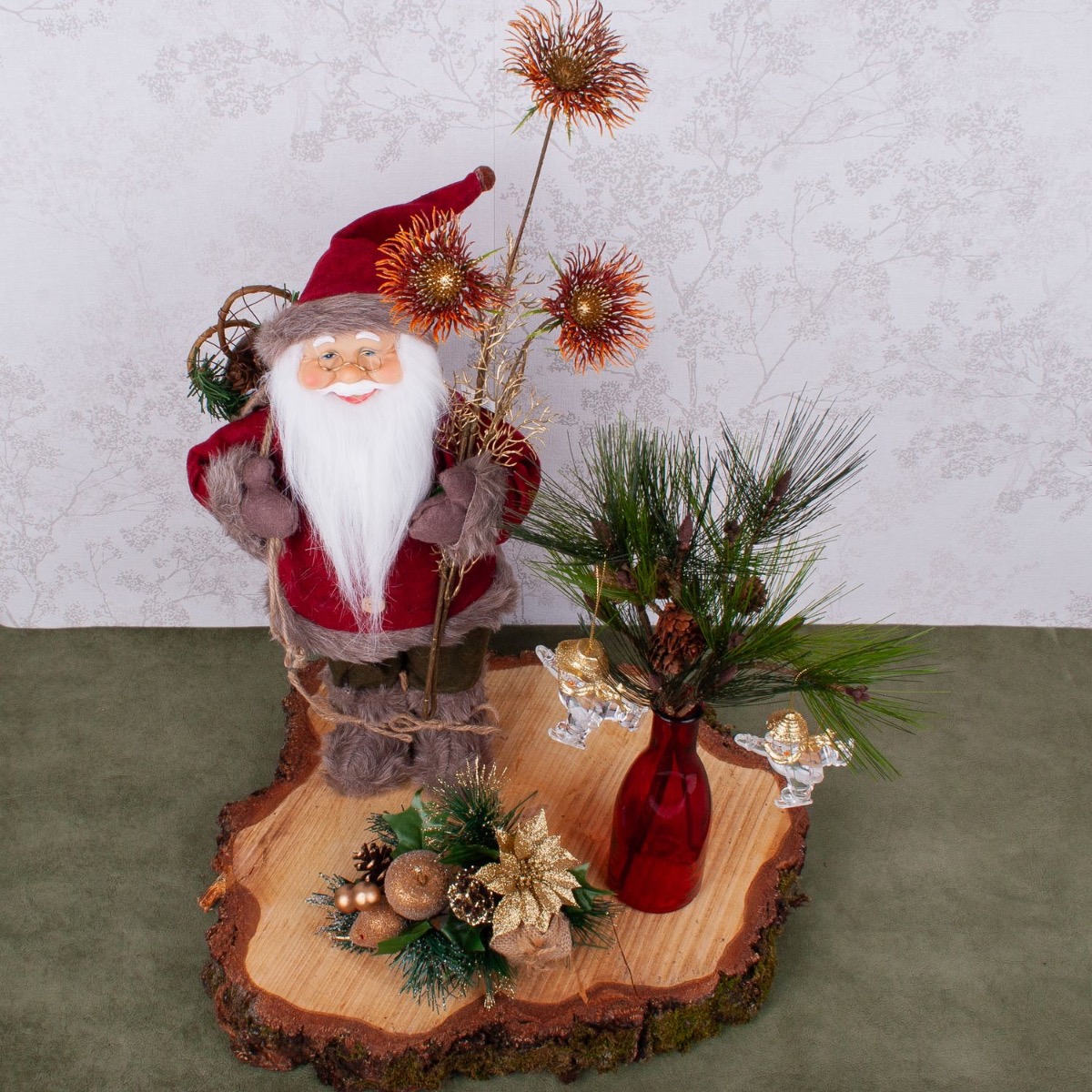 Design tip: The red zinnia is placed in Santa's hand. Place the pine branch in the vase and attach the Christmas tree ornaments to it. Arrange everything on the tree disc.