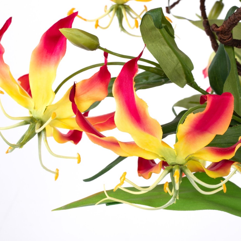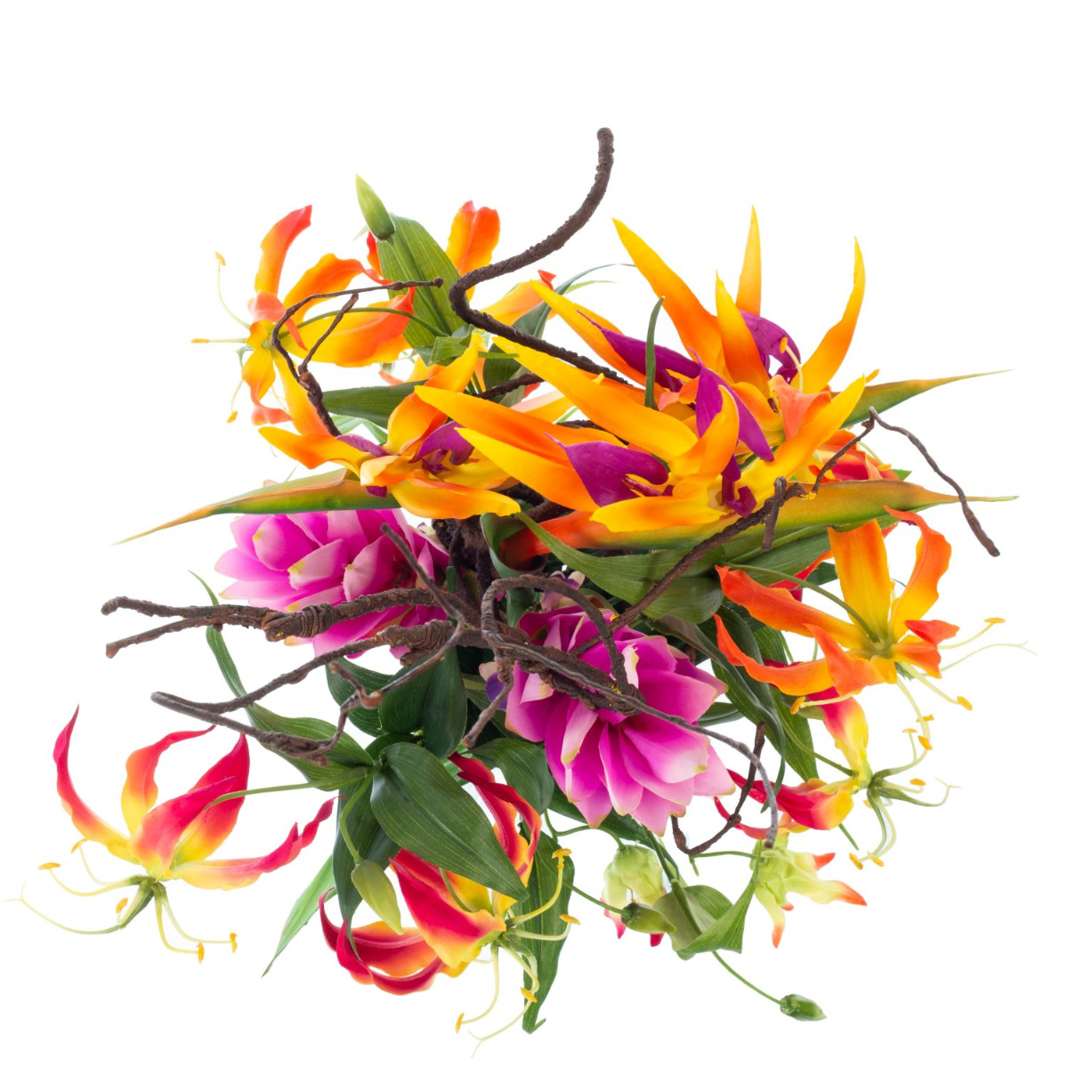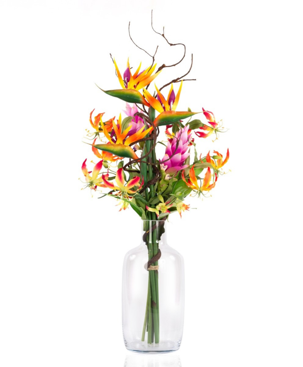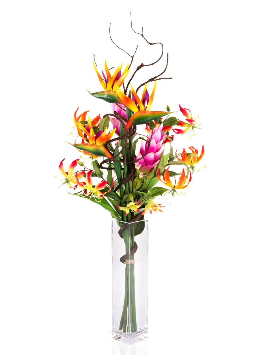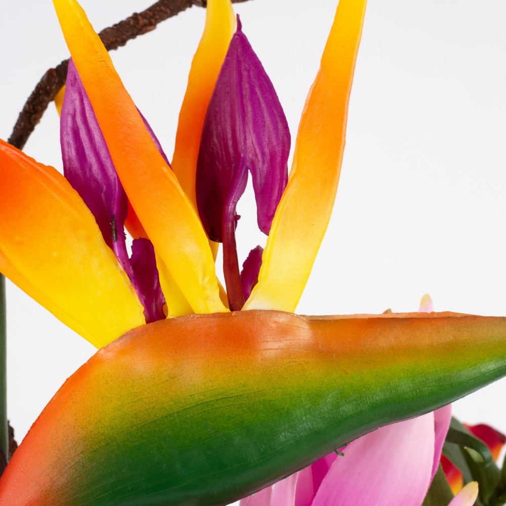 - Composed of 3 strelitzias in colour orange-violet (dimensions approx. 7"x6"/19 x 15 cm), 2 gloriosas in colour pink-yellow and 2 in colour orange-yellow (ø approx. 6"/15 cm), 2 curcuma flowers in colour purple, 1 in colour pink (ø approx. 3.5"/9 cm) and a brown corkscrew branch