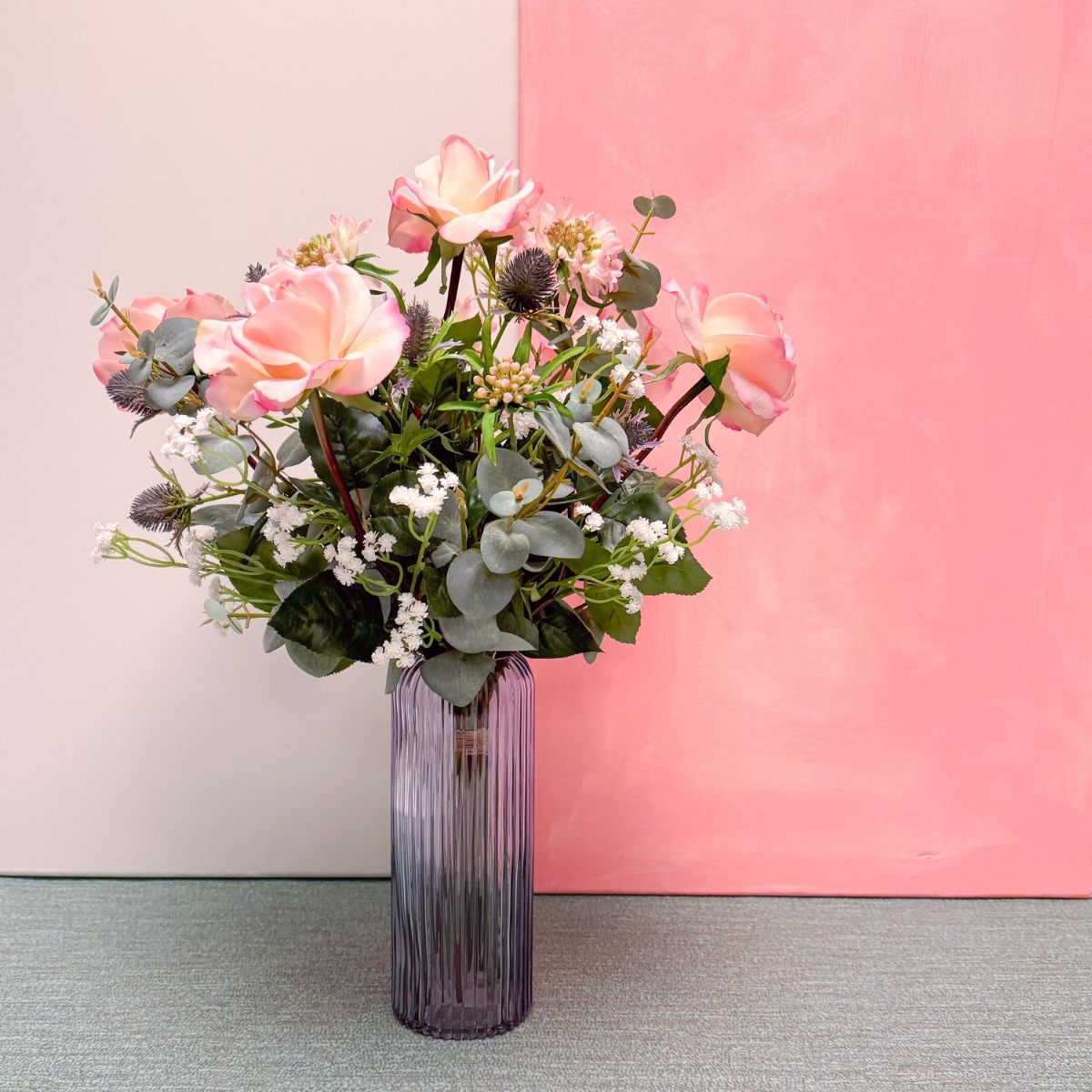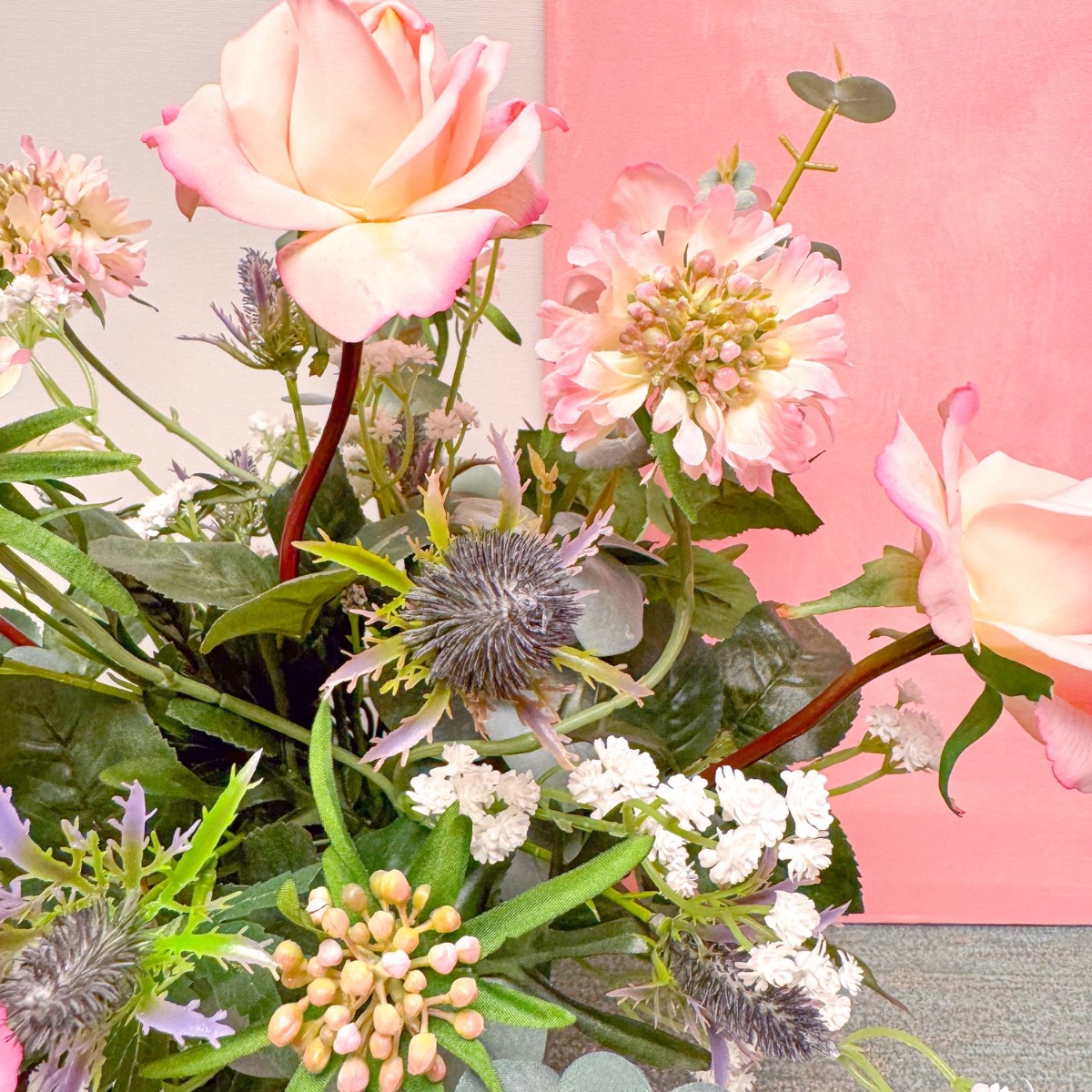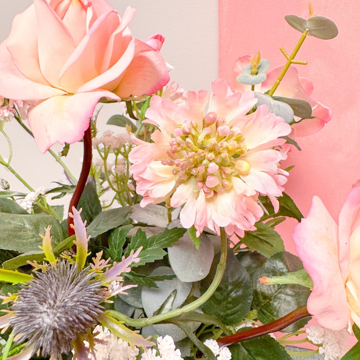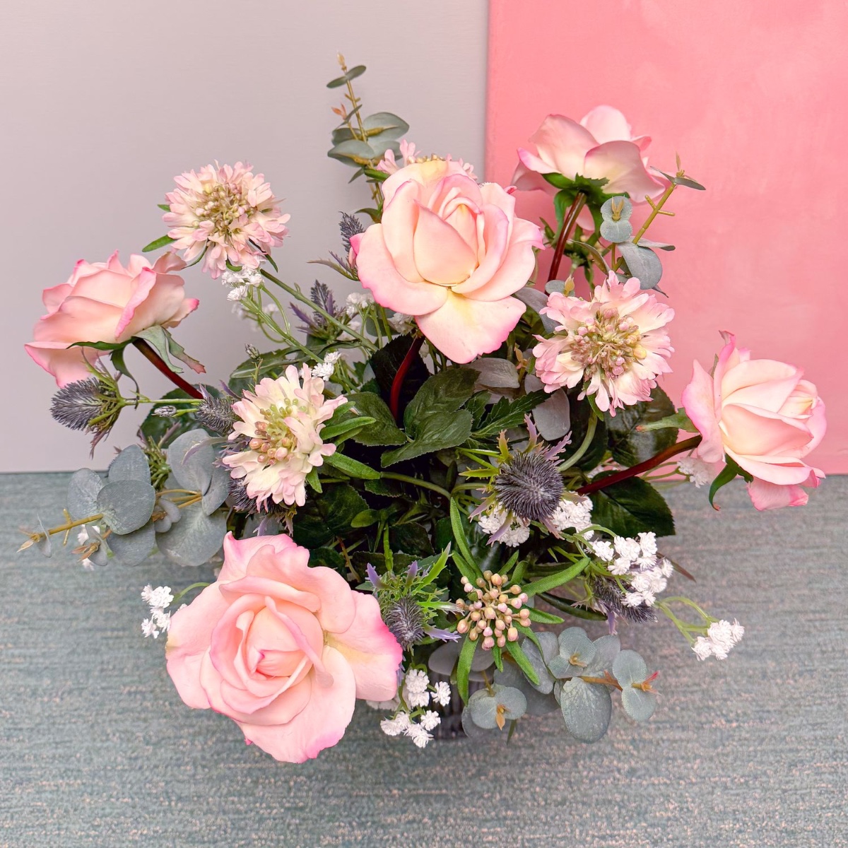 Enchanting bouquet of flowers! We received a second request from Hanan. She wanted a romantic bouquet of roses, as the real ones were already starting to wilt. She liked it so much that she asked us to recreate the bouquet. Lushly opened roses with delicate scabiosa and prickly thistles were the main features here, arranged between delicate gypsophila and eucalyptus branches. A beautiful, airy bouquet that gives each individual flower its own space. Shop the look!