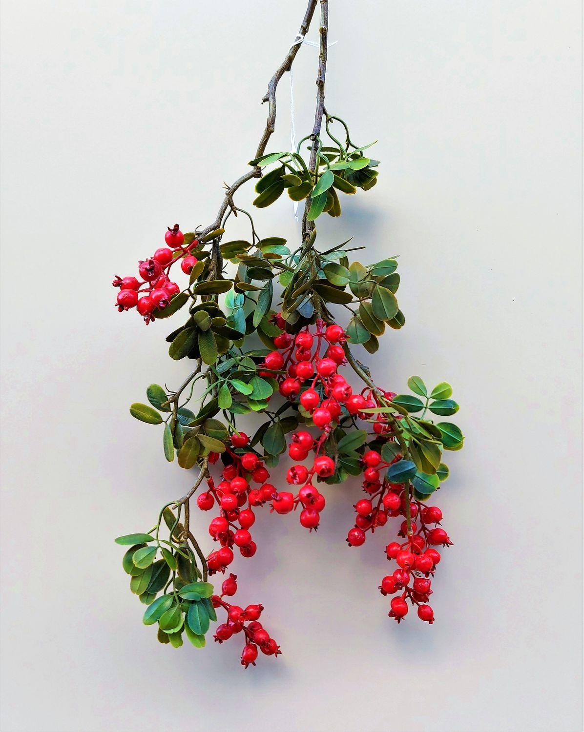 The fake rosehip branch WARUNA will create a striking eye-catcher in a narrow vase on the windowsill, on the sideboard or in the shop window, for example.