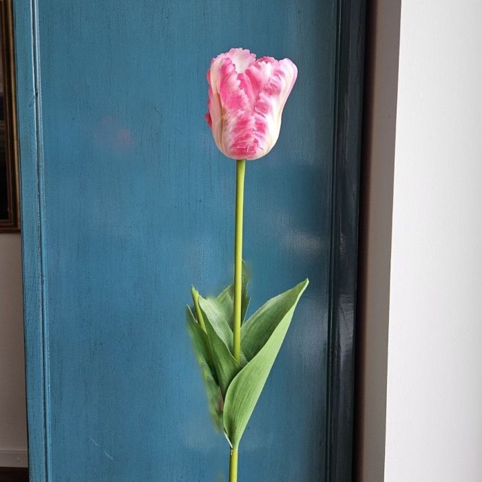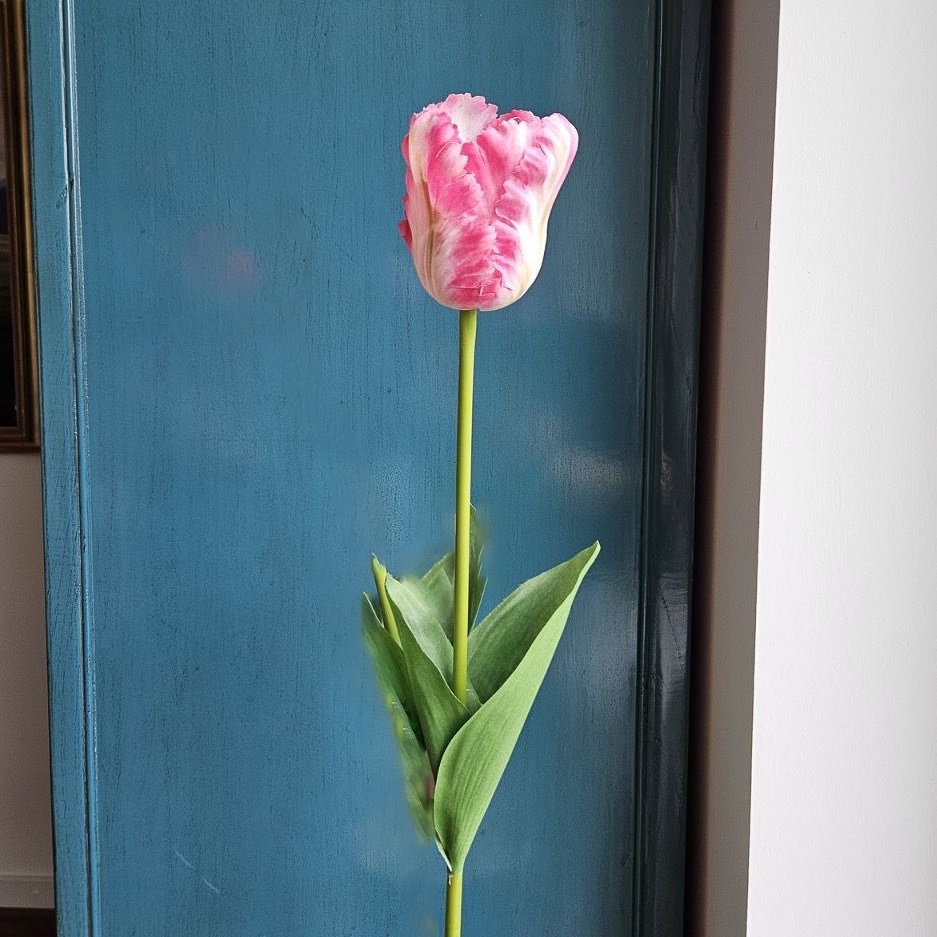 - The natural-feeling petals have the wavy edge typical of a parrot tulip and are characterised by a special surface (real touch), the stem is covered with large leaves