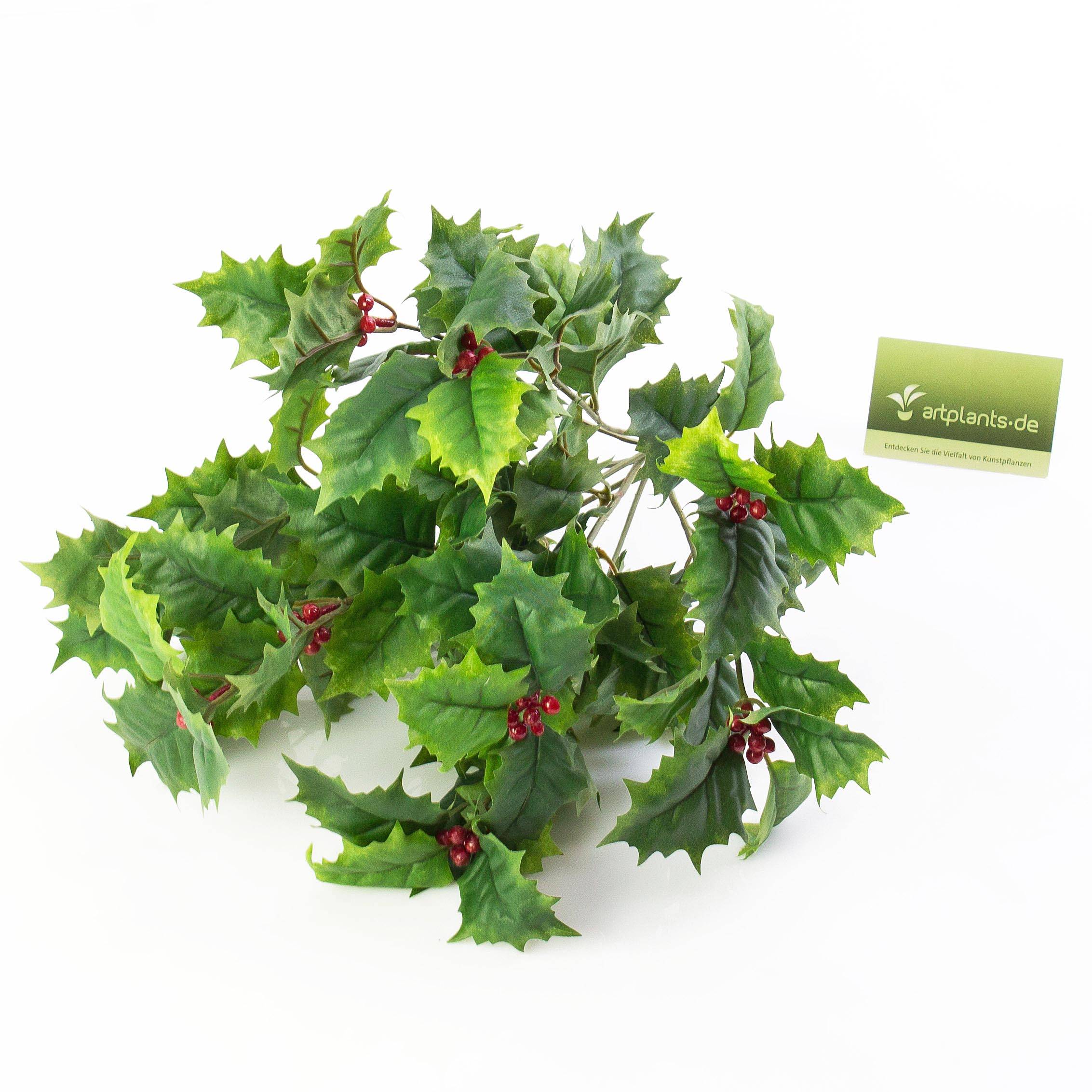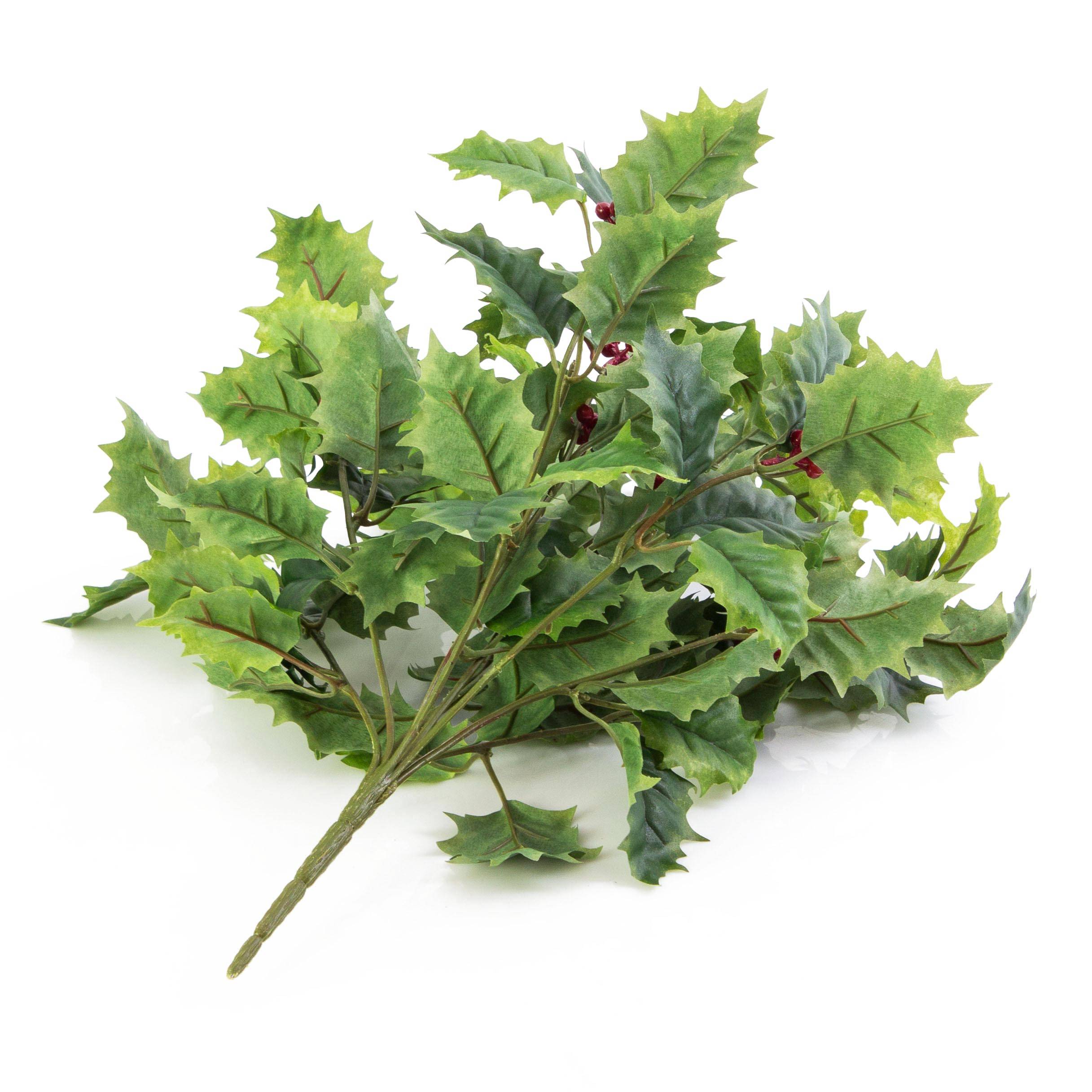 Artificial holly bush IDRIS with 90 green serrated leaves spread over 9 branches. The 18"/45 cm high spray consists of many red berries and is particularly suitable for the autumn and winter decoration at your home.