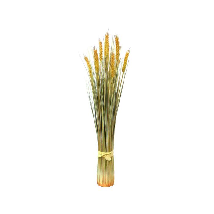 The artificial wheat sheaf with blades and ears in various heights has a total height of approx. 24"/60 cm. It is held together with bast and therefore stands by itself.