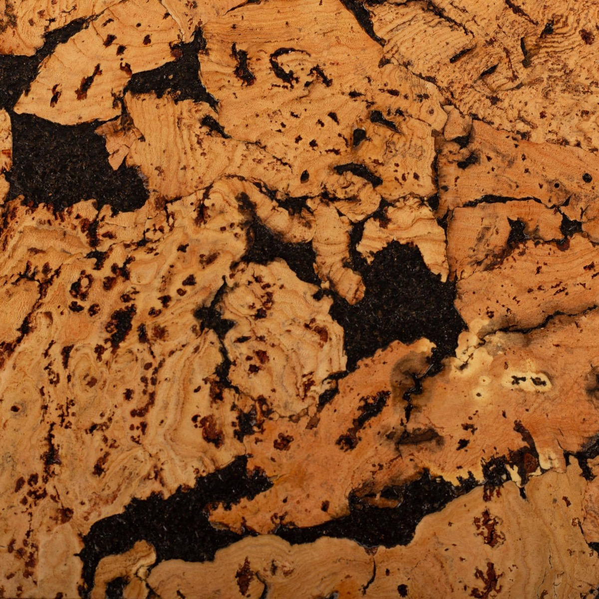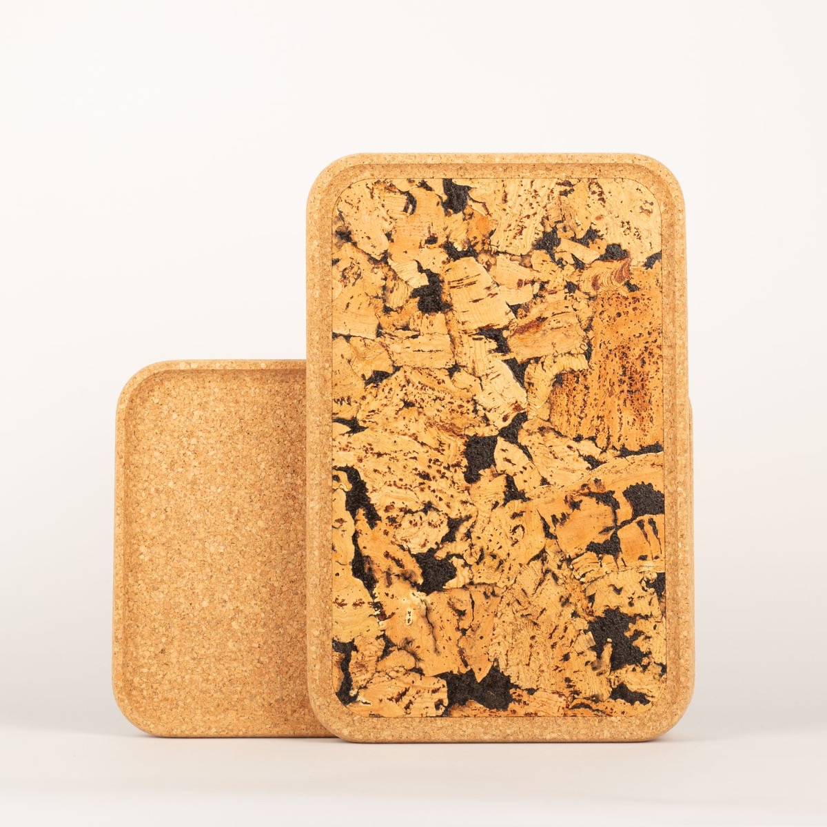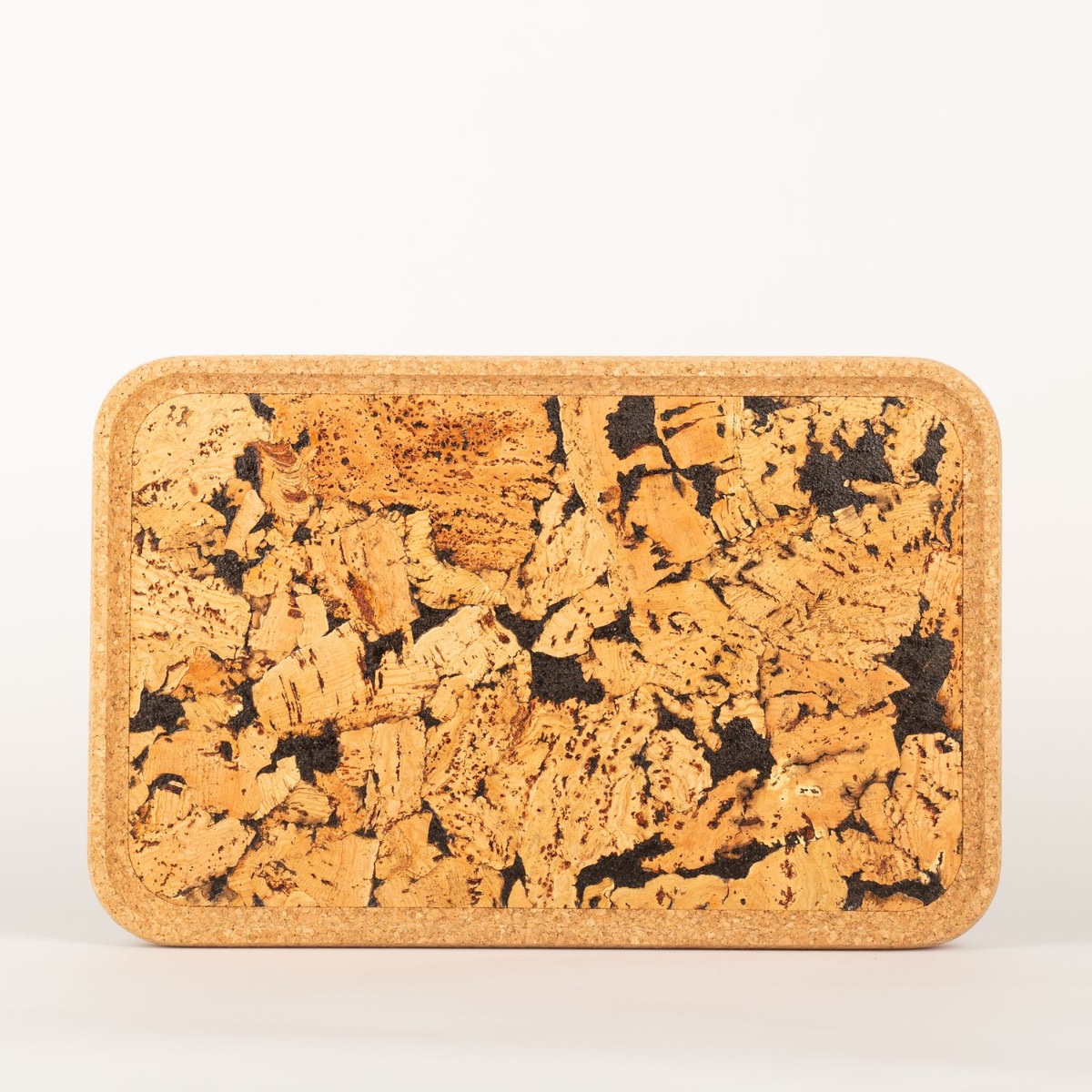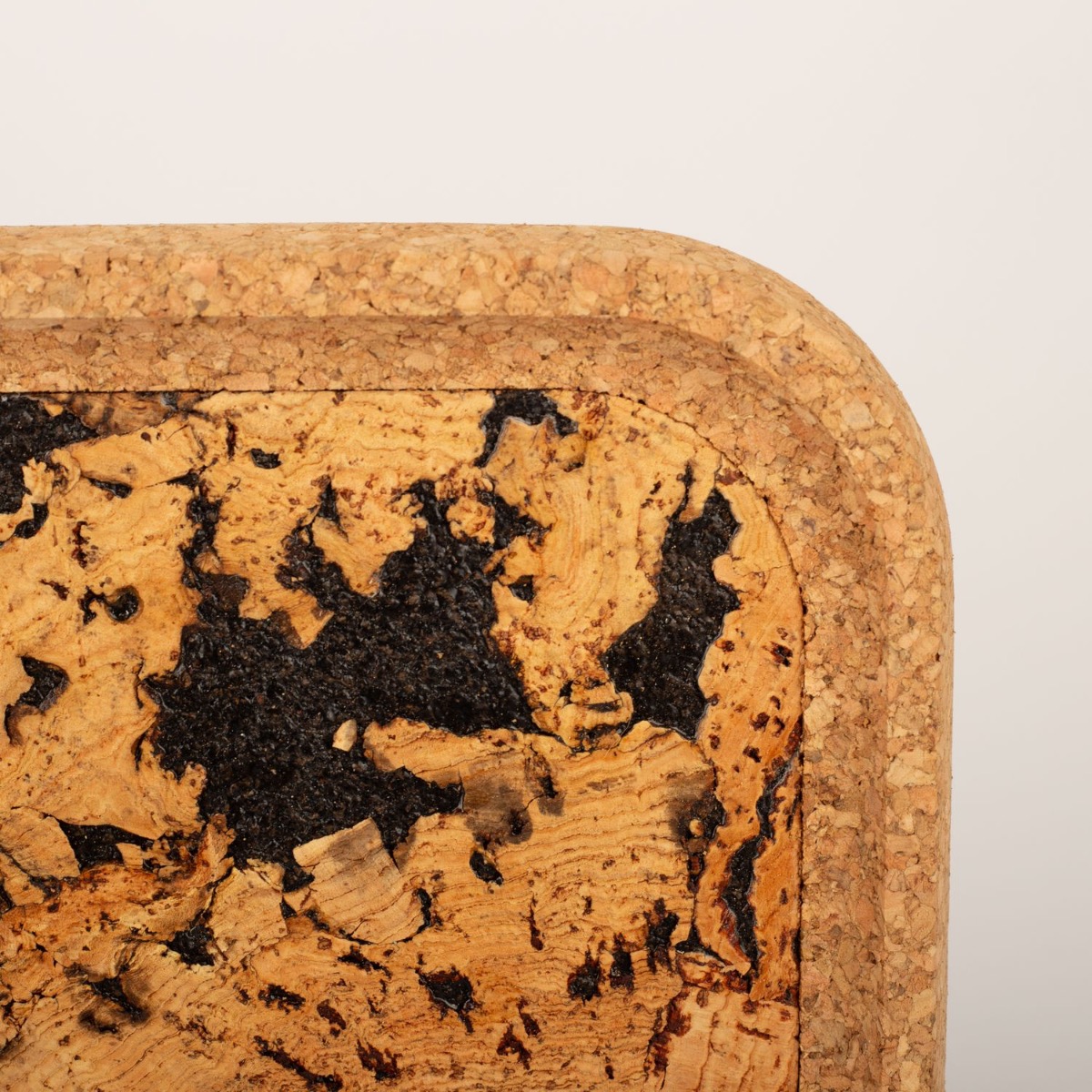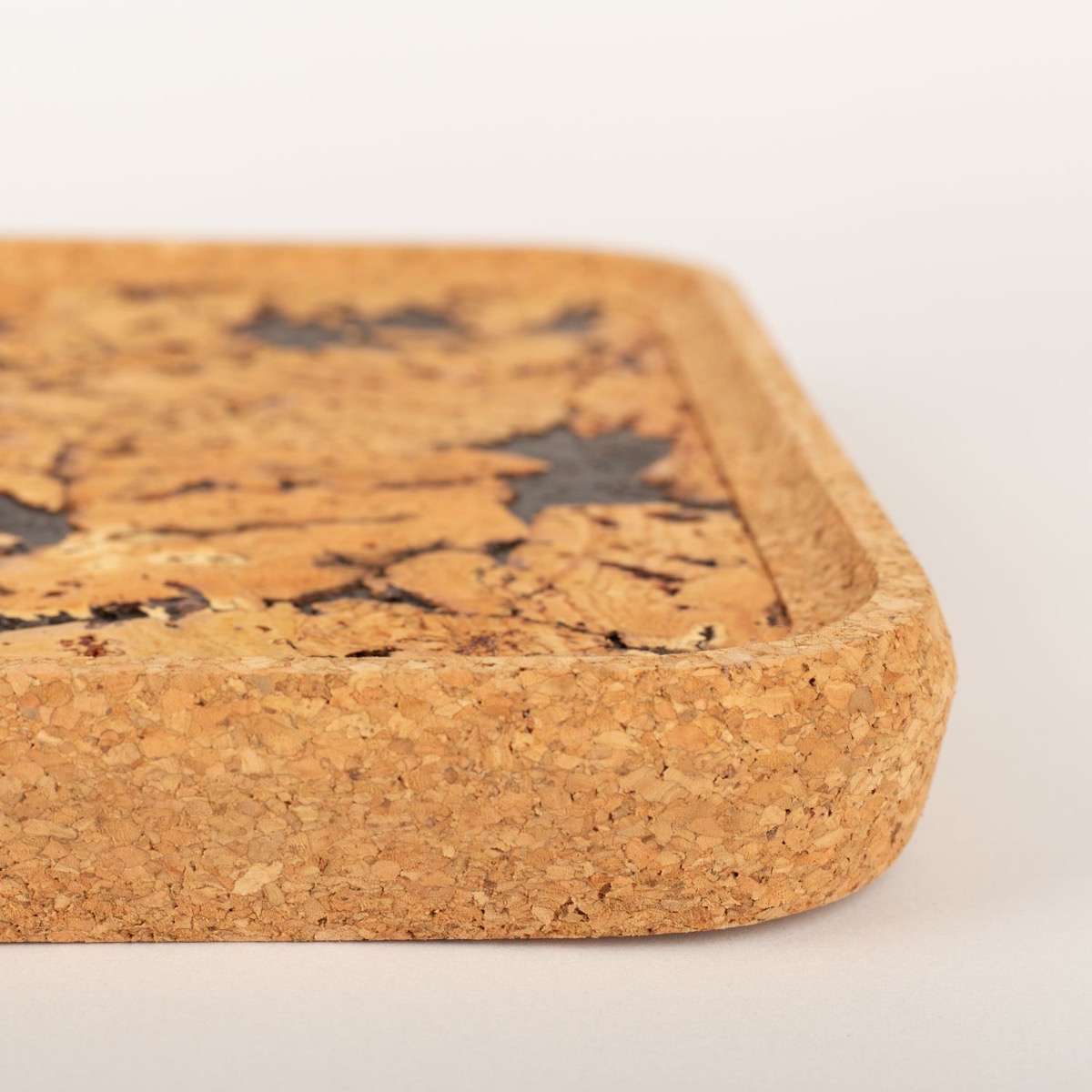 - In natural-black colour made of agglomerated cork, serving surface manufactured from large decorative cork pieces, a binder is added to the sorted cork granulate to form the agglomerated cork, the binder - a food-grade adhesive - acts as a natural binder and ensures that the cork particles adhere to each other while retaining their unique properties
