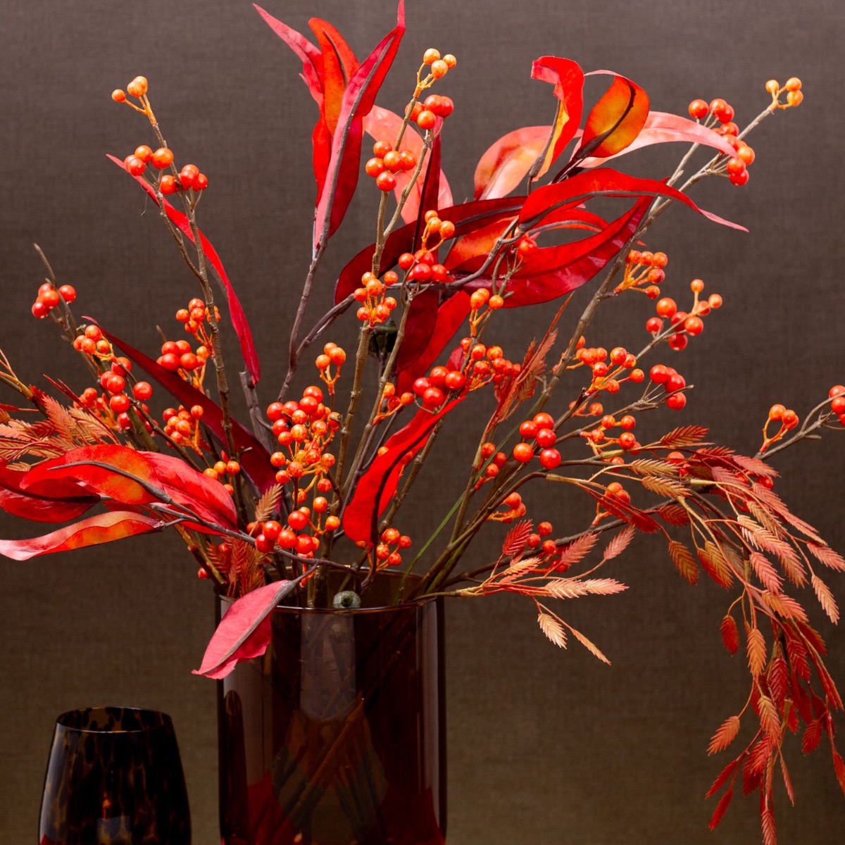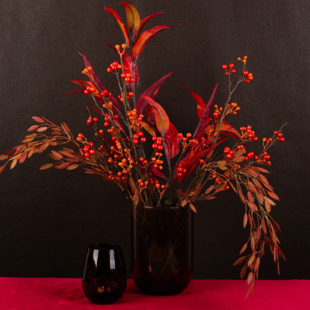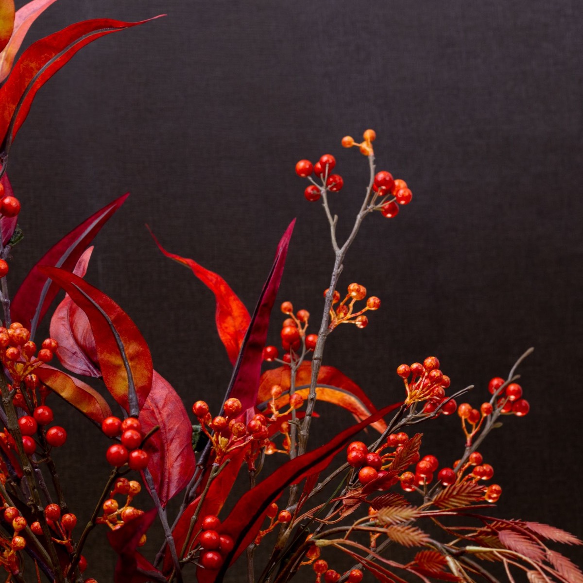 Red, the colour of fire and love! Autumn simply brings out magical colours. We are particularly fascinated by the red colour that stands out between the lifeless leaves at this time of year. Berry twigs, eucalyptus leaves and the reddish-coloured Chasmanthium latifolium look like a fire that has been lit in the dull and cool season. It brings warmth to any place! Shop the look!