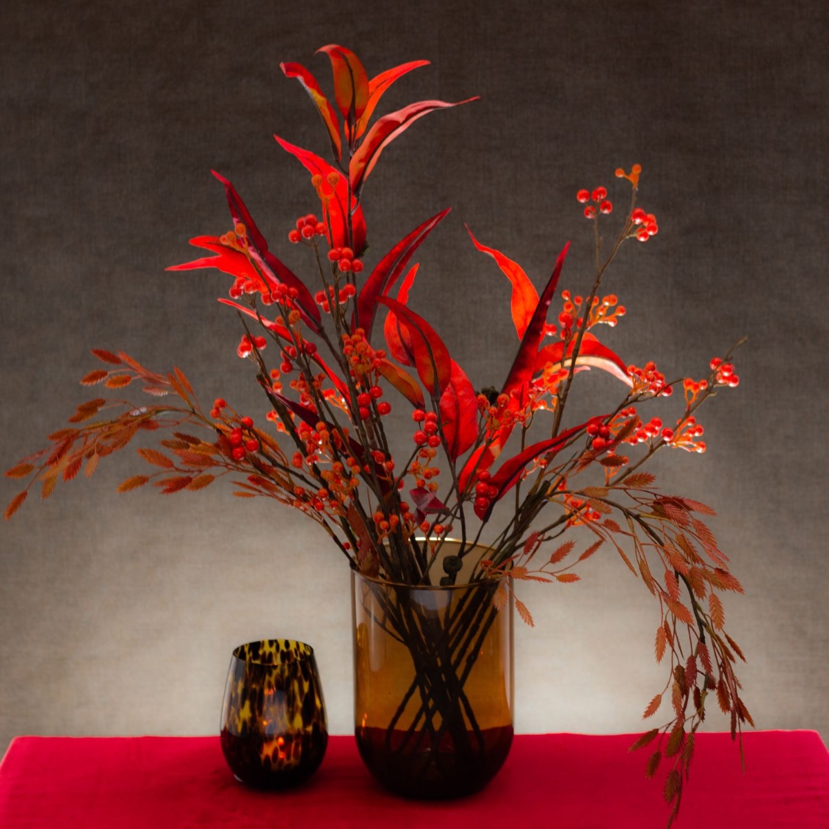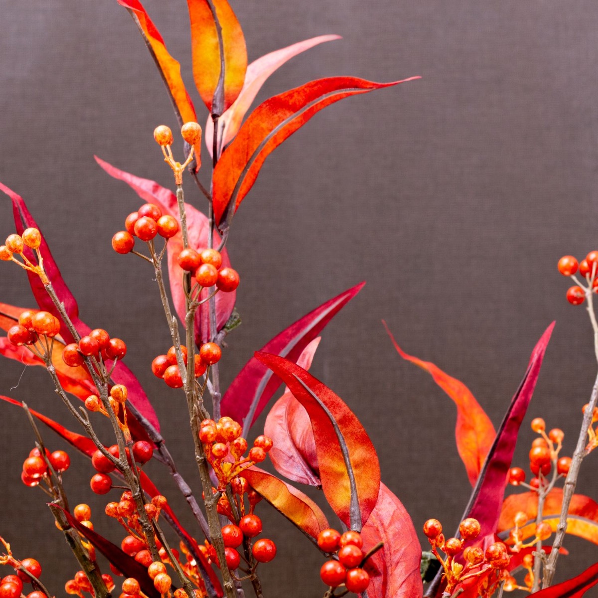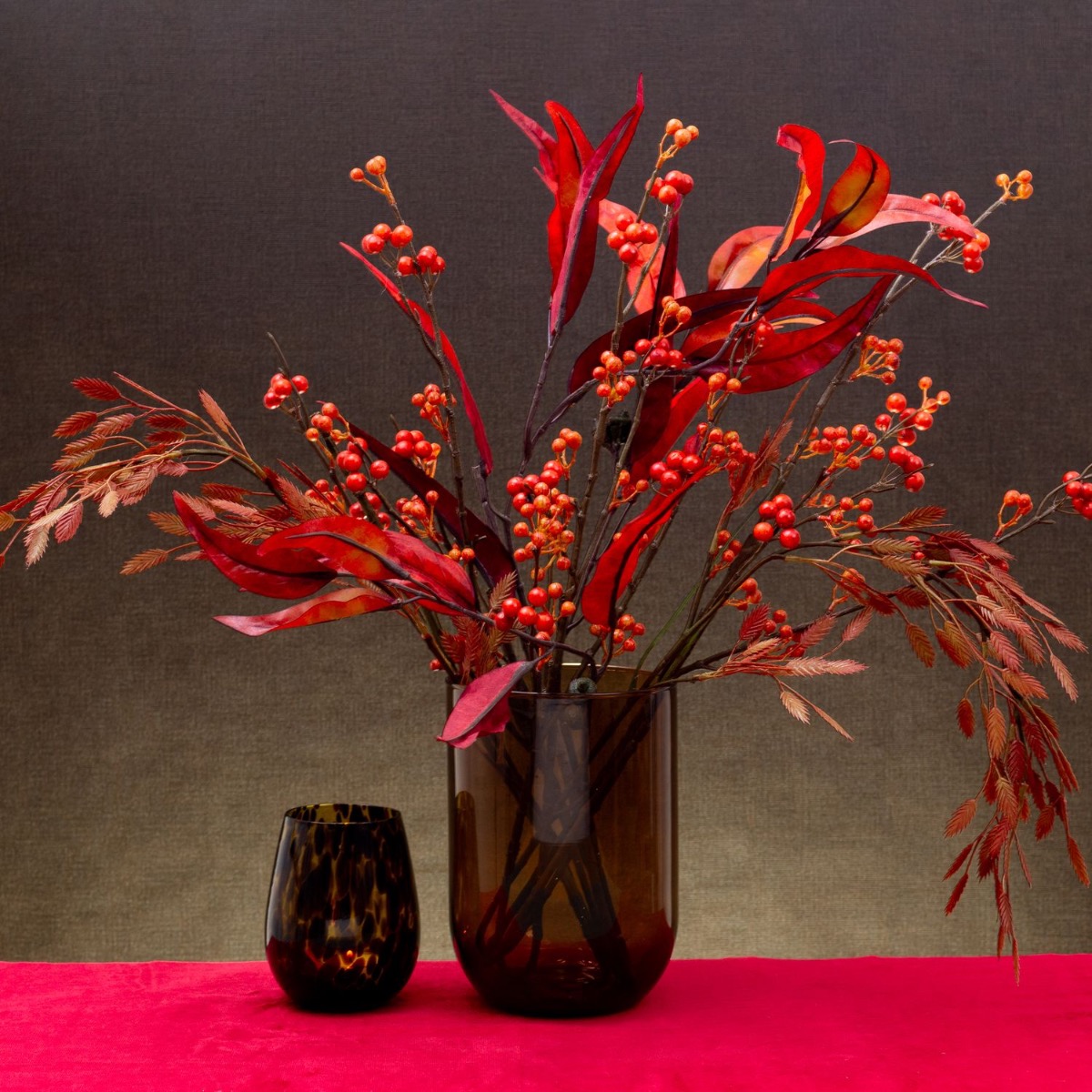 Red, the colour of fire and love! Autumn simply brings out magical colours. We are particularly fascinated by the red colour that stands out between the lifeless leaves at this time of year. Berry twigs, eucalyptus leaves and the reddish-coloured Chasmanthium latifolium look like a fire that has been lit in the dull and cool season. It brings warmth to any place! Shop the look!
