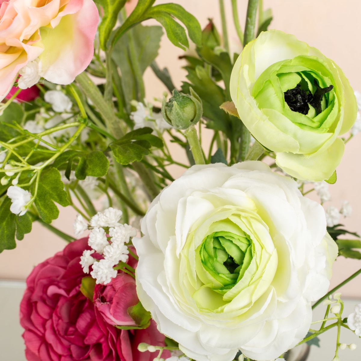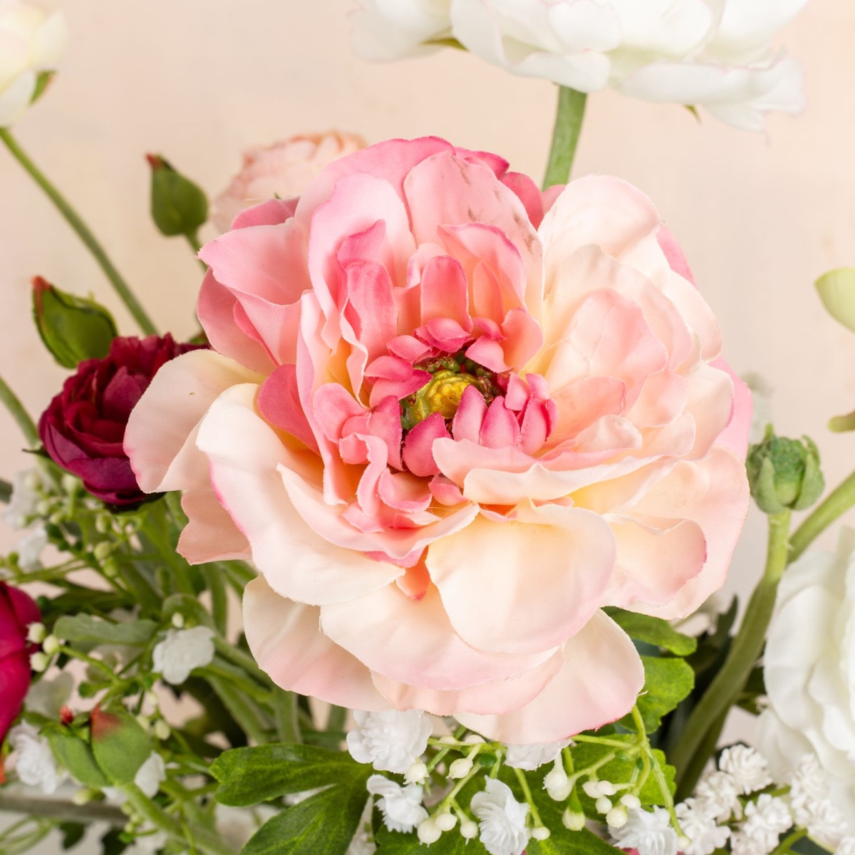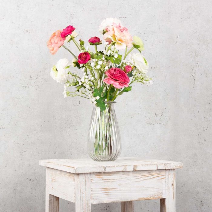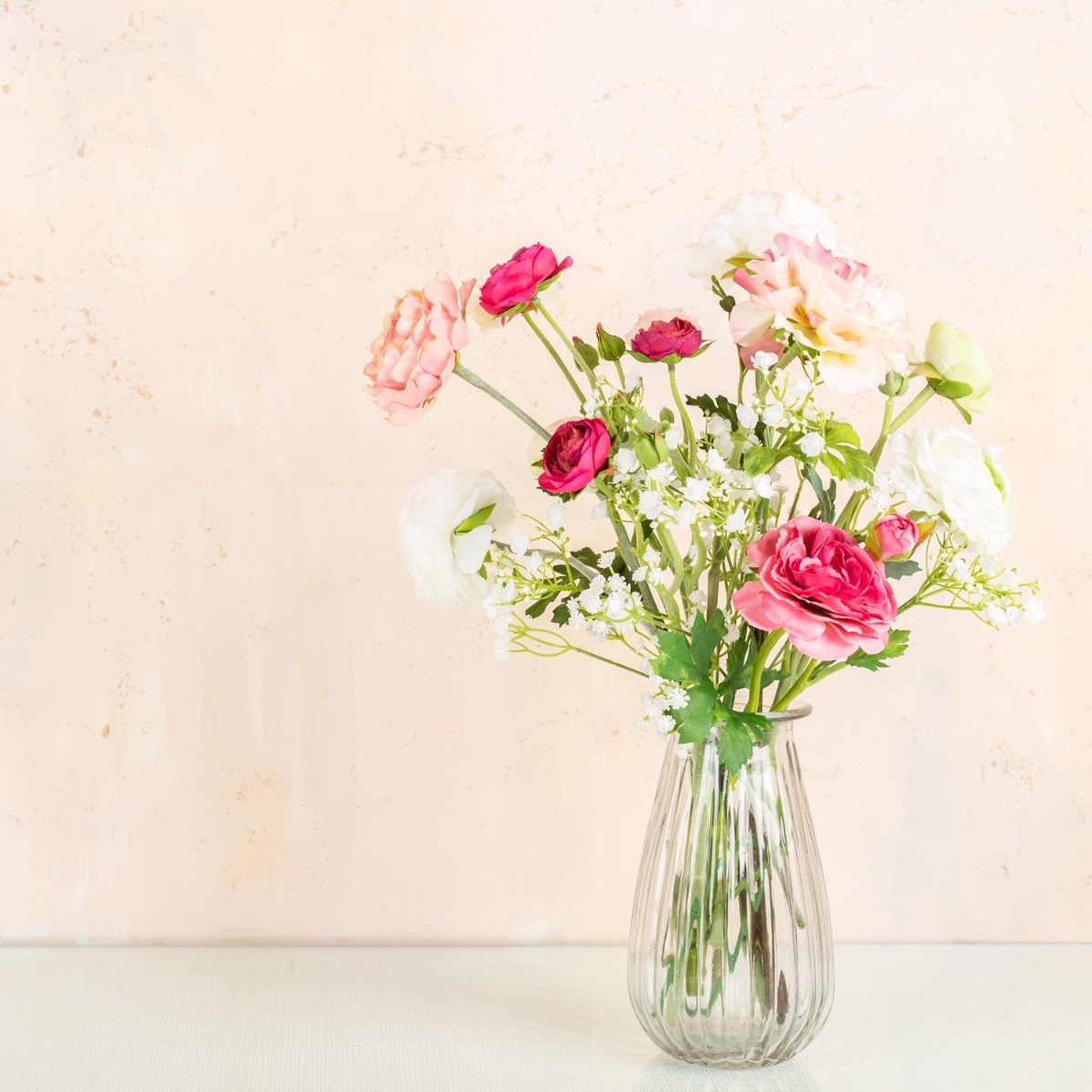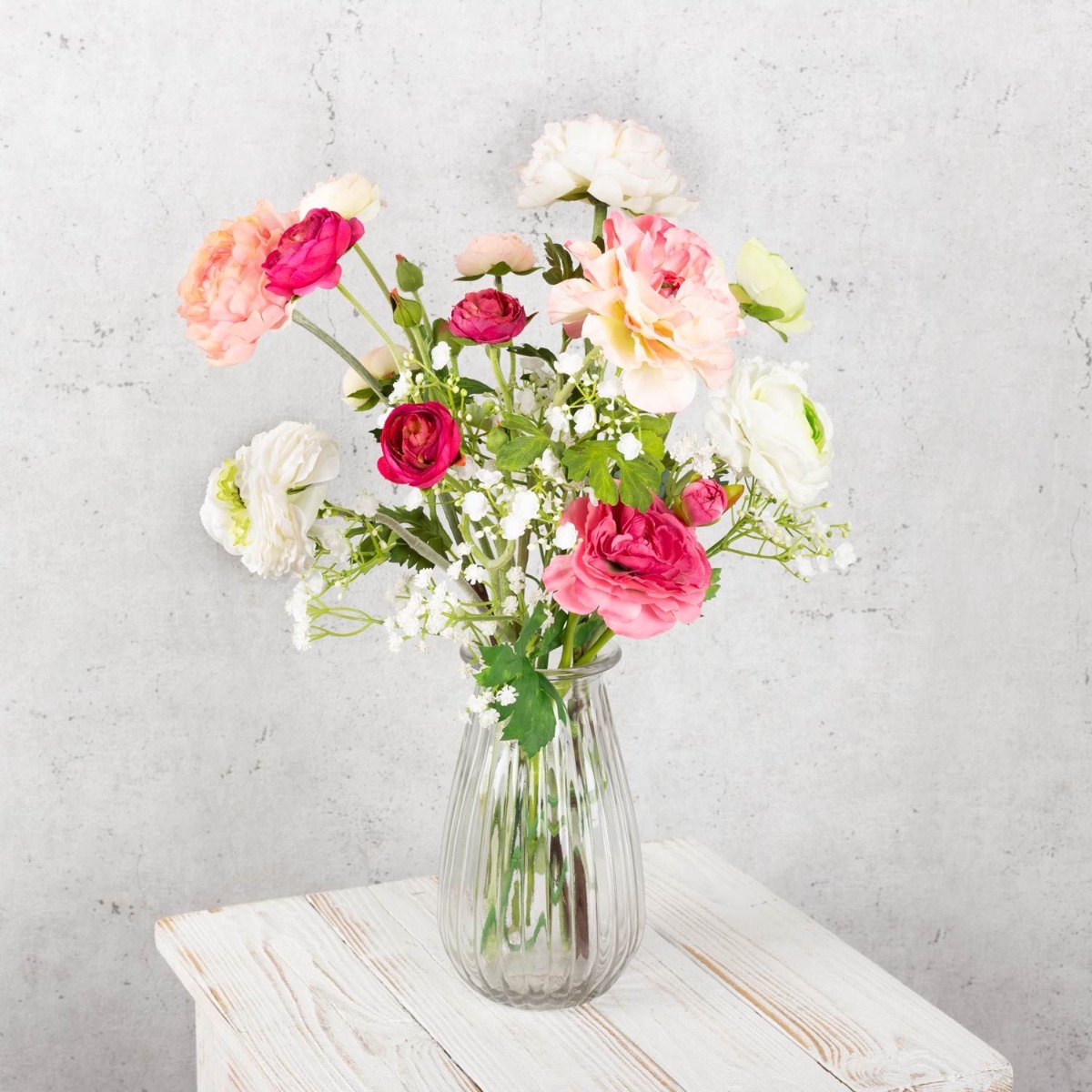 Pink and white! A colour combination that promises romance and harmony. The different sized ranunculus, combined with a delicate gypsophila, look simply magical. A bouquet of ranunculus represents beauty and the uniqueness of a person. A beautiful gift for an extraordinary person! Shop the Look!