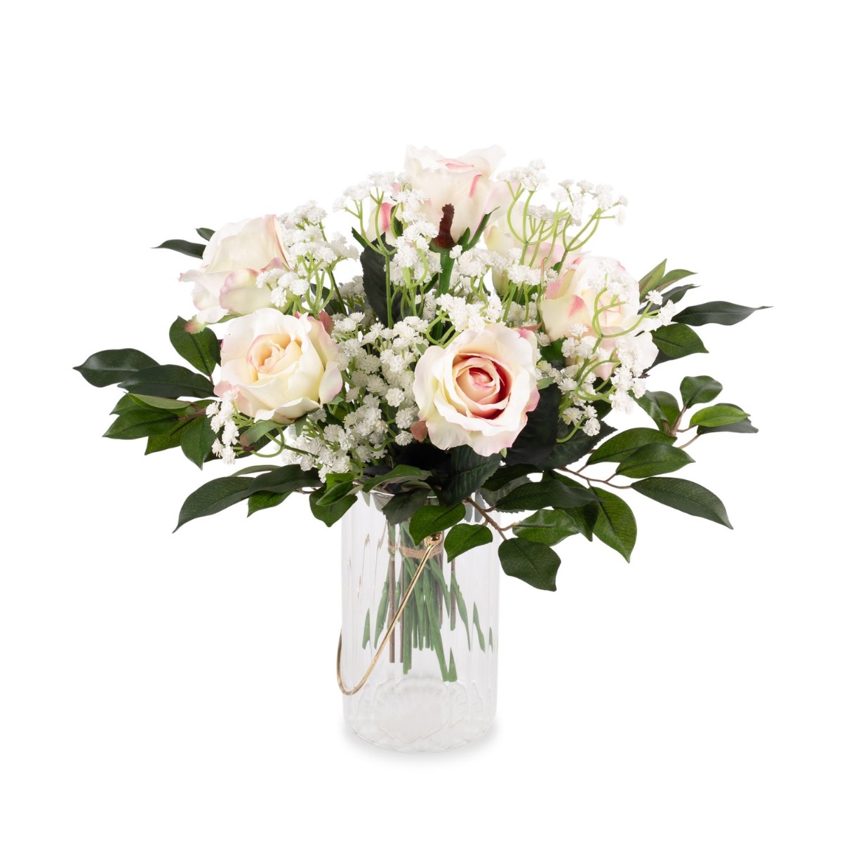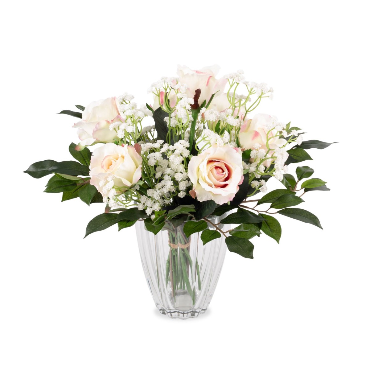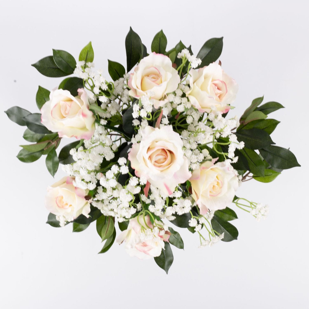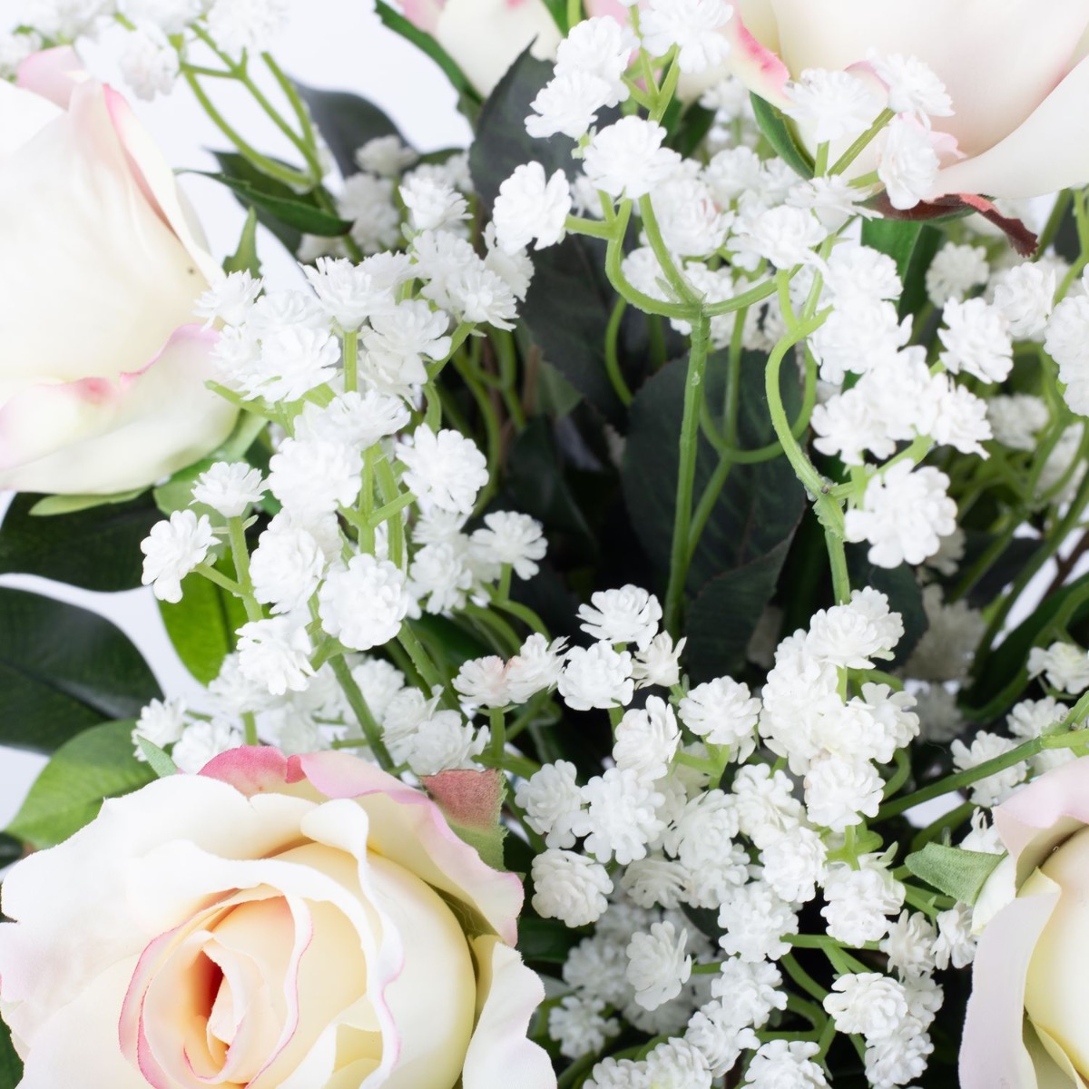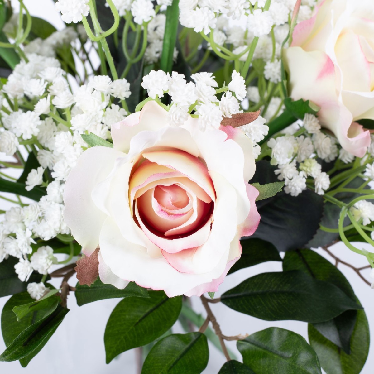 - Comprised of 7 light pink-white roses crafted from textile material (ø approx. 2.4"/6 cm), 4 white gypsophila branches (synthetic) and 2 dark green beech branches made of textile material