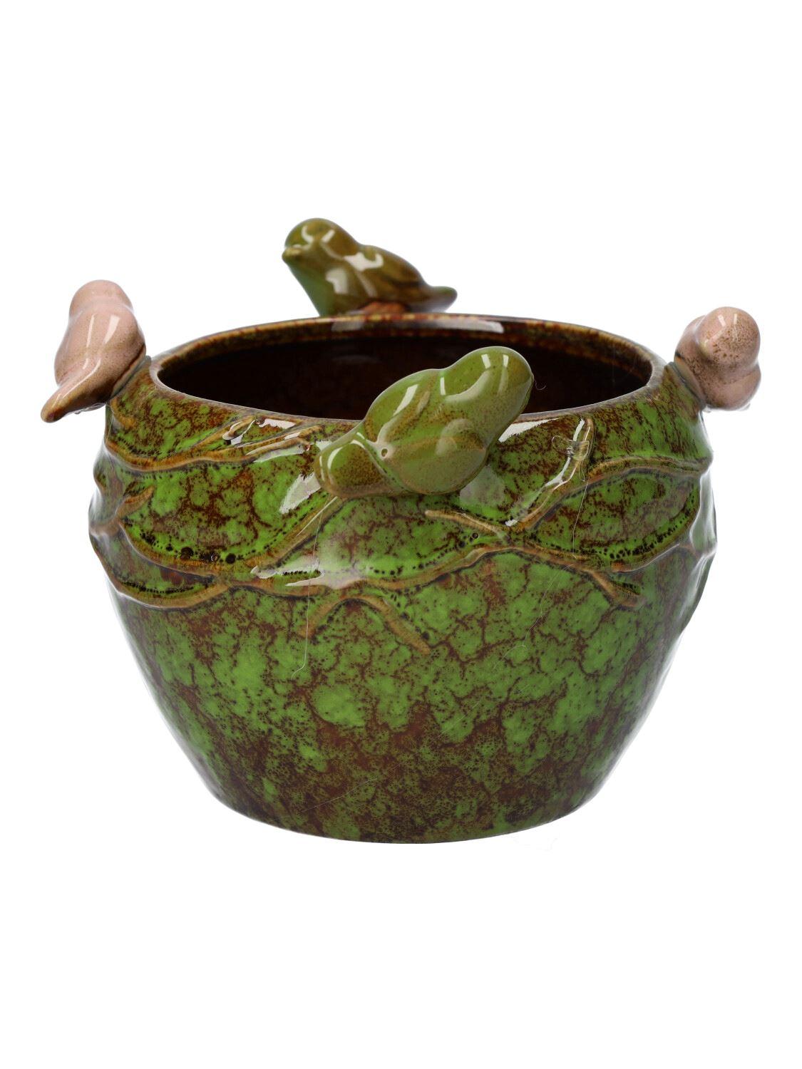 Round plant pot SARINO made of ceramic, with 3D birds, green-brown-beige, 4.1"/10,5cm, Ø5.5"/14cm