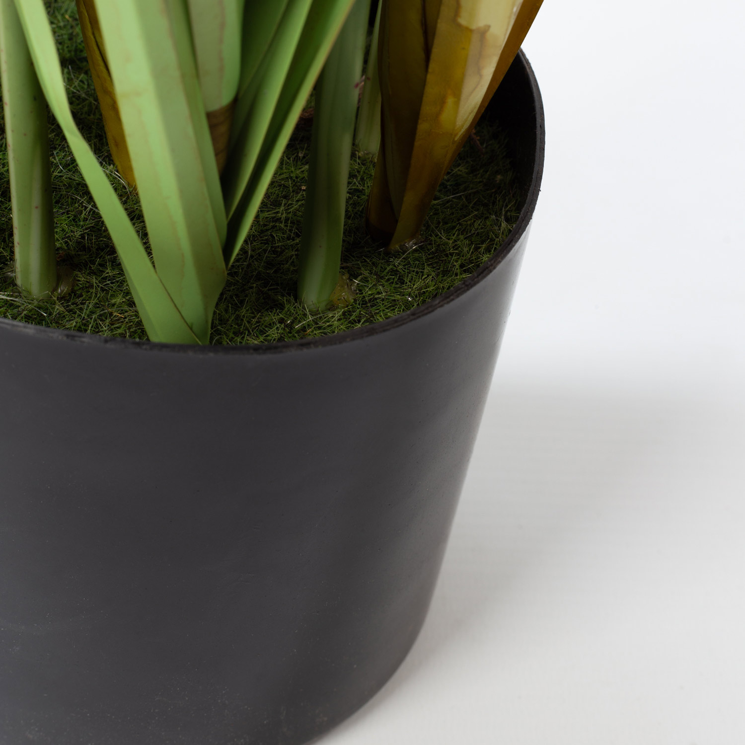 - comes in a black decorative pot of plastic which is weighted with cement, everything is firmly connected, surface is covered with pebbles