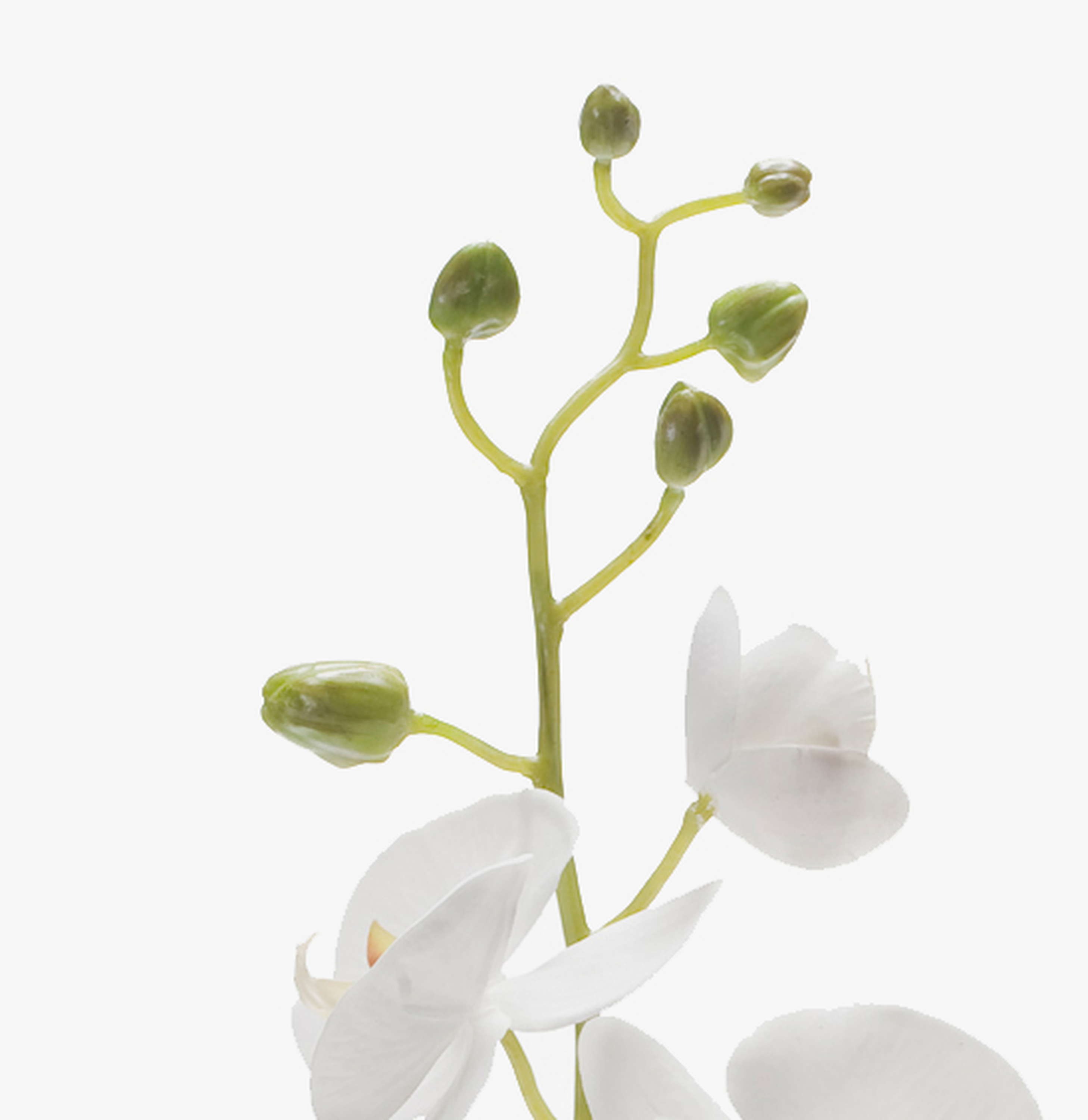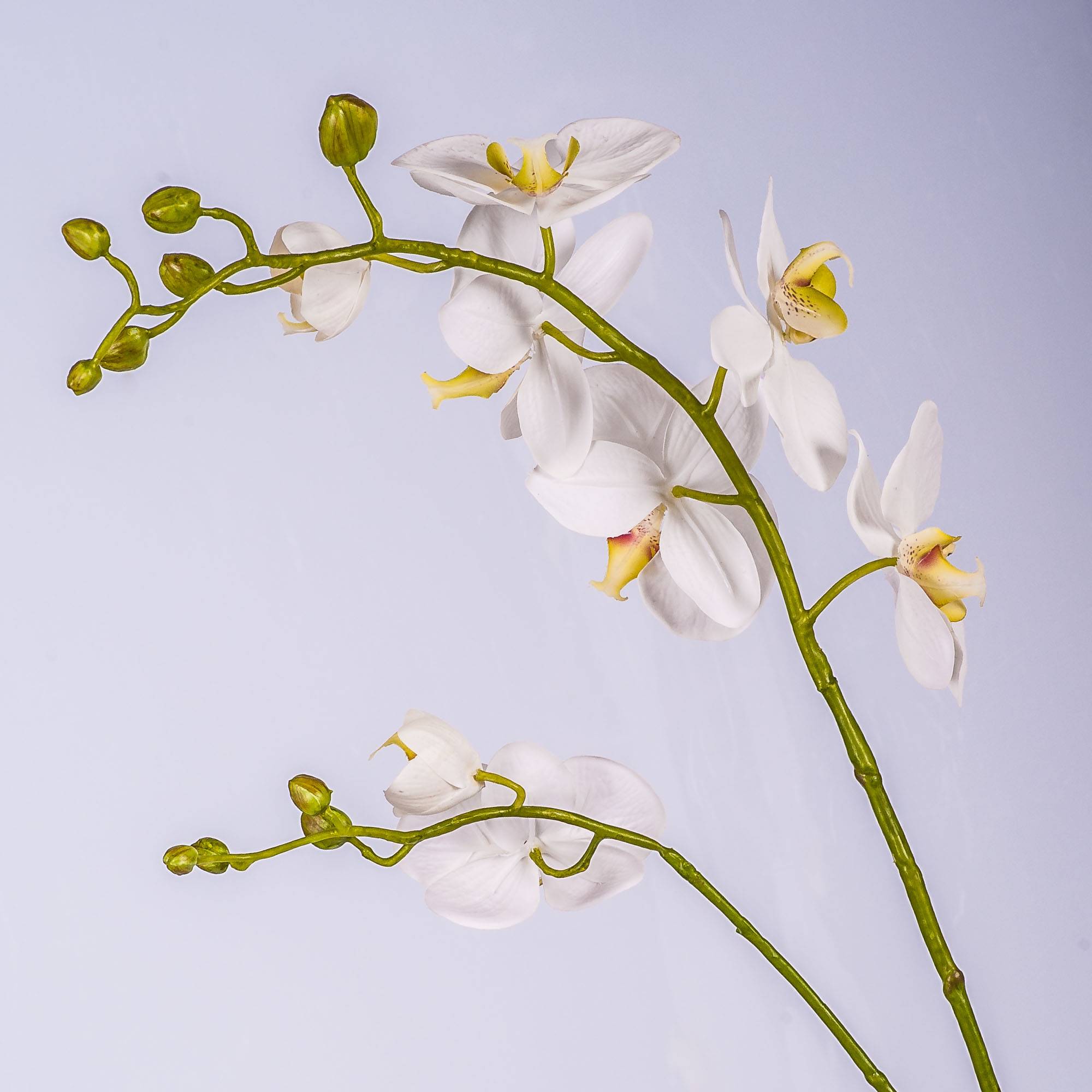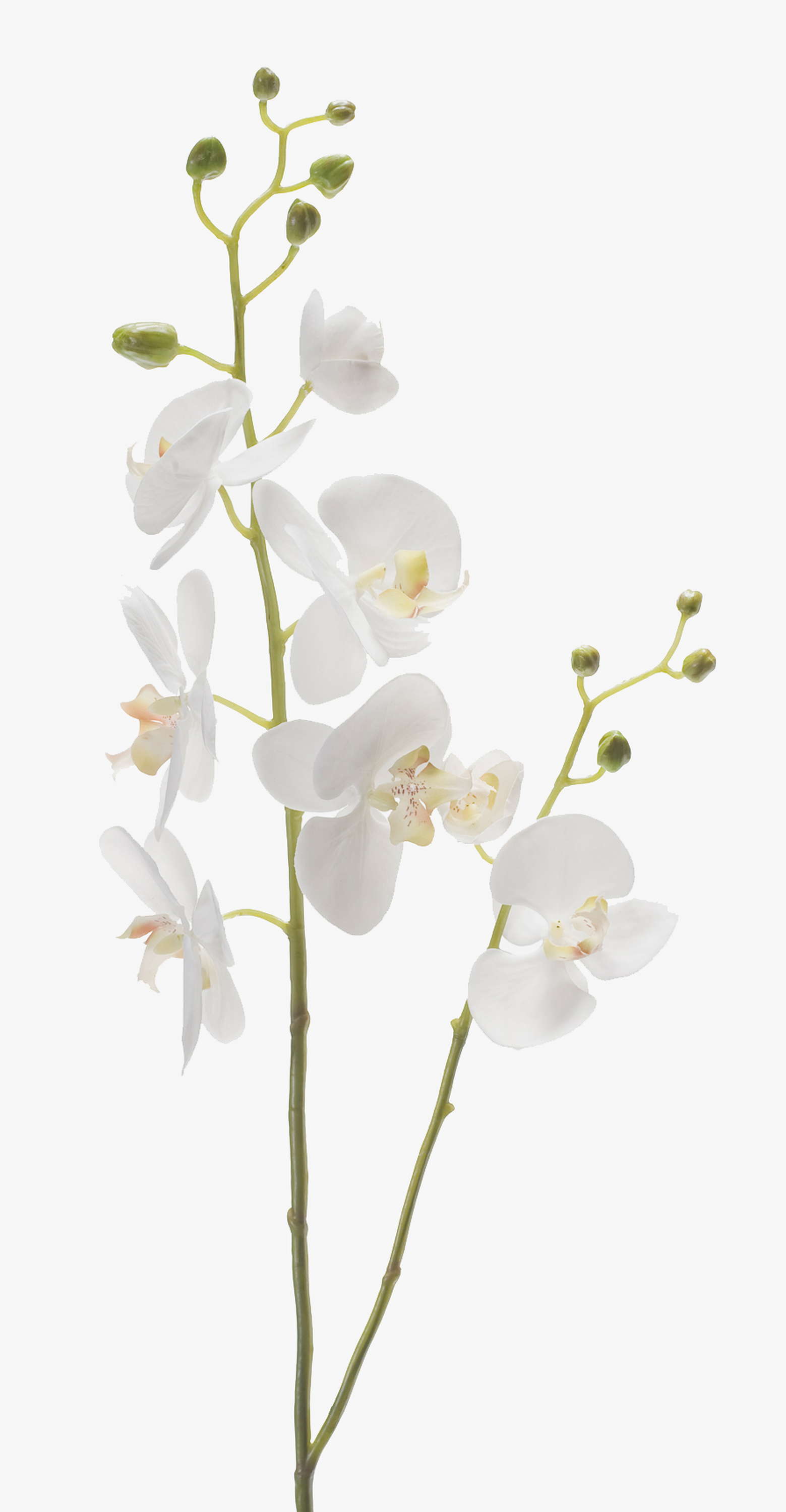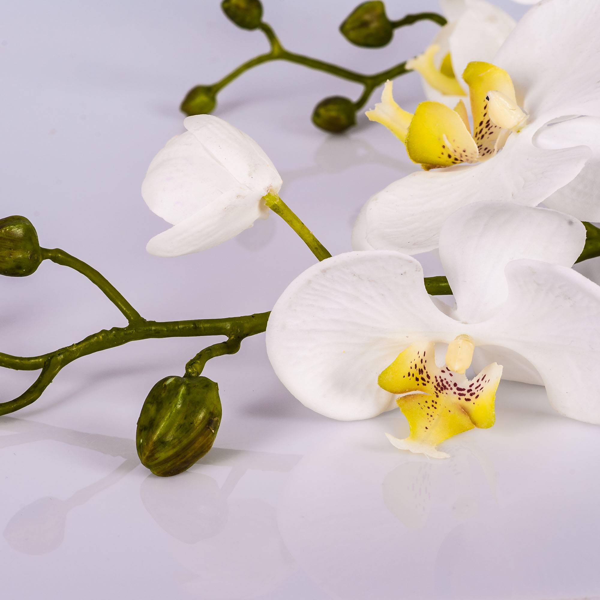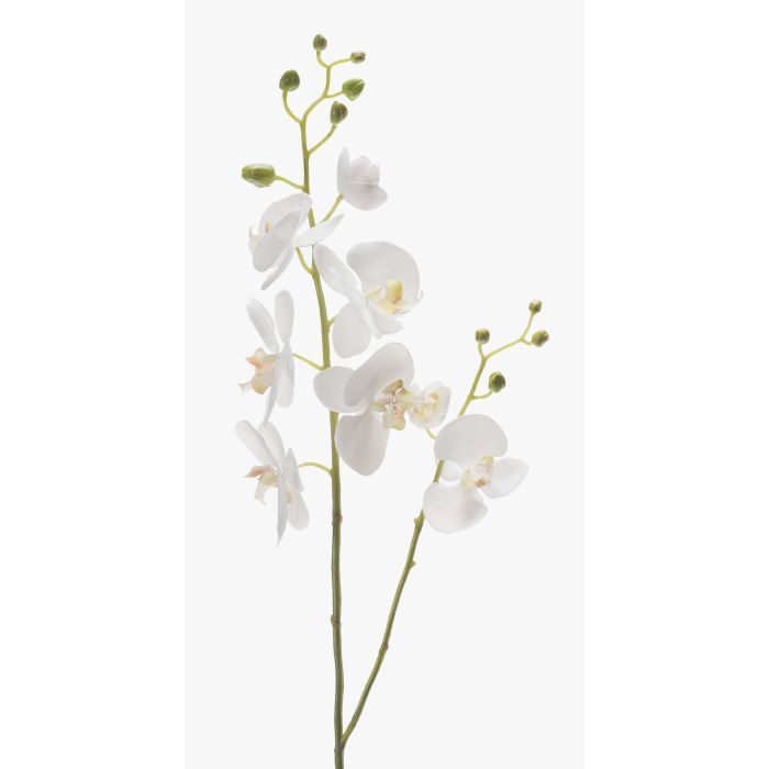 Fake Phalaenopsis orchid spray LAHNA with 8 white orchid blooms and 10 buds. The artificial orchid spray with a length of approx. 3ft/95 cm is a real eye-catcher in combination with a real faded orchid.