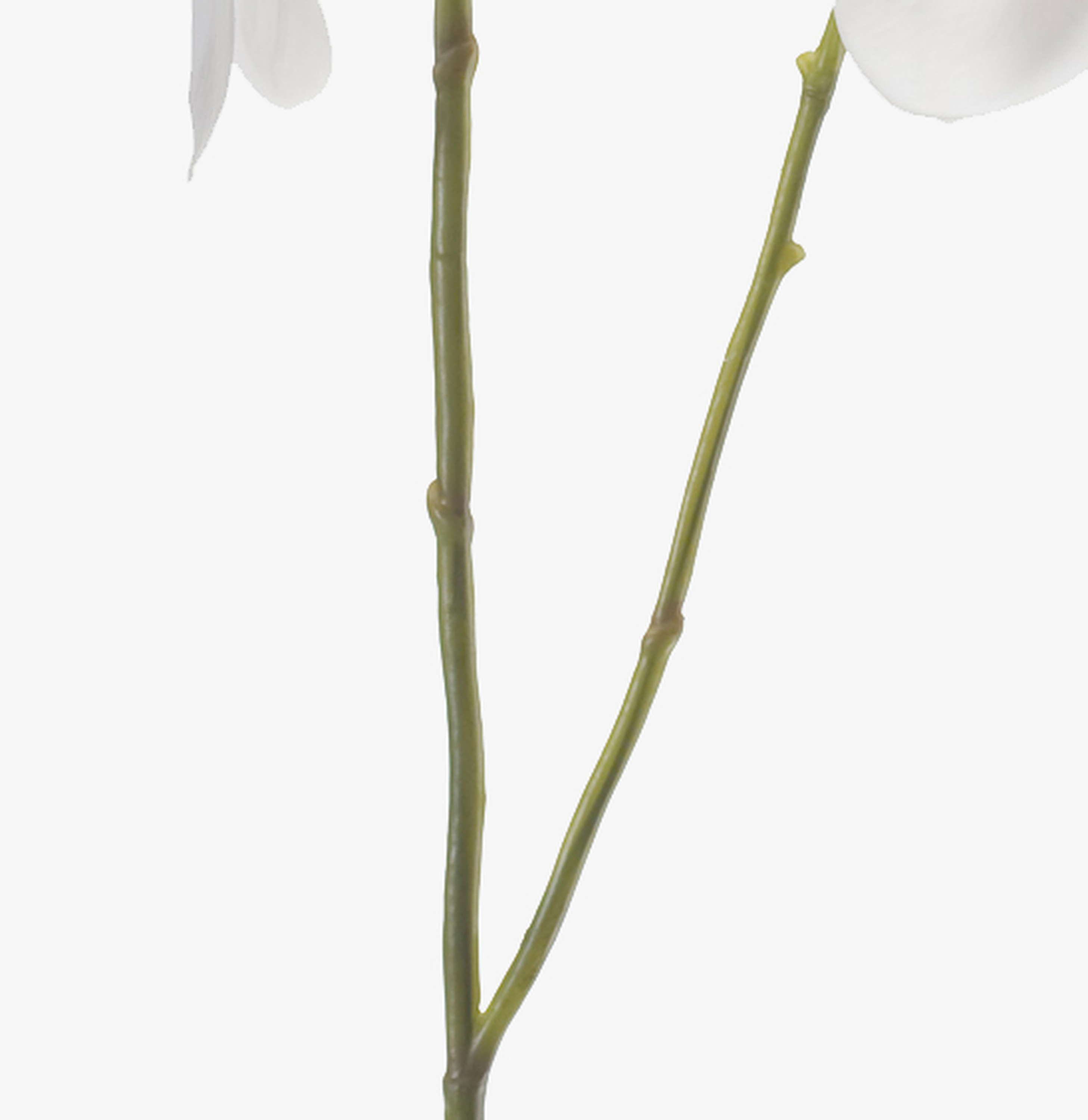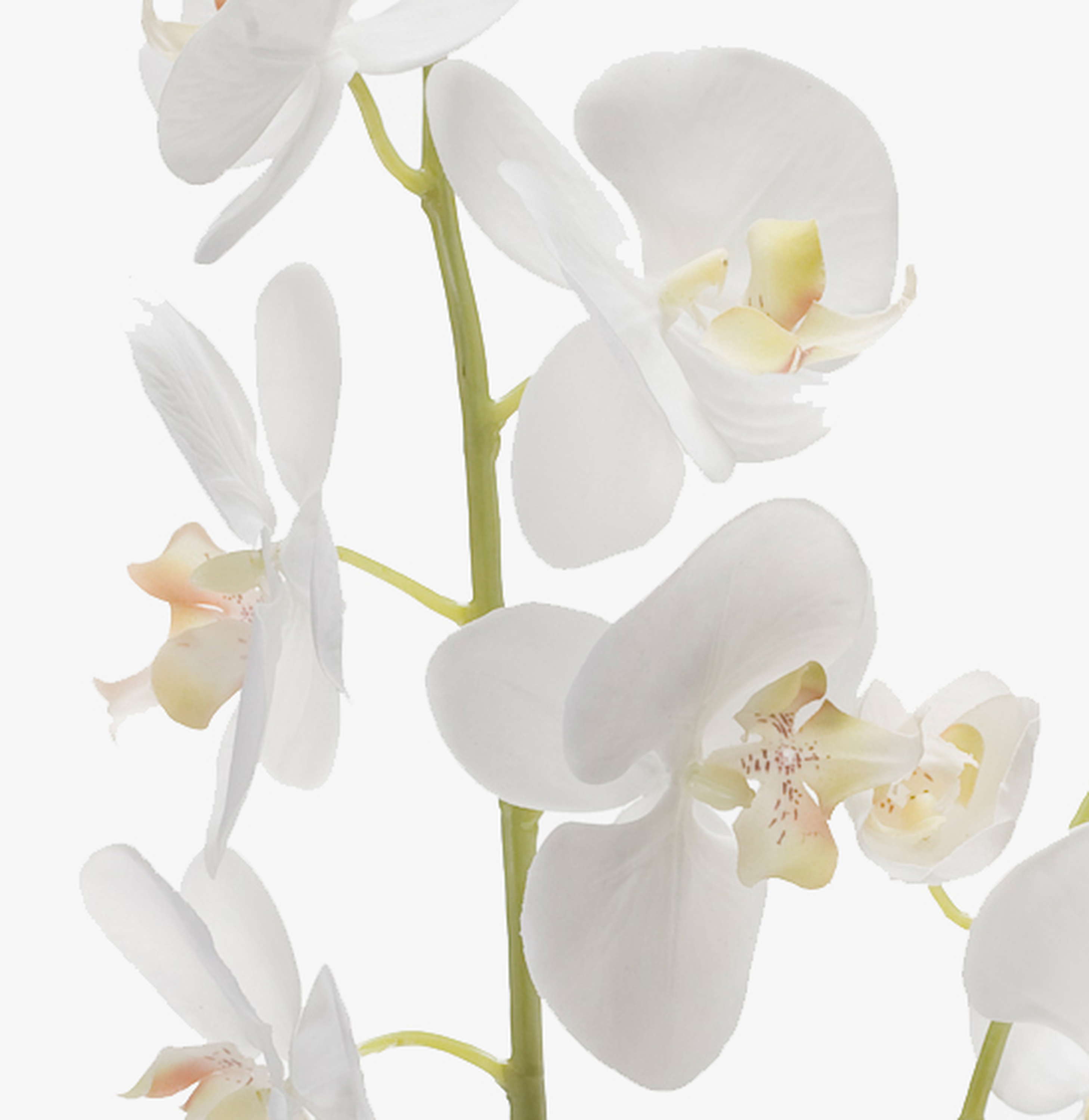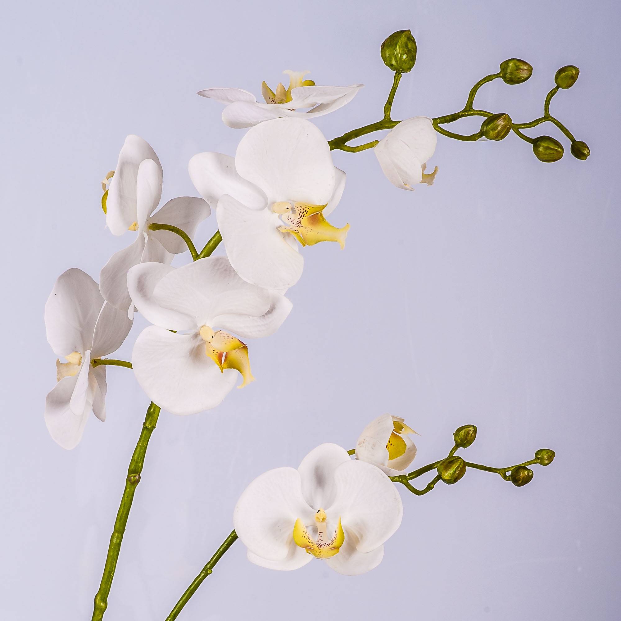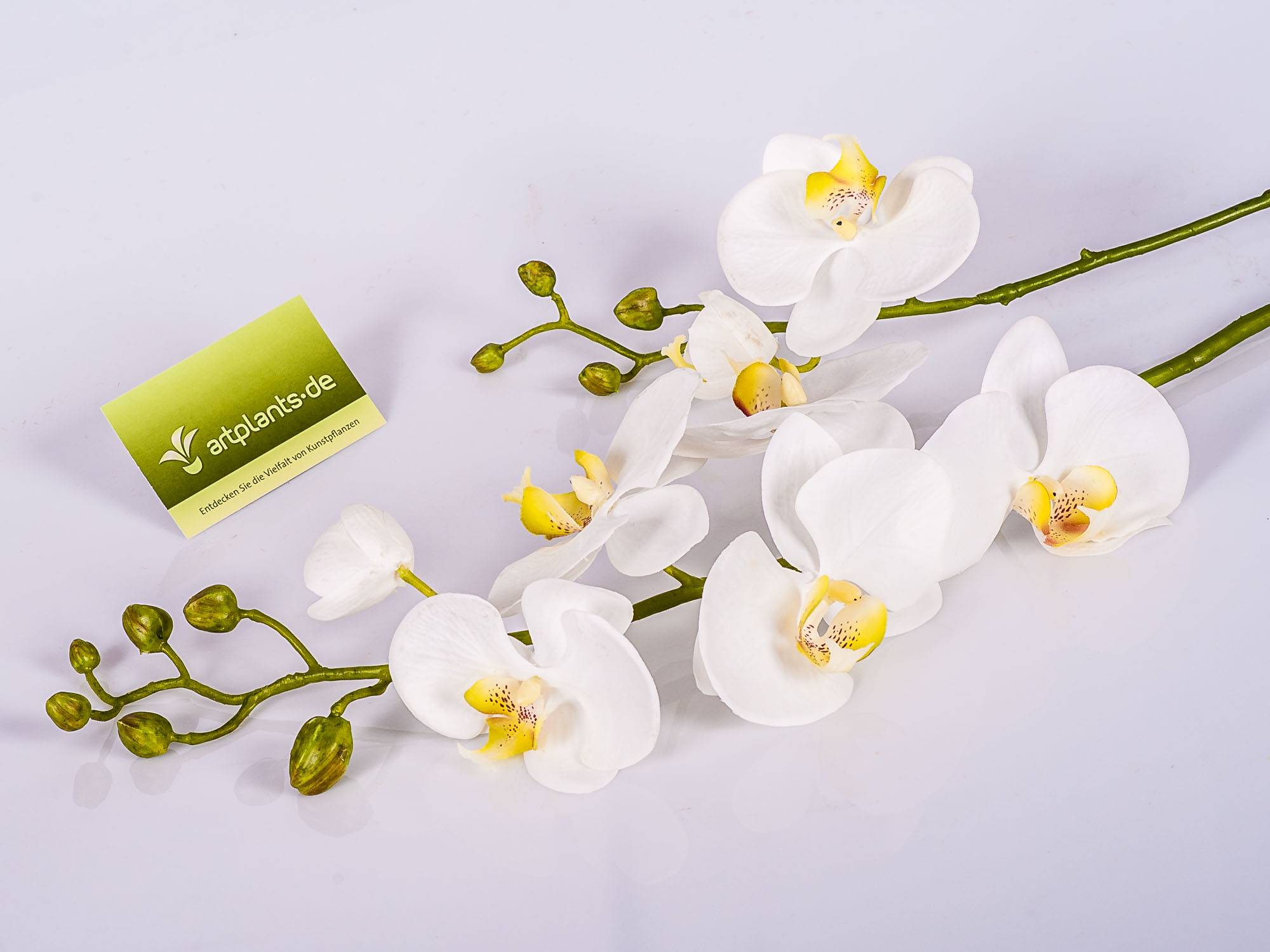 Fake Phalaenopsis orchid spray LAHNA with 8 white orchid blooms and 10 buds. The artificial orchid spray with a length of approx. 3ft/95 cm is a real eye-catcher in combination with a real faded orchid.