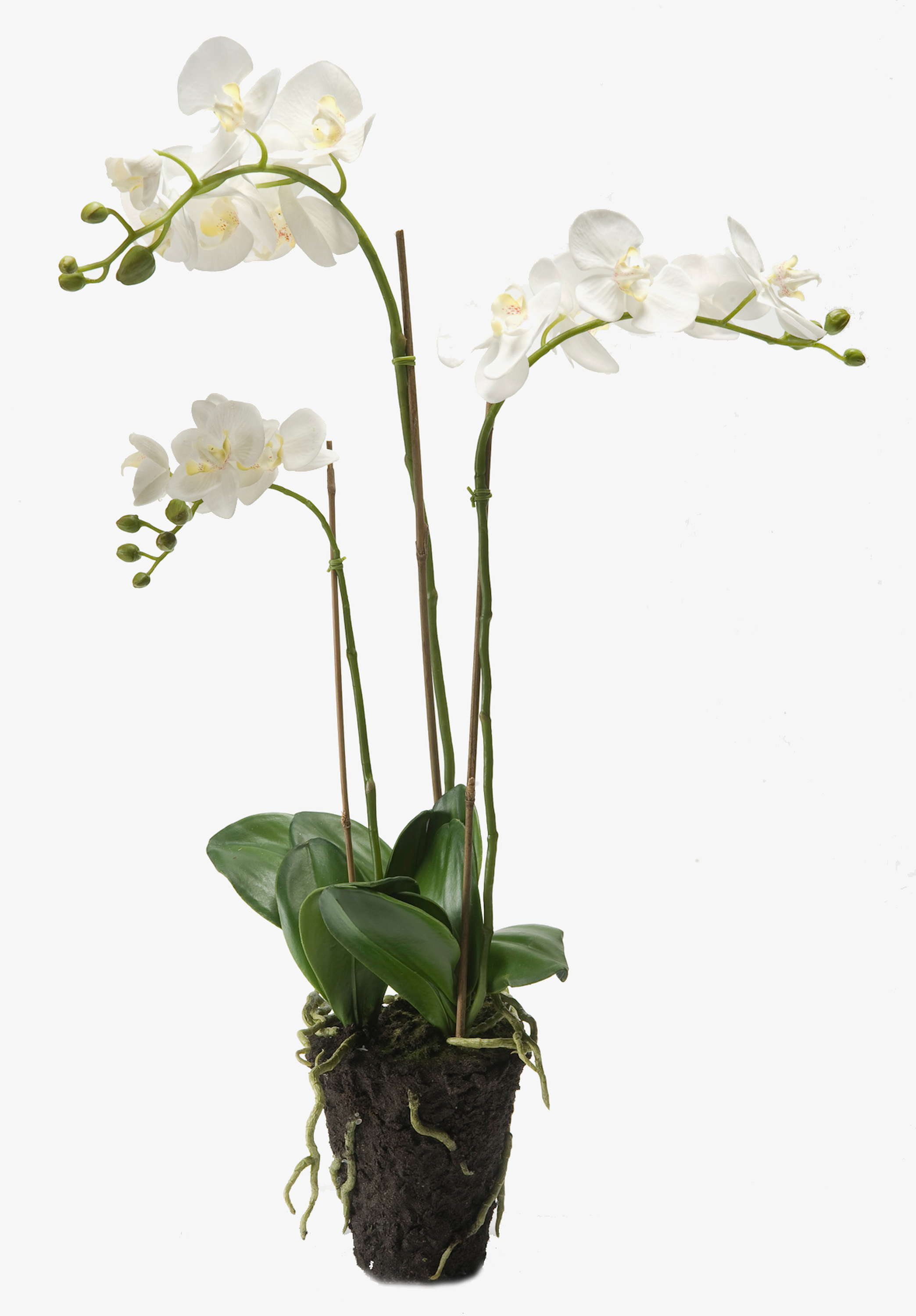 Fake Orchid Phalaenopsis PABLA has 3 sprigs and blossoms in white-yellow with a bale of soil and aerial roots. The artificial Orchid has a total height of approx. 28"/70 cm.