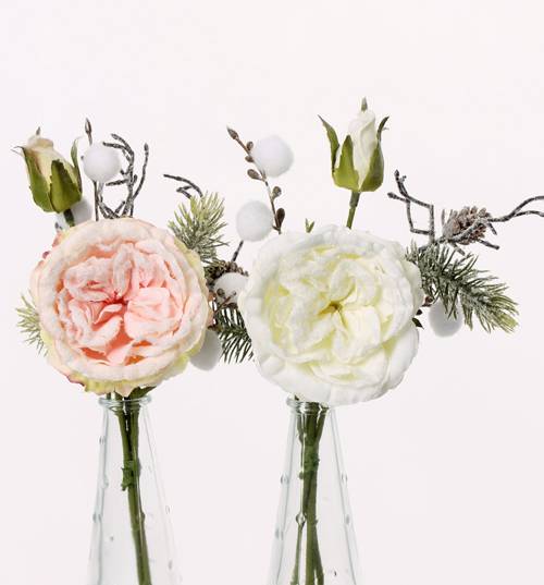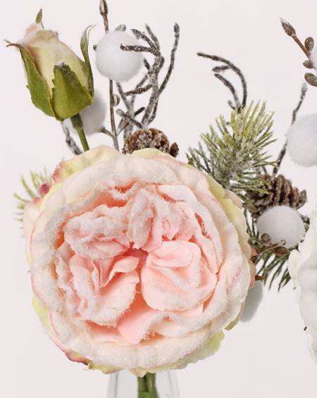 Silk rose bouquet FANNI, cones, snow-covered, pink, 12"/30cm, Ø6"/15cm