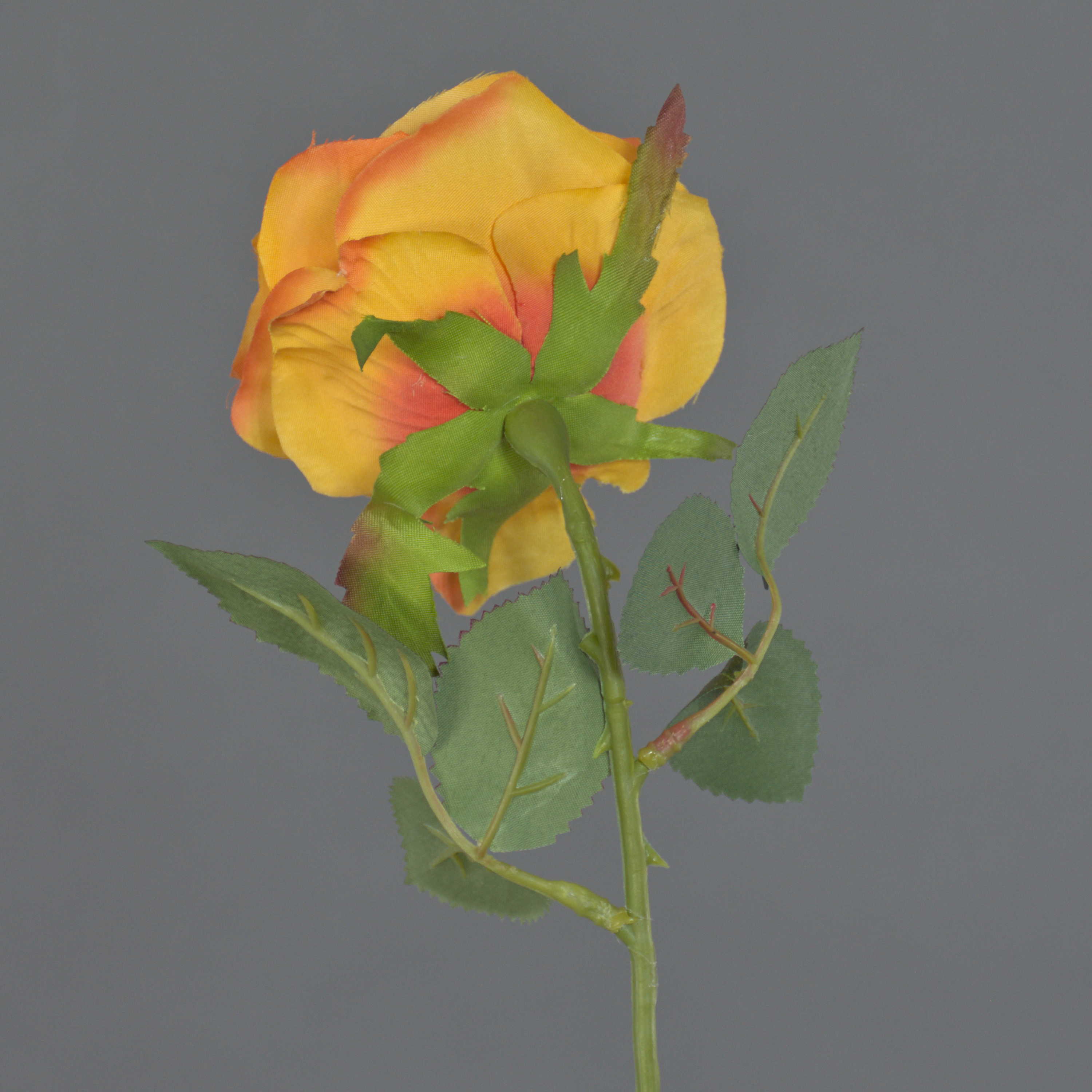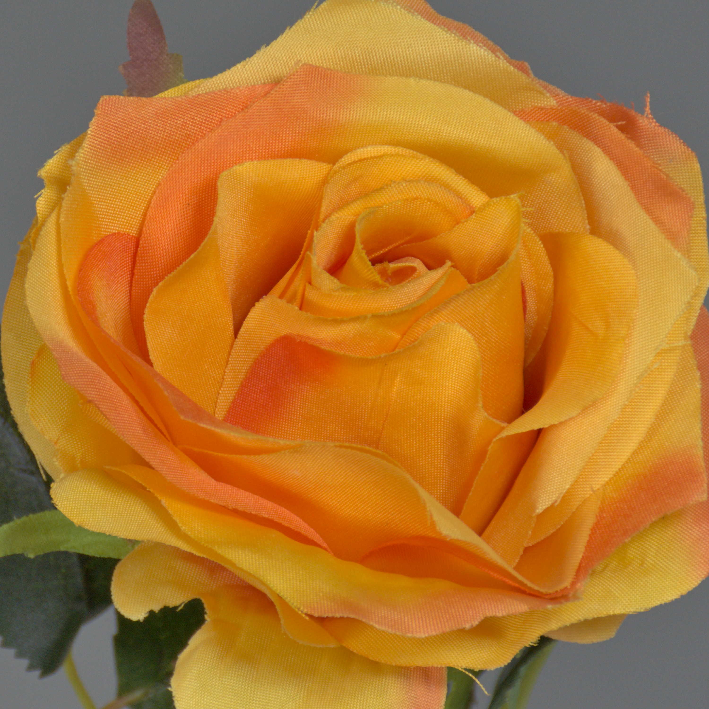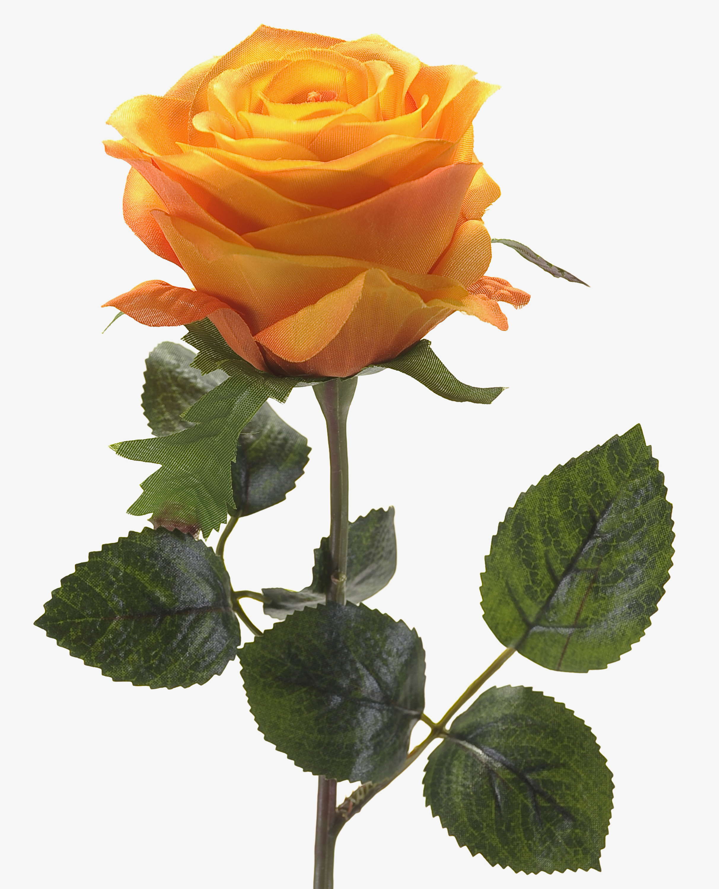 Beautiful artificial rose SIMONY in flower colour yellow-orange with green leaves. The decorative rose measures approx. 18"/45 cm in length and has a flower diameter of approx. 3.1"/8 cm.