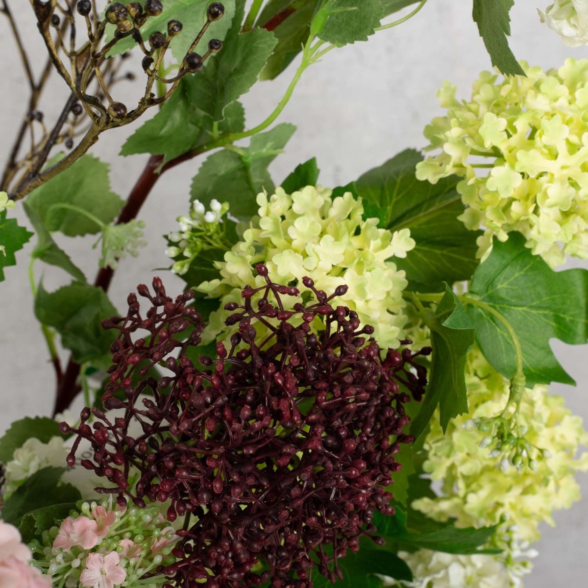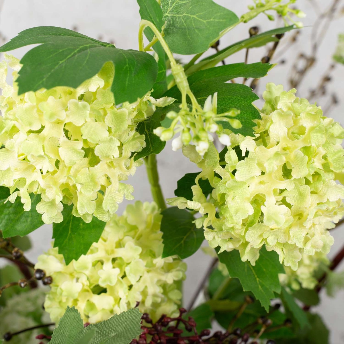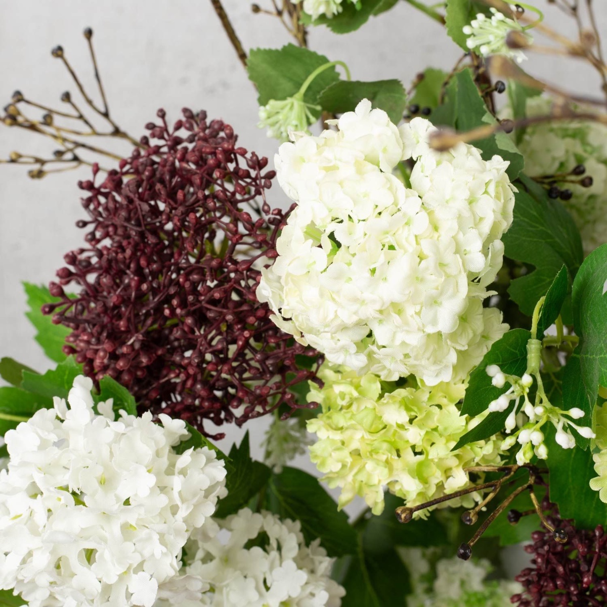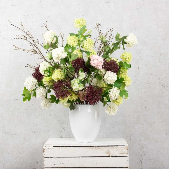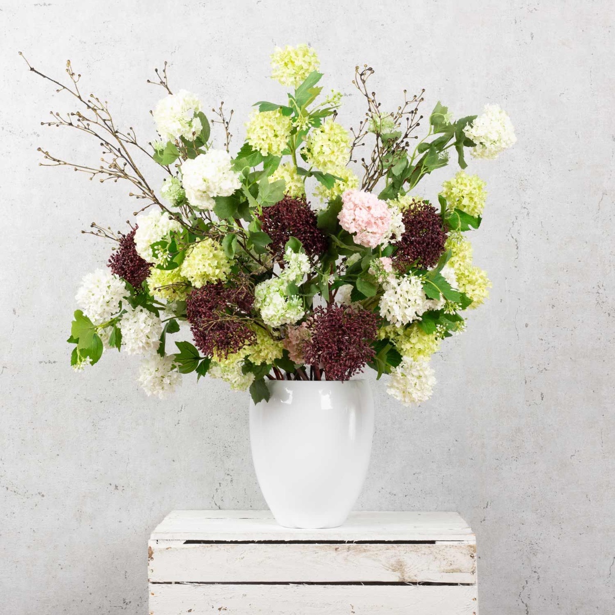 White, green and burgundy! Viburnums are truly extraordinary flowers. Many small flowers grow into a large, ball-like blossom that looks like a snowball. This look was created from various colours and inflorescences of the snowball and shows how lush and impressive these flowers are. Shop the look!