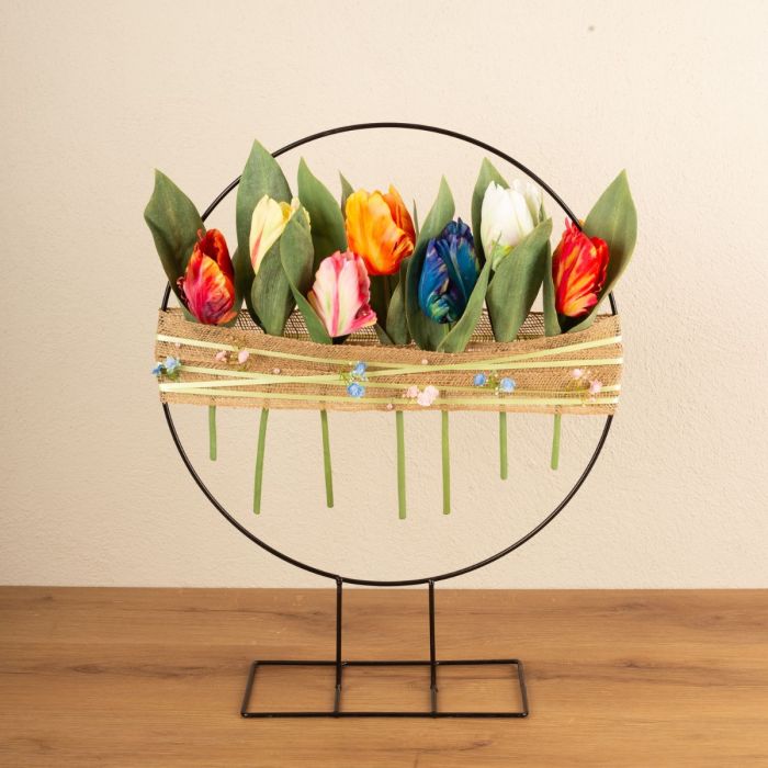 Colourful, like spring! Winter is finally over and the early bloomers are sprouting in the meadows. Our UAKARI tulips are available in a range of colours, so we had a huge selection to choose from for this look. The metal ring is always a good base for modern decorations and is perfect for this spring decoration. The wide jute ribbon is used to hold the tulips and has been decorated with a green satin ribbon. Small baby's breath flowers complete this beautiful spring decoration. Shop the look!