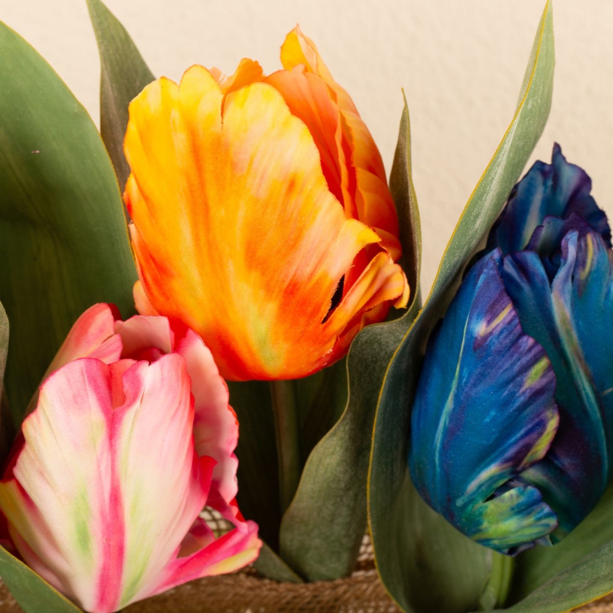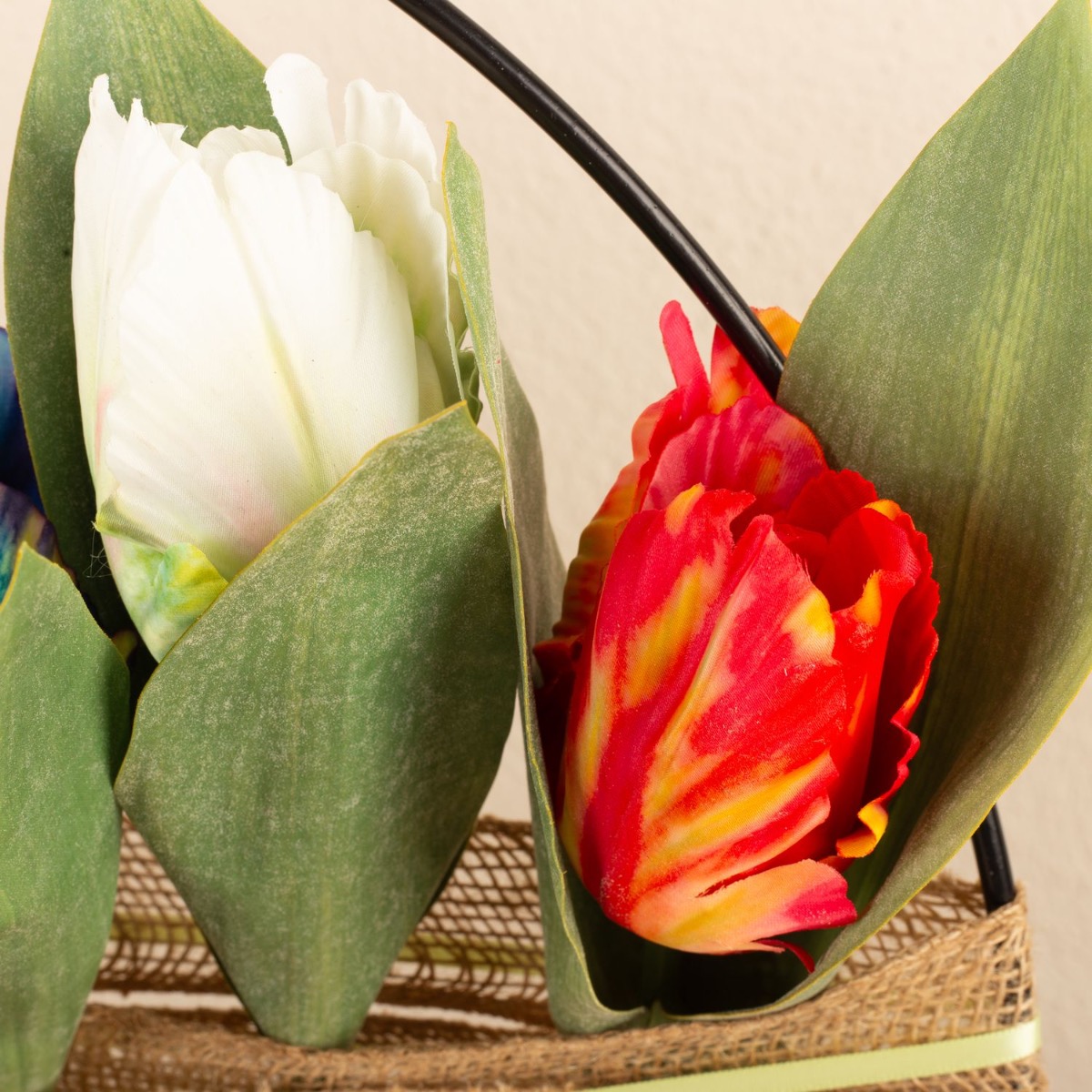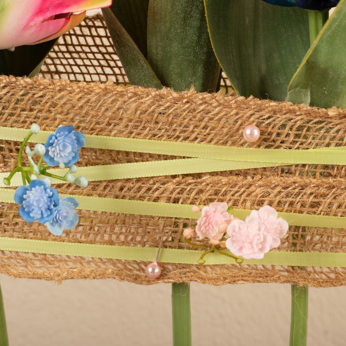 Design tip: Shorten the tulips and attach them at equal intervals to the jute ribbon. We attached them with a hot glue gun. Cut the jute ribbon generously so that it fits loosely around the ring and can be wrapped around the ring several times. Once the jute ribbon is firmly in place, the green satin ribbon can be wrapped around it. The baby's breath flowers are simply inserted into the gaps in the coarse fabric.