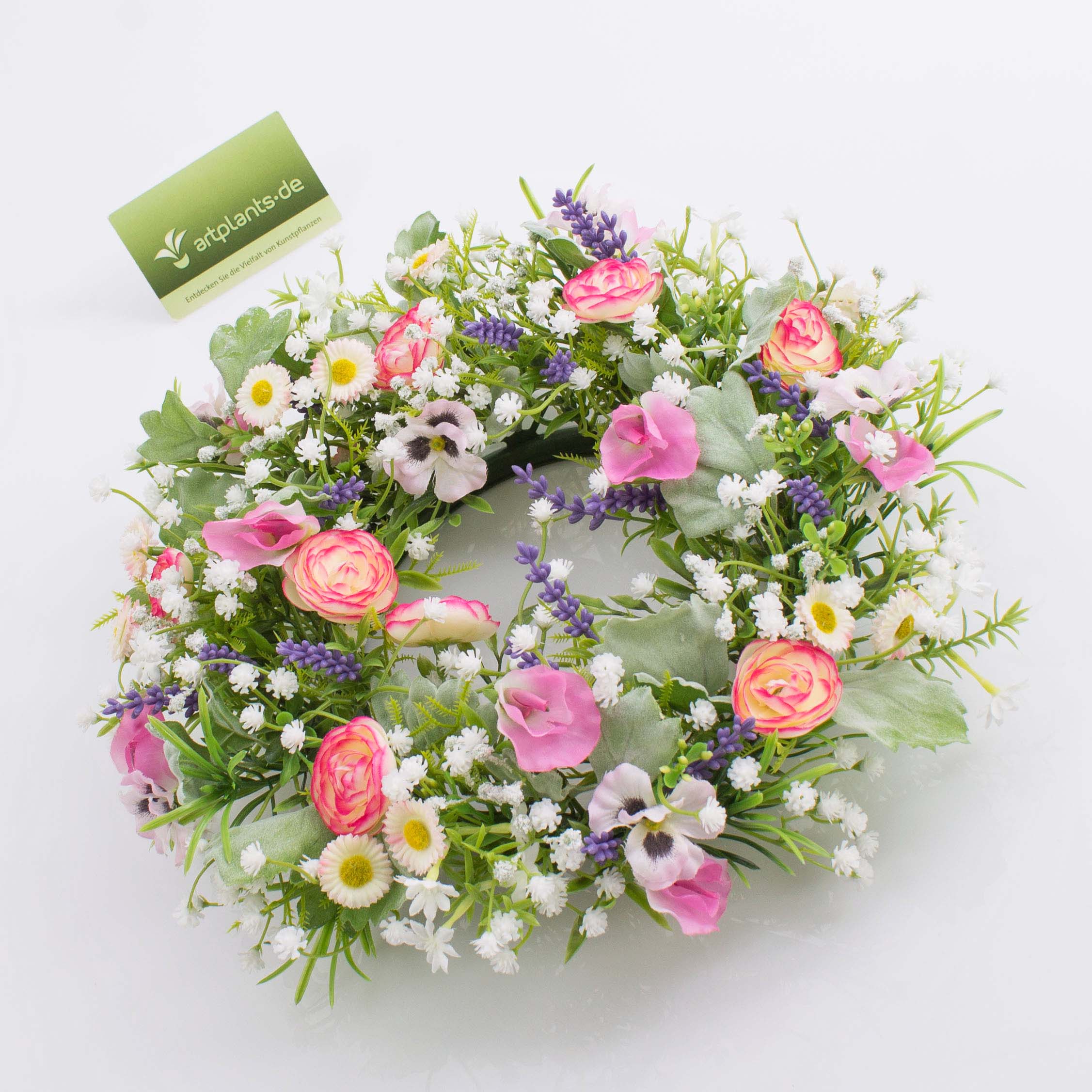 Decorative flower wreath FELICIA comprising of different spring blooms with an outside diameter of approx. 12"/30 cm. The delicate flowers of the artificial wreath are recreated in a lifelike manner and will decorate e.g. your entrance door, couch table and much more in a nice way.