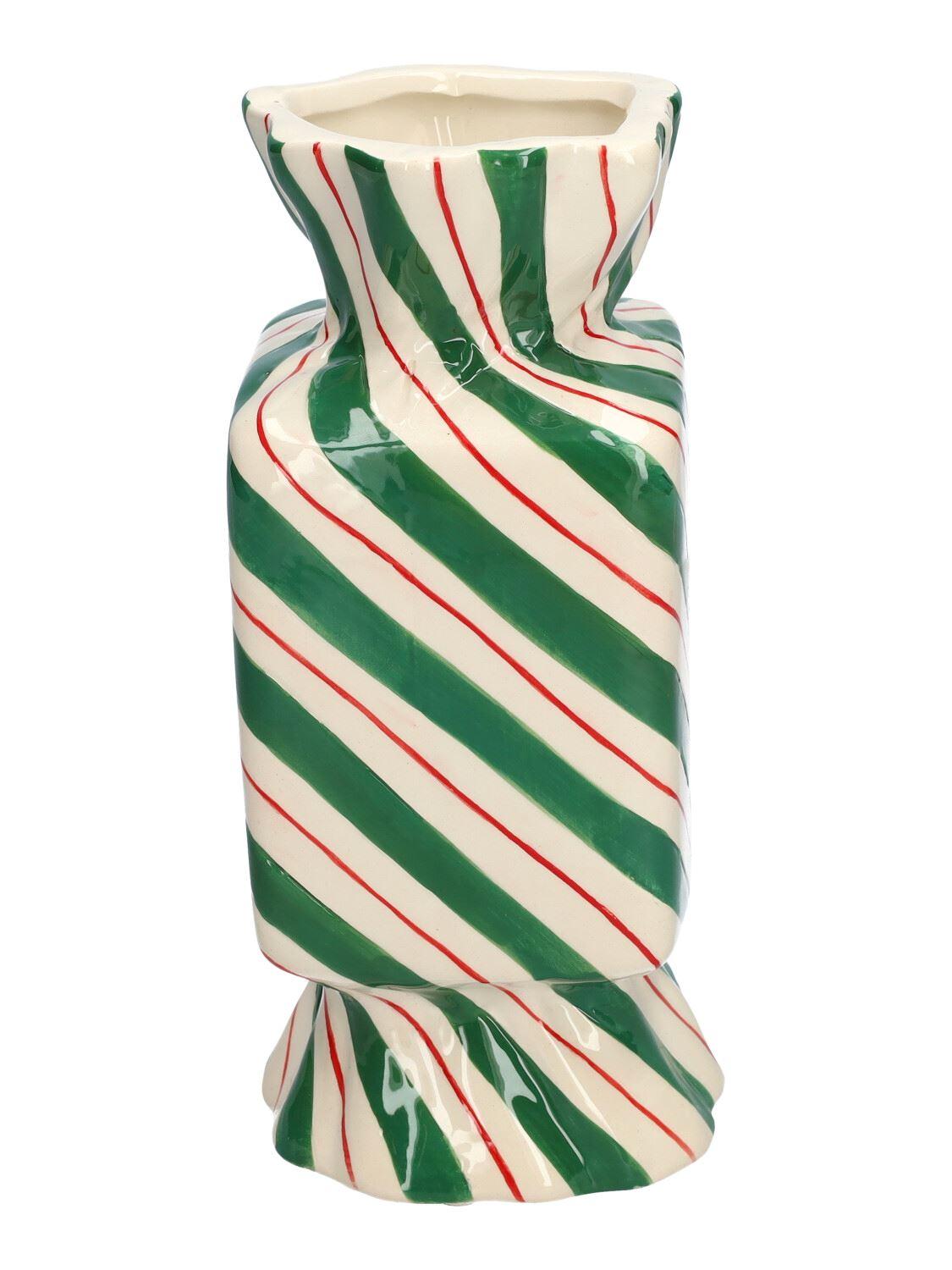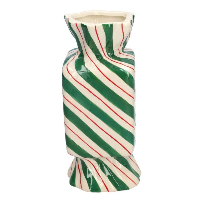 Square single stem vase in the shape of a sweet AMIEL made of ceramic, with diagonal lines, green-red-white, 3.5"x3.5"x8"/9x9x20cm