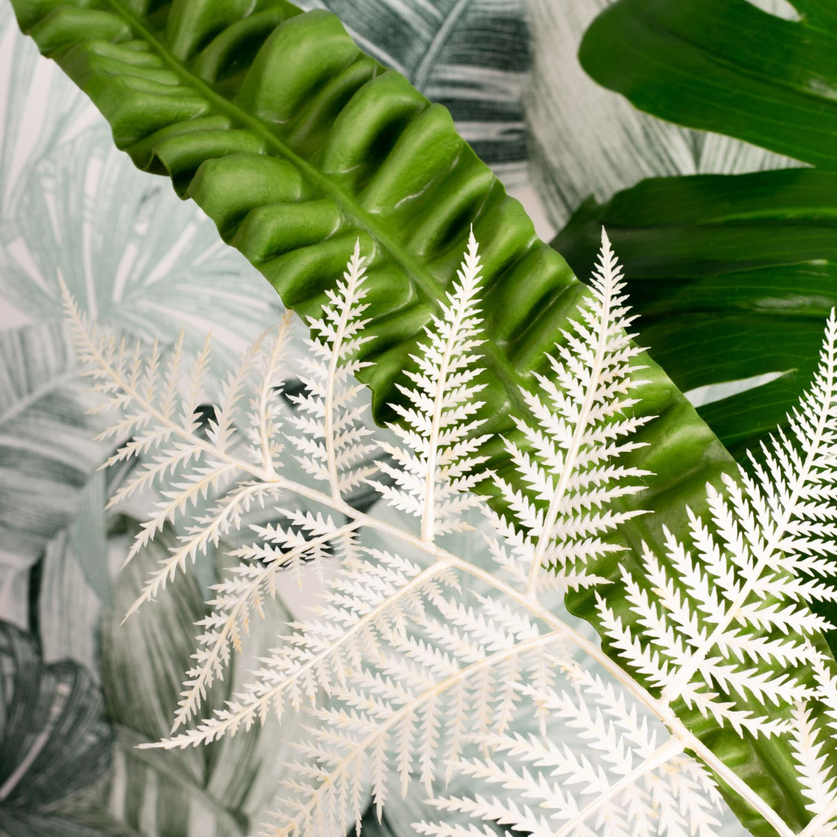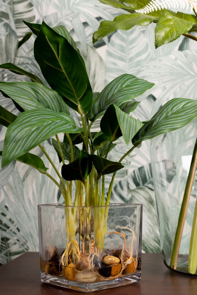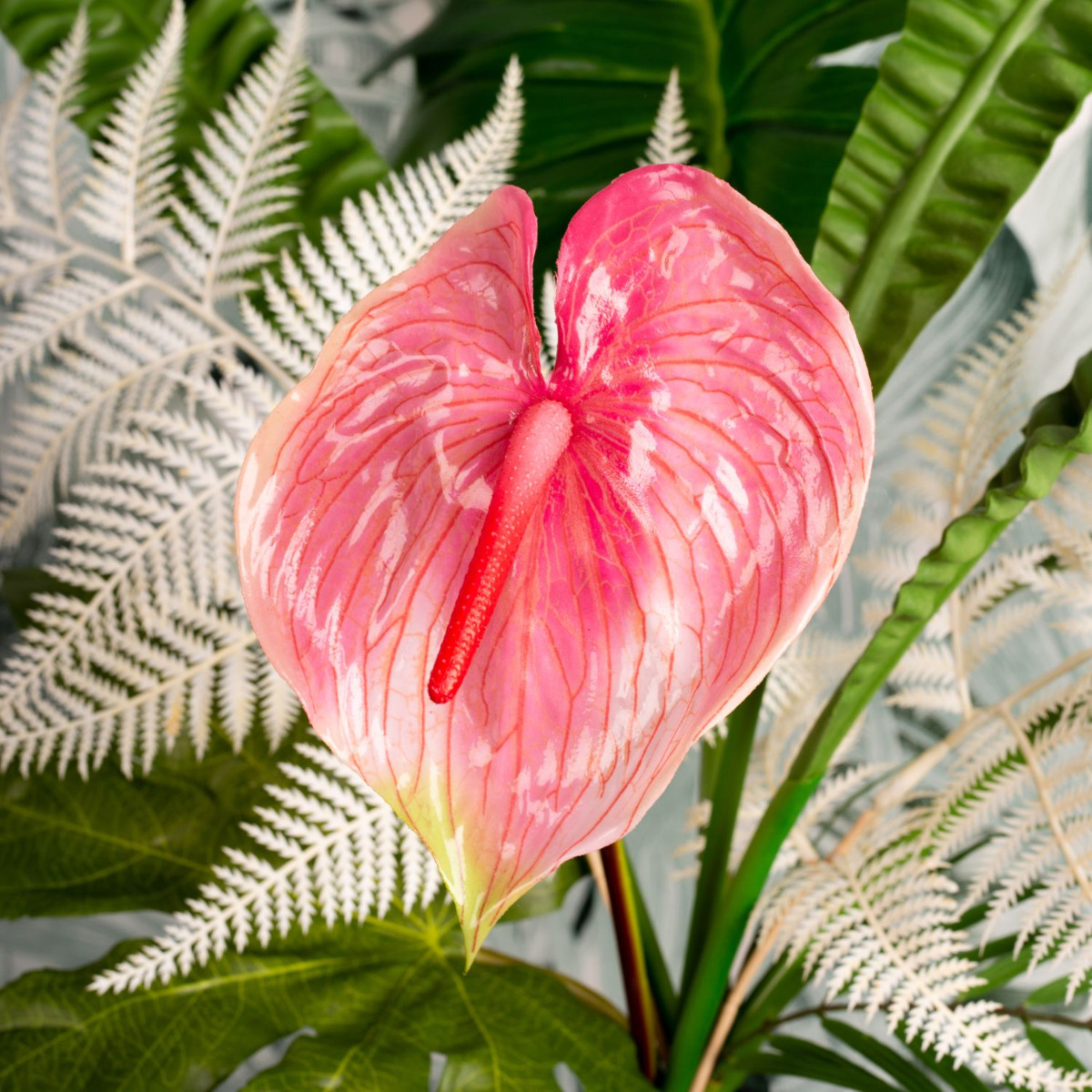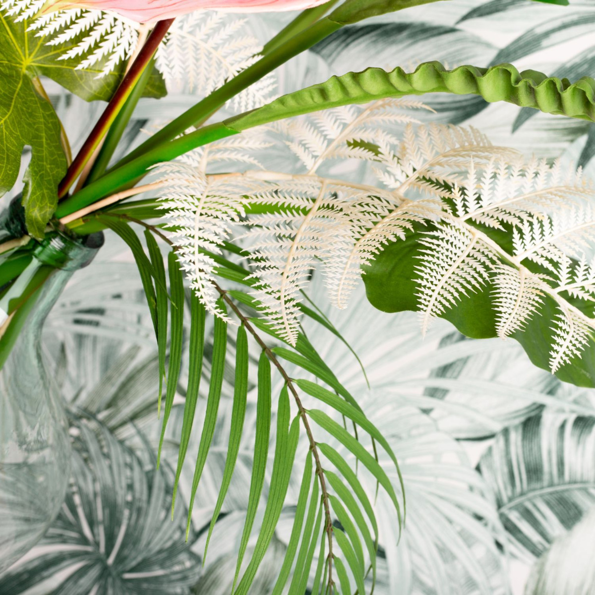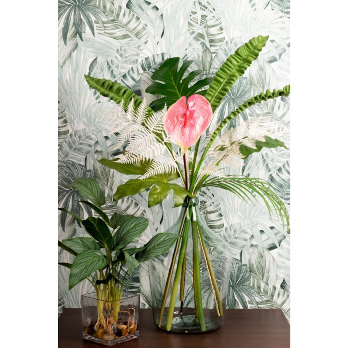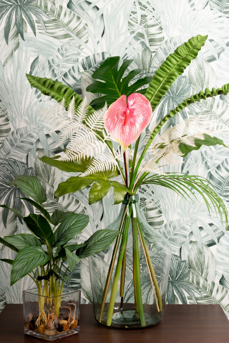 Green, green and green! This is the jungle. And sometimes a coloured flower shines through. We chose a pink flamingo flower. Various fern leaves, palm fronds, philodendron, zantedeschia and an aralia leaf are stuck in the large, green glass balloon. An artificial Aglaonema in a glass pot enhances the green in the bouquet and fits perfectly into our decoration. The colour green has a calming and relaxing effect. That's why our look is particularly suitable for rooms that demand a relaxed atmosphere. In the office, for example. Shop the Look!