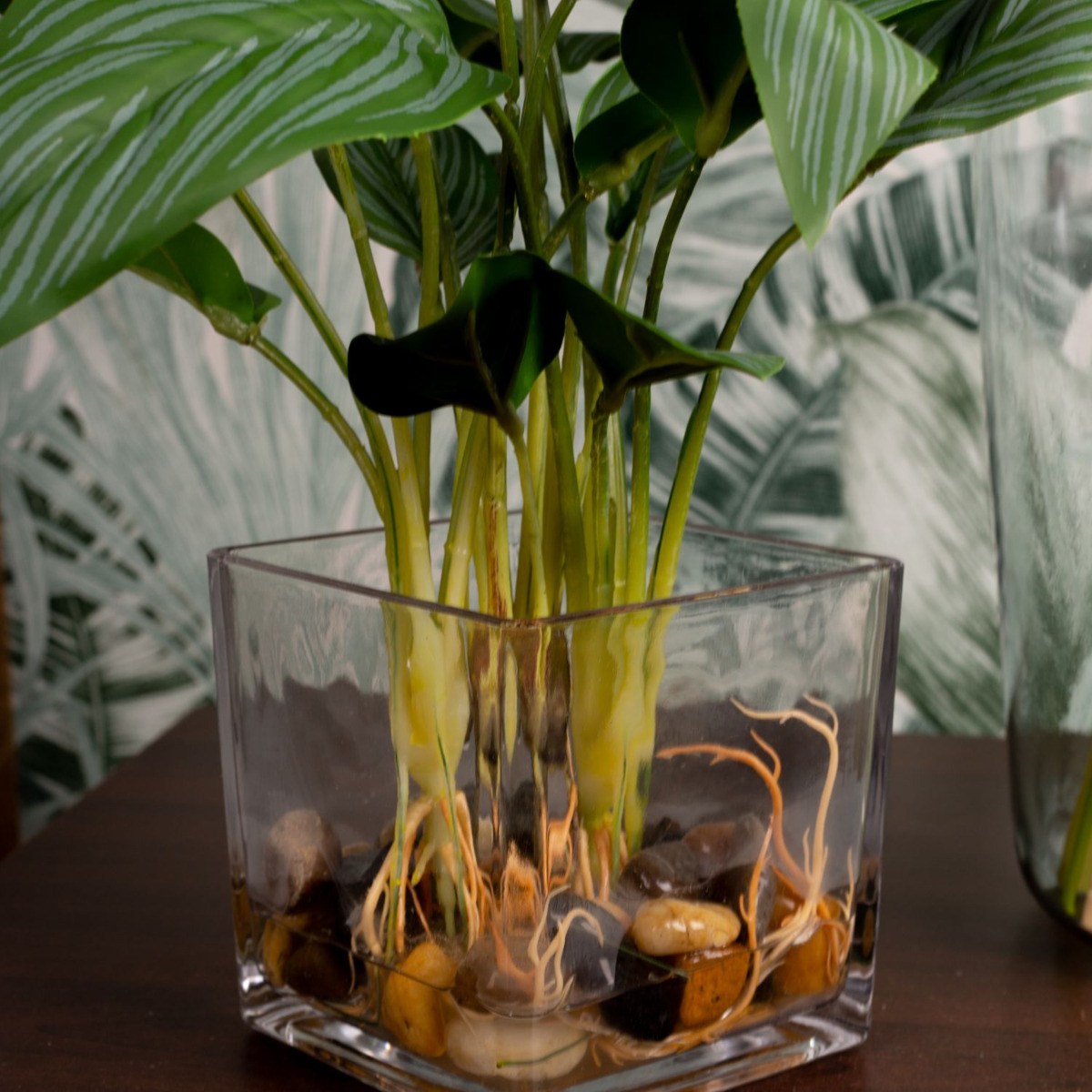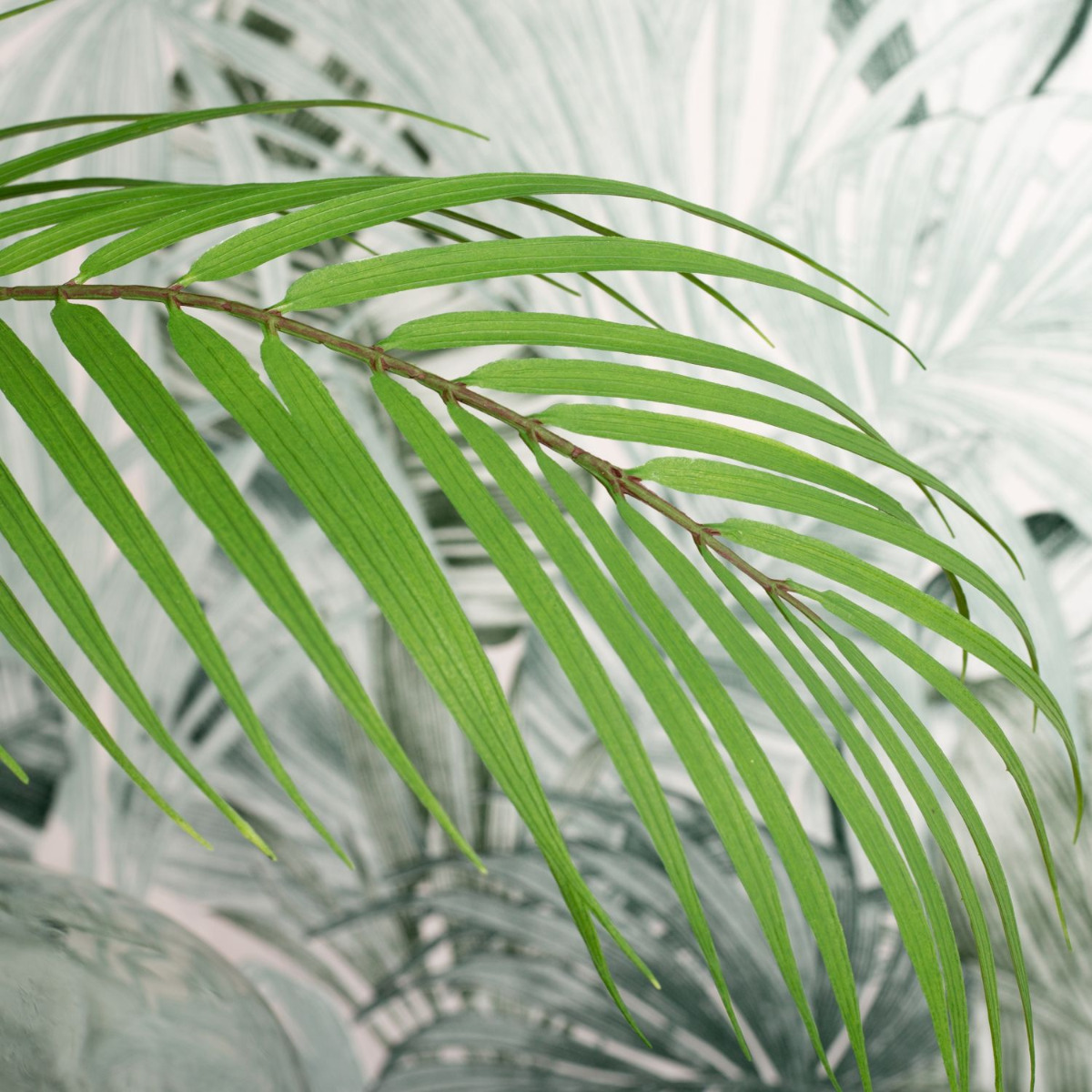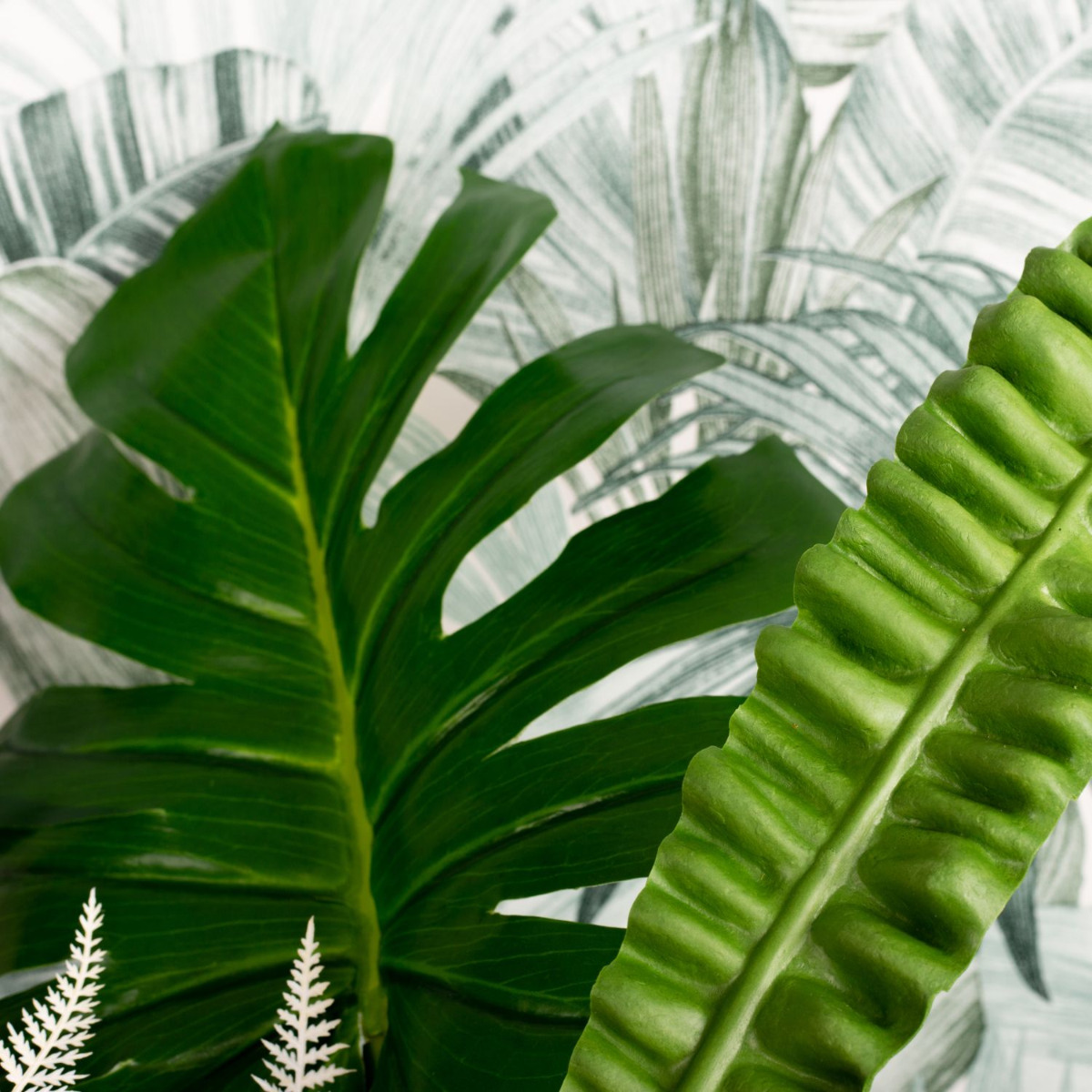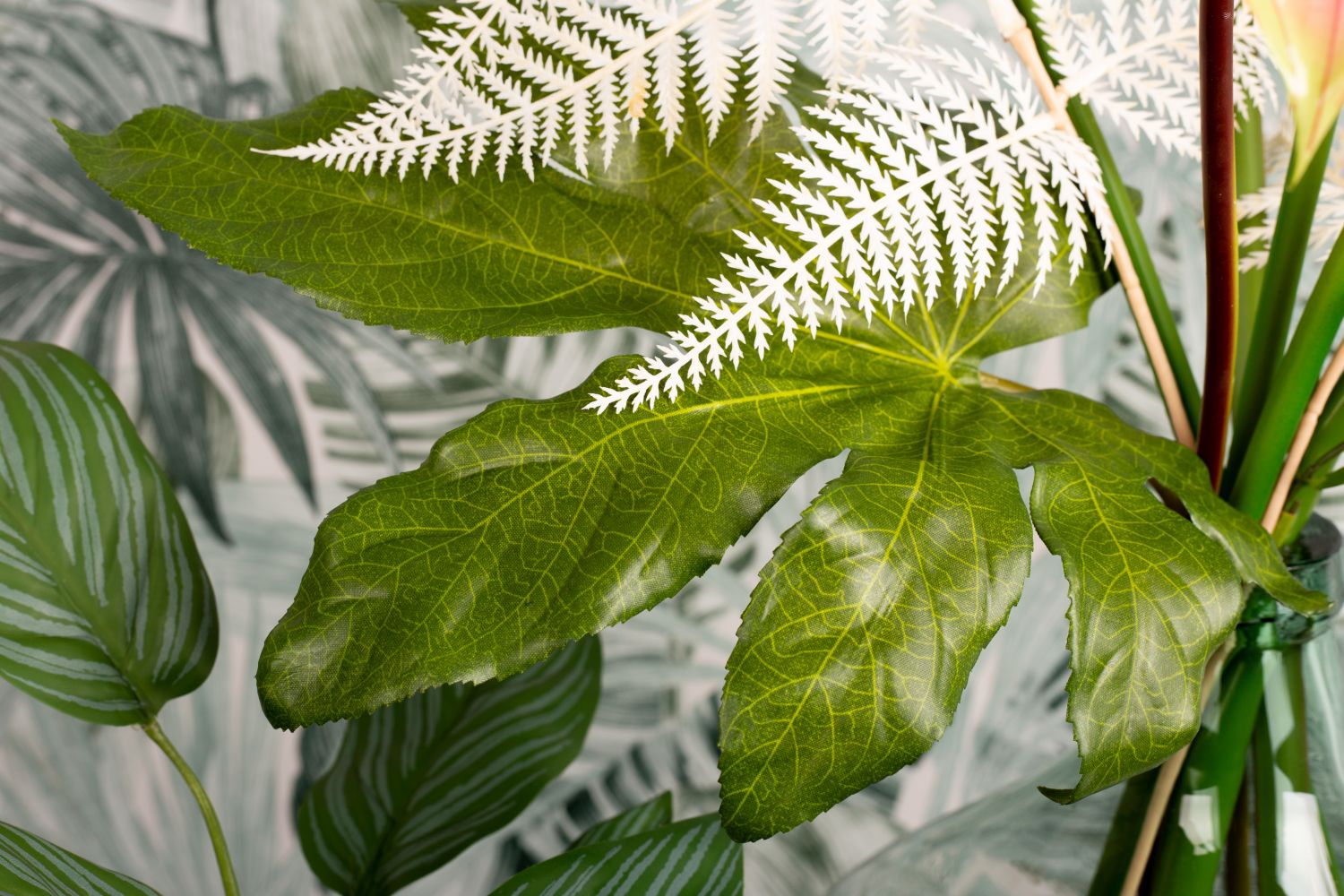 Green, green and green! This is the jungle. And sometimes a coloured flower shines through. We chose a pink flamingo flower. Various fern leaves, palm fronds, philodendron, zantedeschia and an aralia leaf are stuck in the large, green glass balloon. An artificial Aglaonema in a glass pot enhances the green in the bouquet and fits perfectly into our decoration. The colour green has a calming and relaxing effect. That's why our look is particularly suitable for rooms that demand a relaxed atmosphere. In the office, for example. Shop the Look!