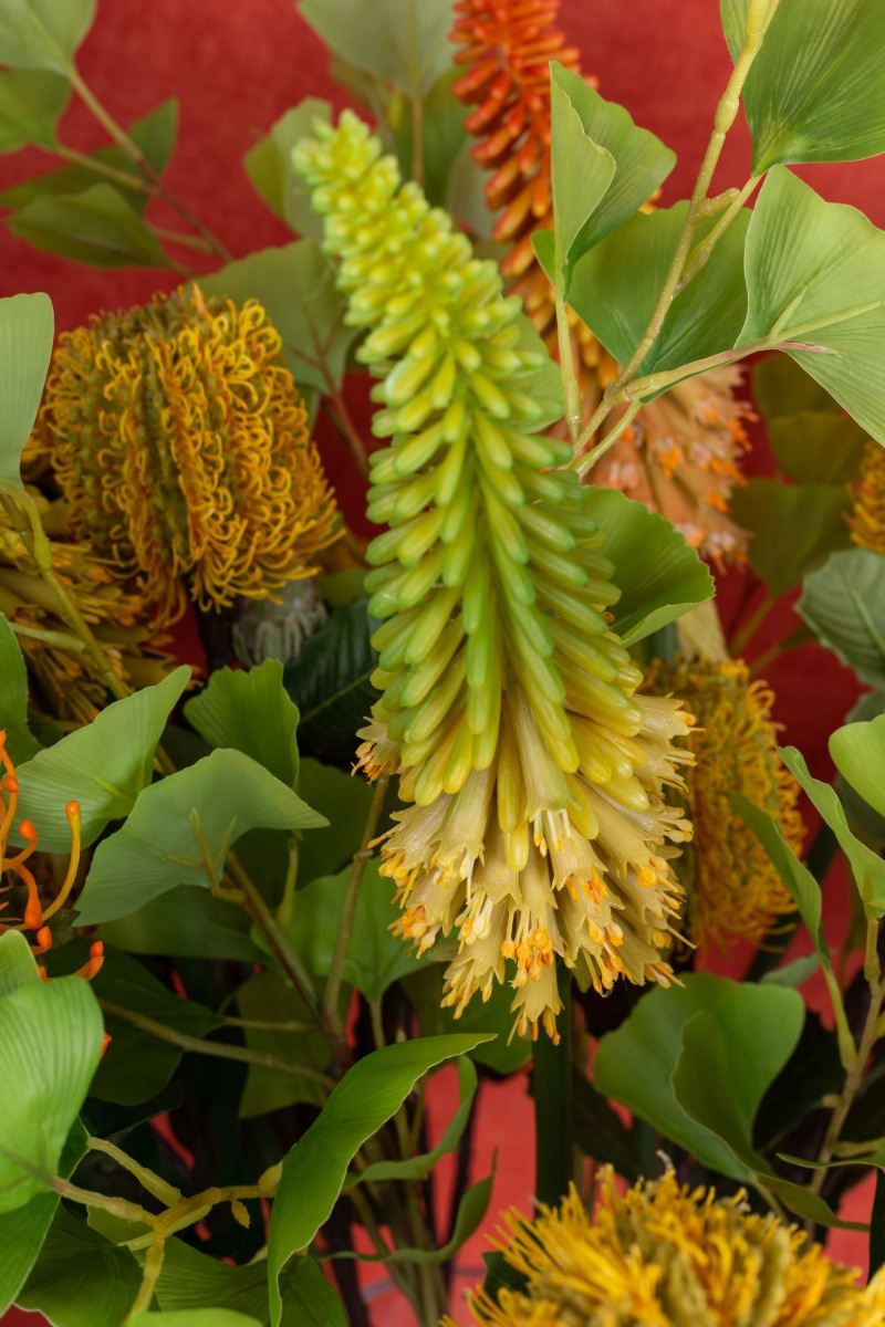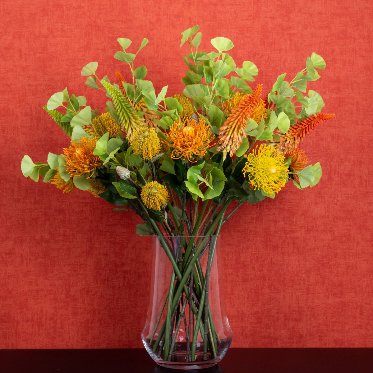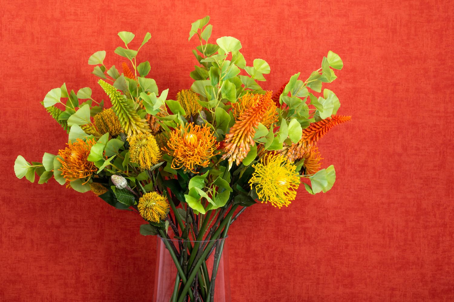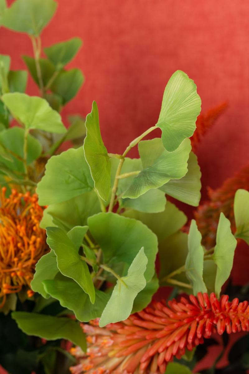 Design tip:Distribute the flowers evenly over the vase and brighten them up with gingko leaves.