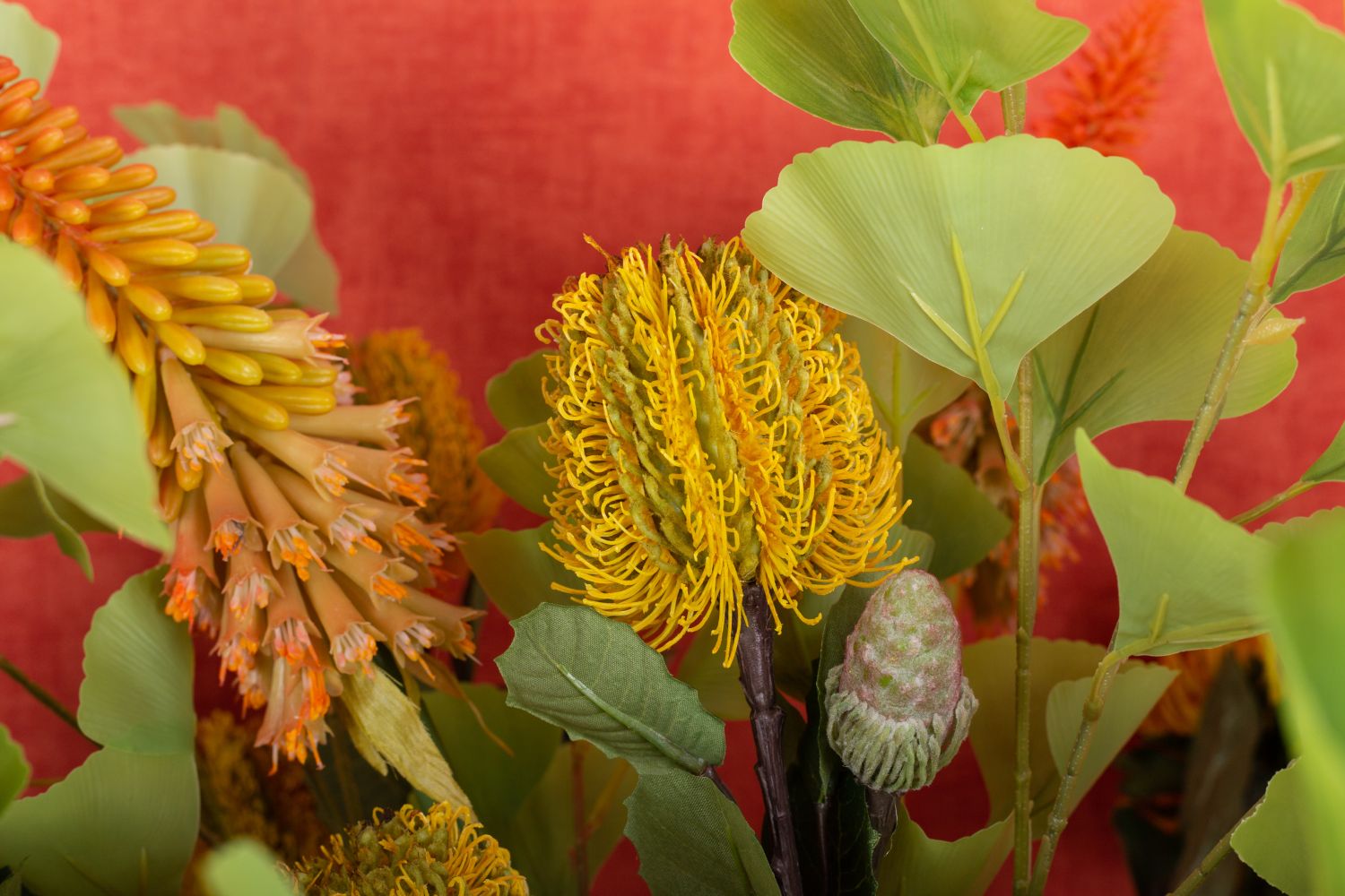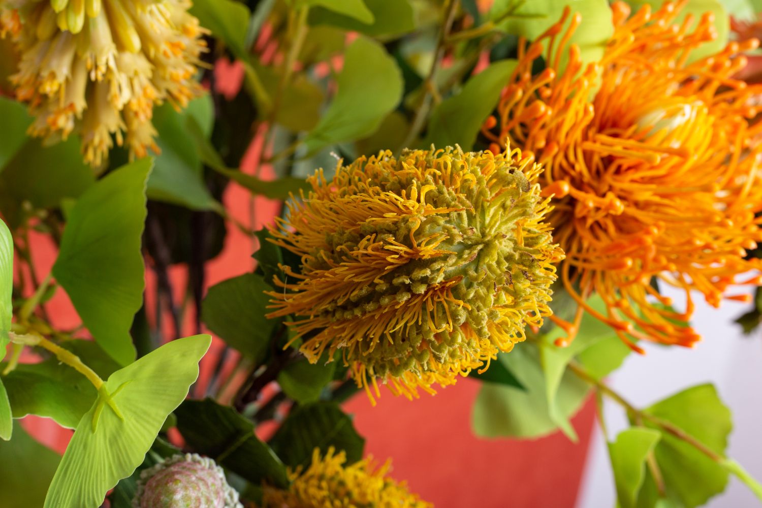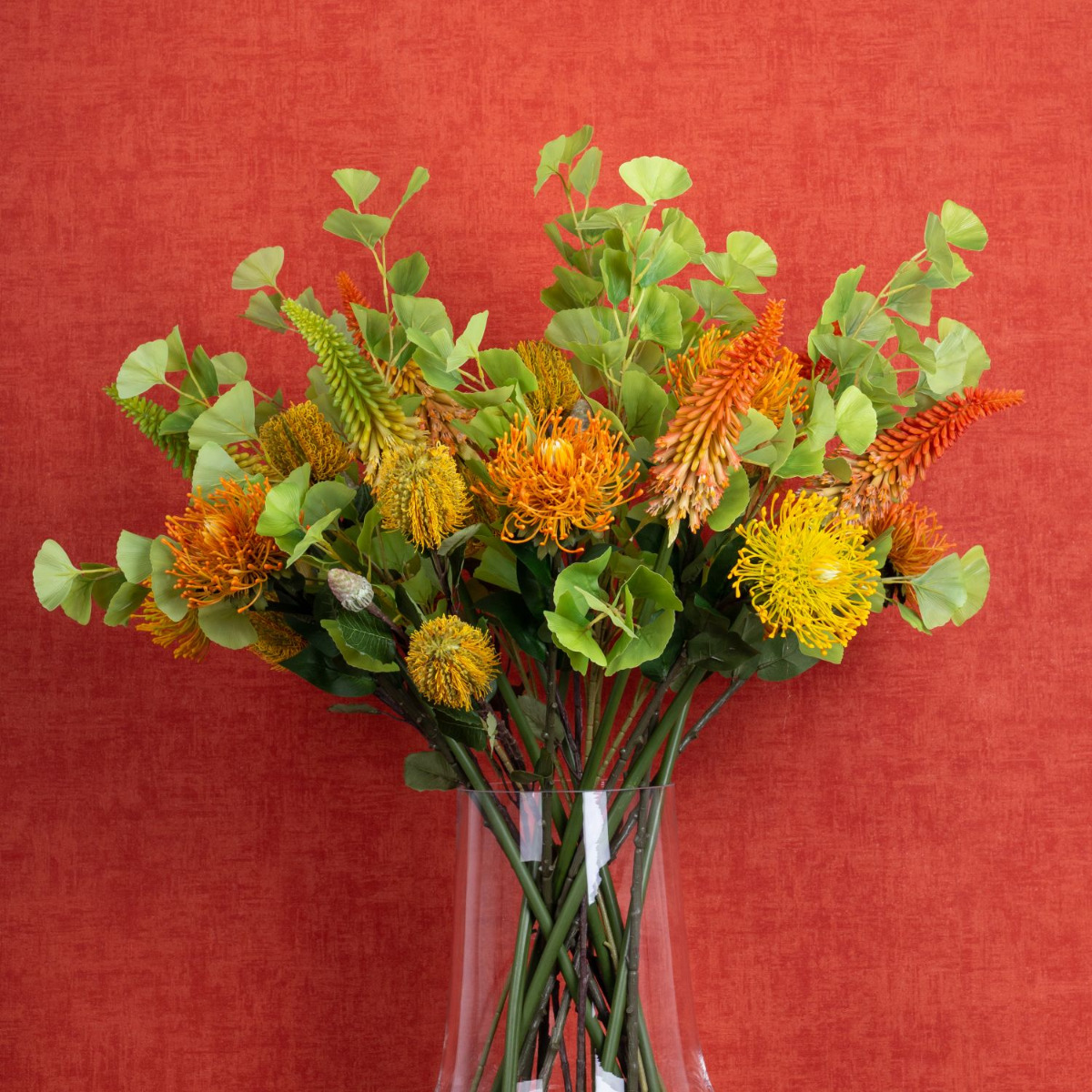 Design tip:Distribute the flowers evenly over the vase and brighten them up with gingko leaves.
