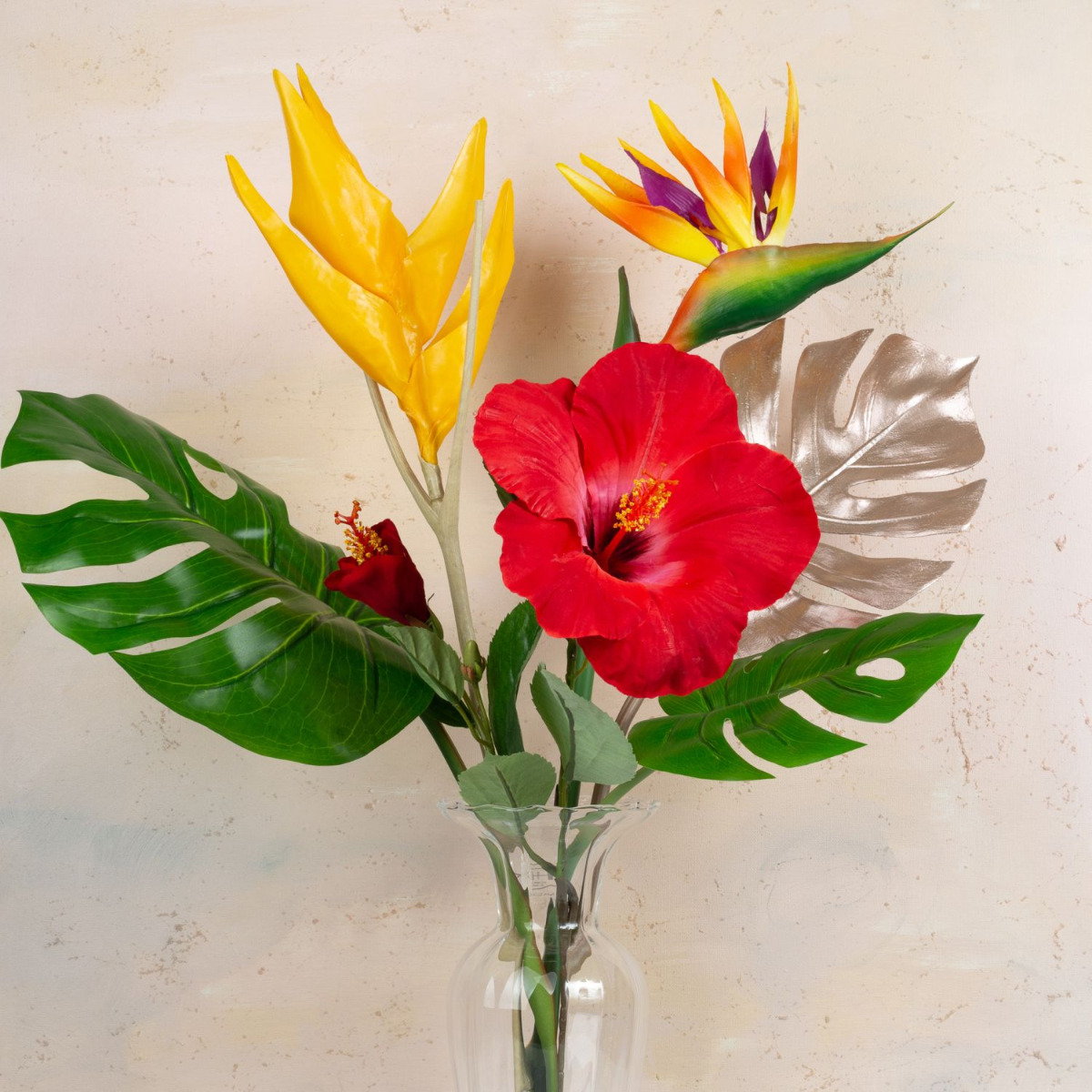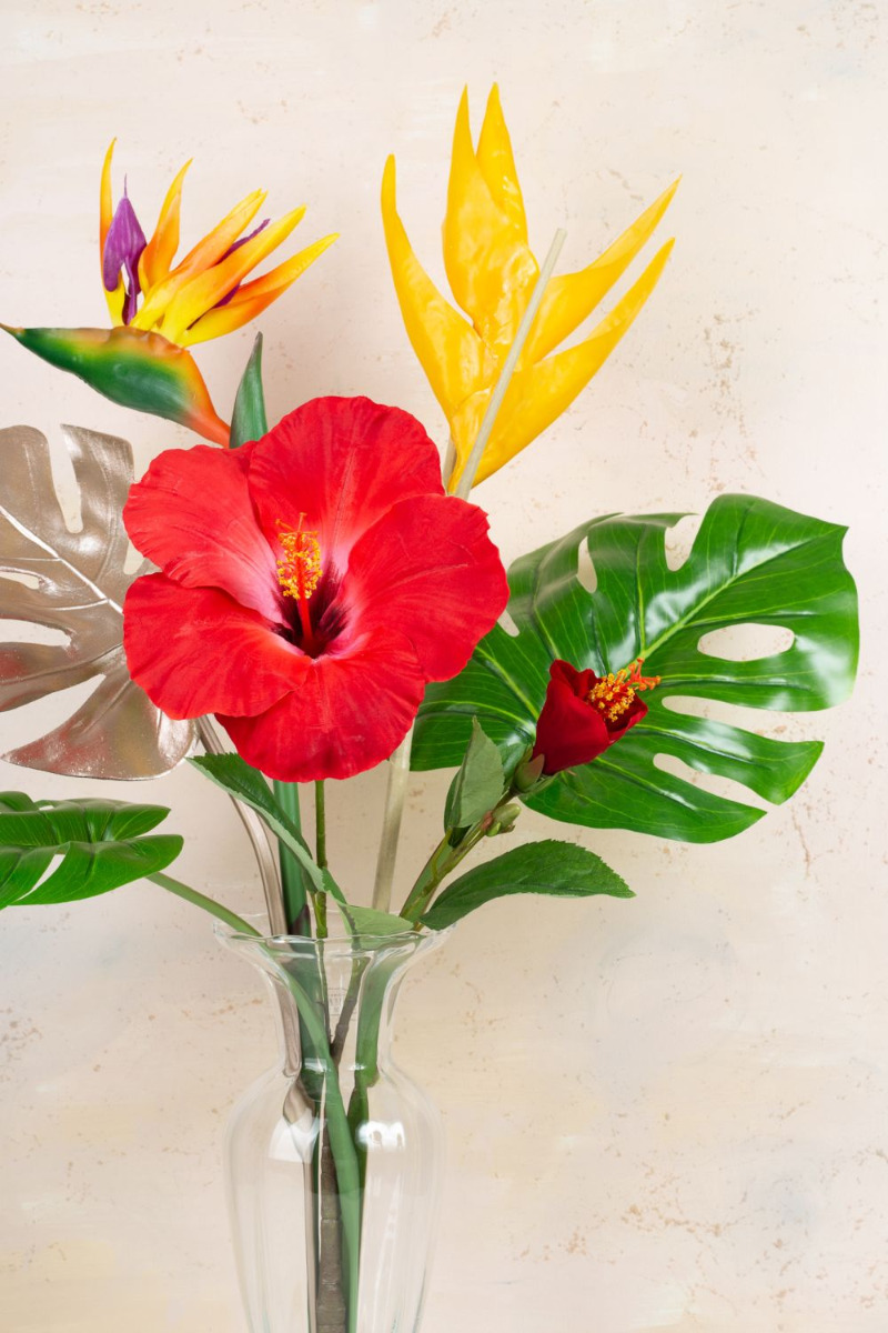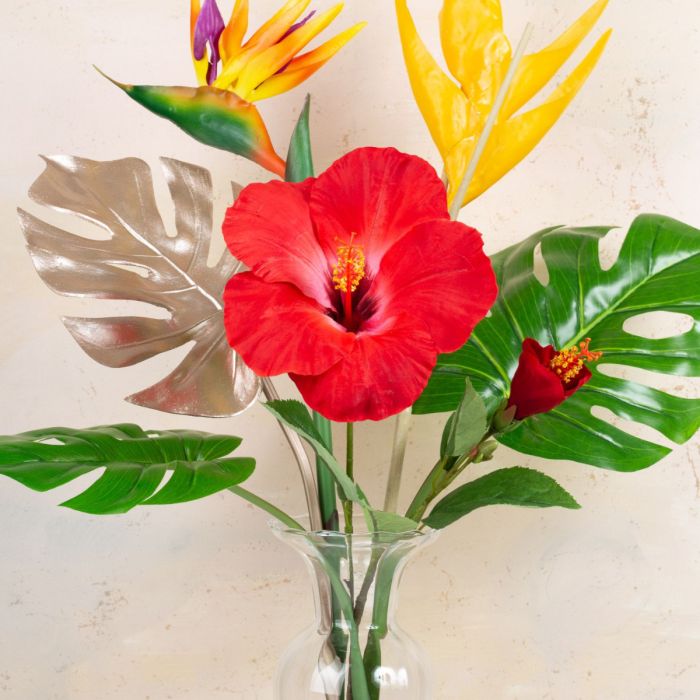 Exotic branches! You want to bring summer into your home? Then this combination of exotic flowers, split Monstera leaves and elegant narrow vase is just the thing for you. The red hibiscus flower at the centre is surrounded by monstera leaves in champagne and green. A colourful strelitzia flower and an orange heliconia flower stand out elegantly from the bouquet in the background. A flower ensemble that makes you want to enjoy the sun, beach and sea with a delicious ice cream in your hand. Do you also want to give your living space a new shine? Shop the Look!