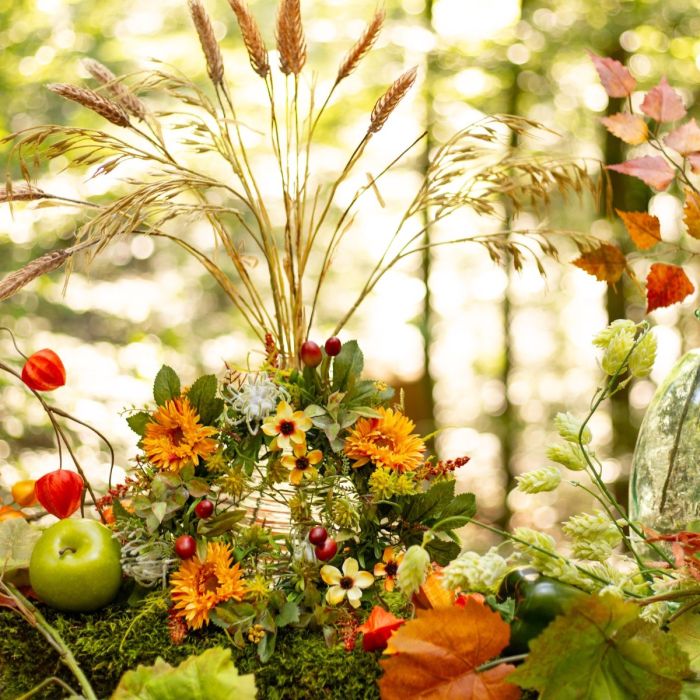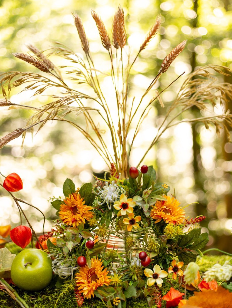 Giving thanks for a bountiful harvest!" The fruit of the earth and human labour are celebrated on Thanksgiving Day. A once pagan custom that has been celebrated since the 7th century. For this look, we have created a bouquet of wheat ears as the centrepiece, which is held in a bottle with grooves. An autumnal wreath leans against the bottle and a few fruits frame the bouquet. Shop the look!