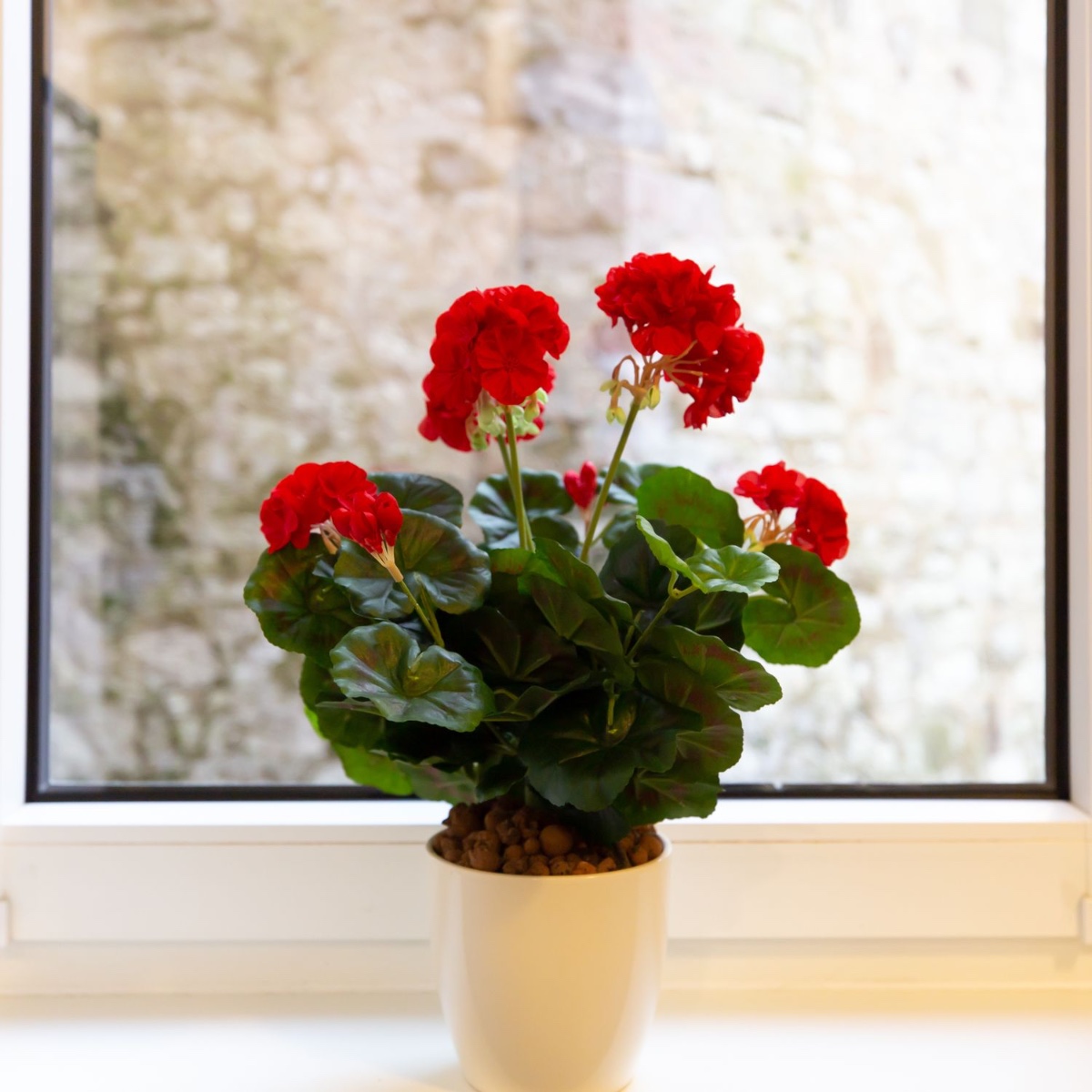 A bright red! Geraniums never go out of fashion. In summer, they often adorn balcony railings with their bright colours. Our fiery red geranium looks so real that you have to be careful not to water it by mistake, because the plant granulate, which is also suitable for real plants, literally invites you to do so. Shop the Look!