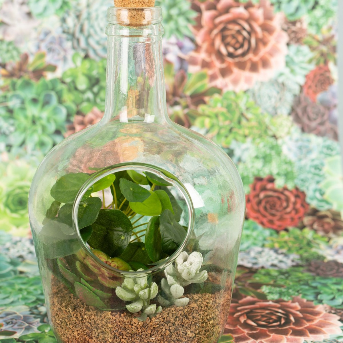Design tip: Put the cork granules in the bottle and distribute the succulents so that each element is visible. The large ones to the back, the small ones to the front.