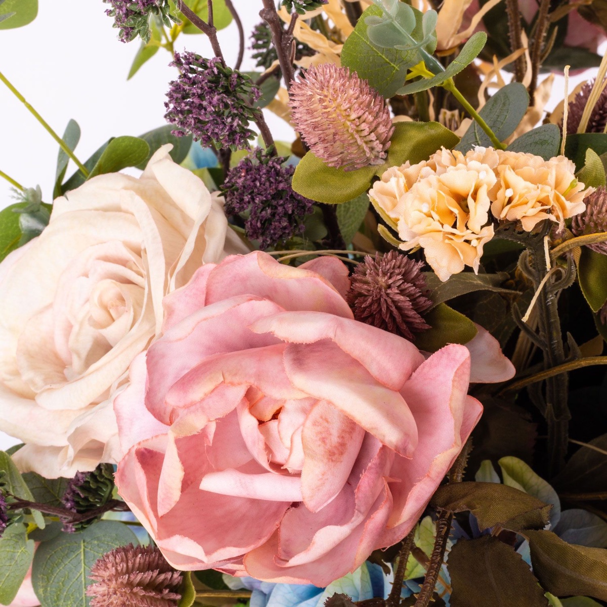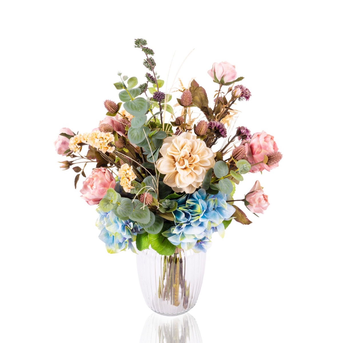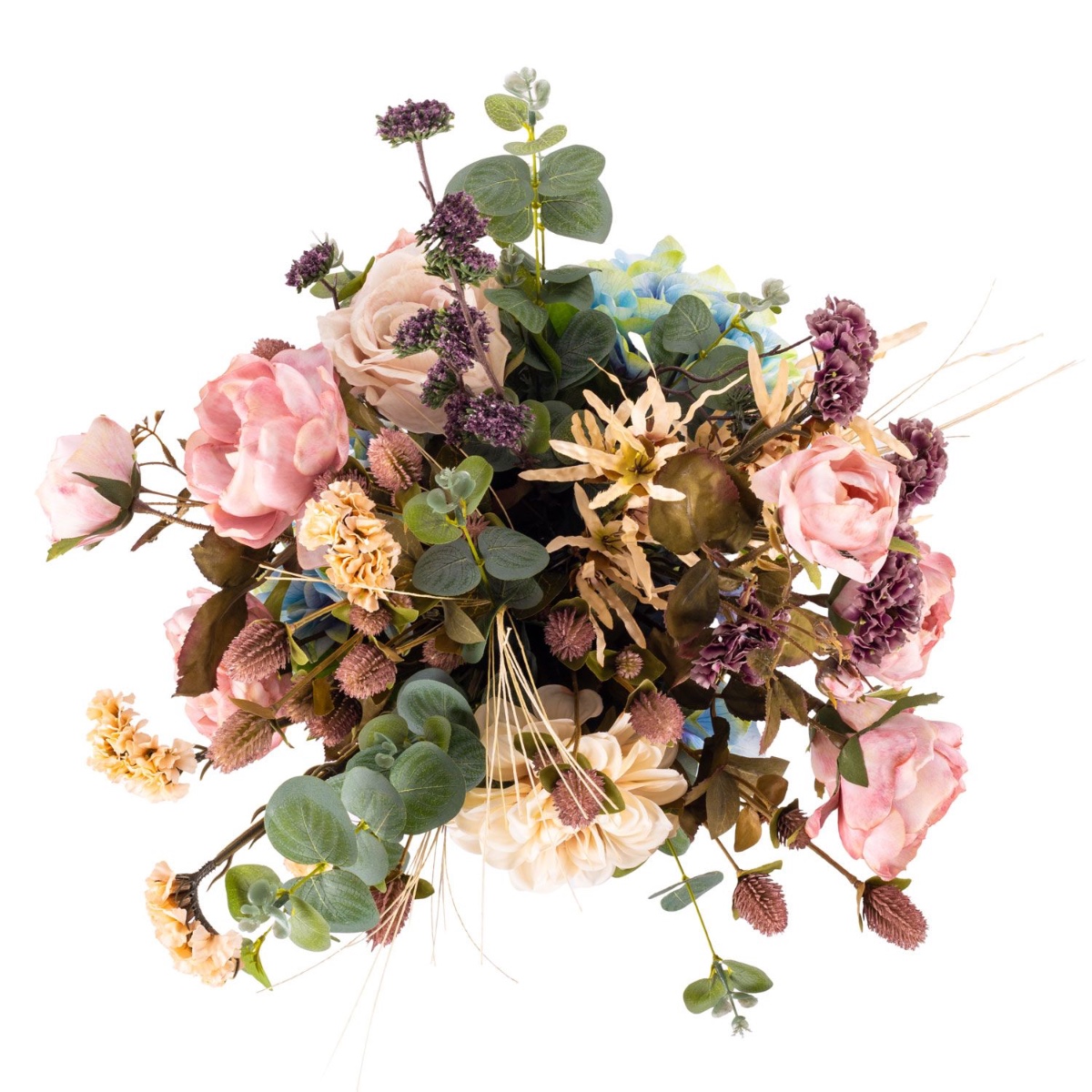A multitude of delicate flowers surround the lush hydrangea heads of the autumnal bouquet TRIANA. The colour combination is perfectly harmonious and awakens a sense of anticipation for autumn. The warmth represented by the colours of this bouquet brings cosiness into your home. Your table setting will be complemented by this autumn bouquet, and the lifelike appearance of the flowers makes them almost indistinguishable from the real thing.
