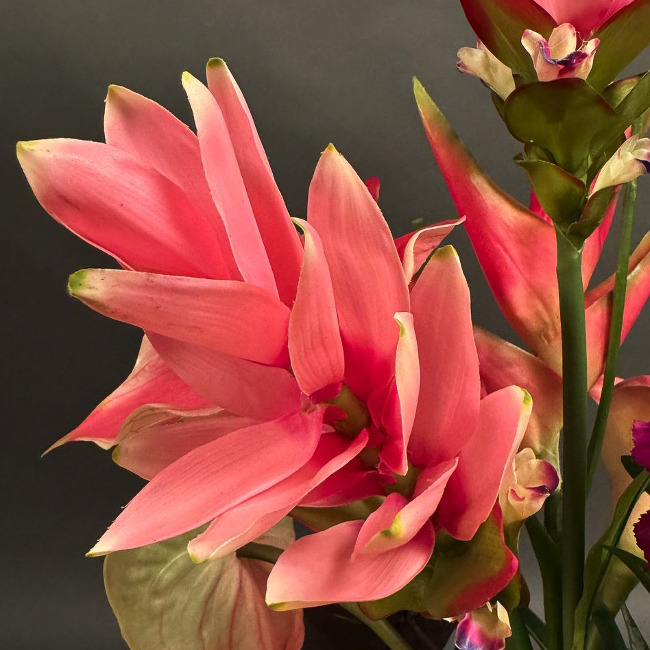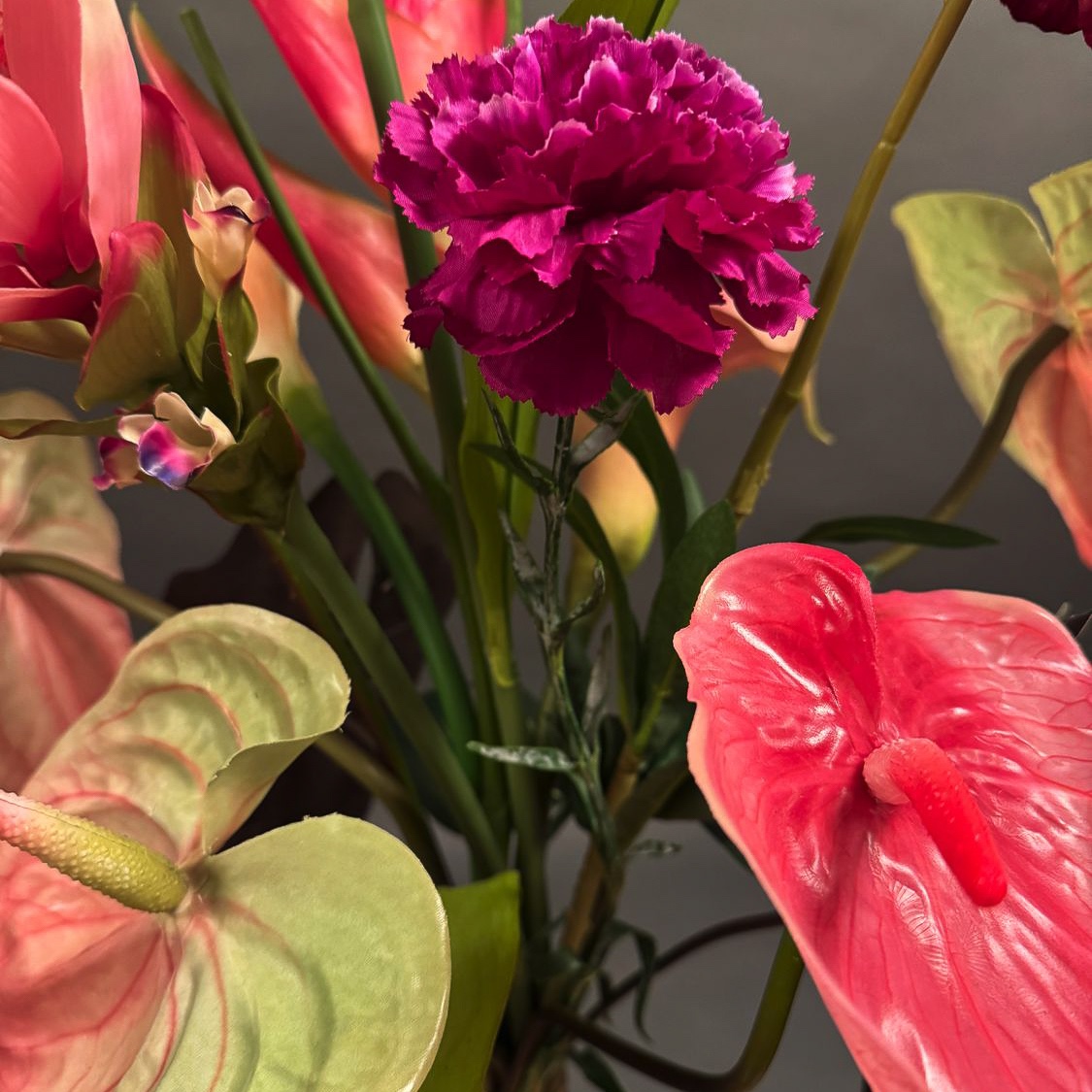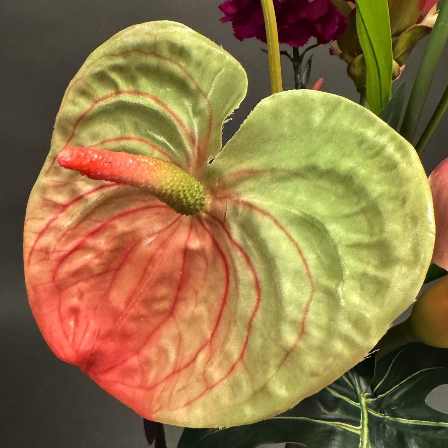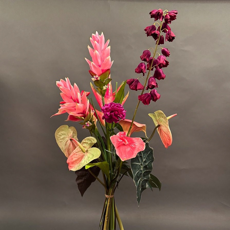 Flower show! This tropical bouquet caught Josef's eye during an appointment. He asked us to recreate the summery arrangement, which is particularly reminiscent of tropical gardens or faraway countries. The bouquet is truly eye-catching and creates a real holiday atmosphere. Exotic flowers such as anthuriums and heliconias stand out in particular and emphasise the asymmetrical design of the ensemble. Perfect as an eye-catcher in modern rooms or as a gift for people with a penchant for the extraordinary. Shop the look!