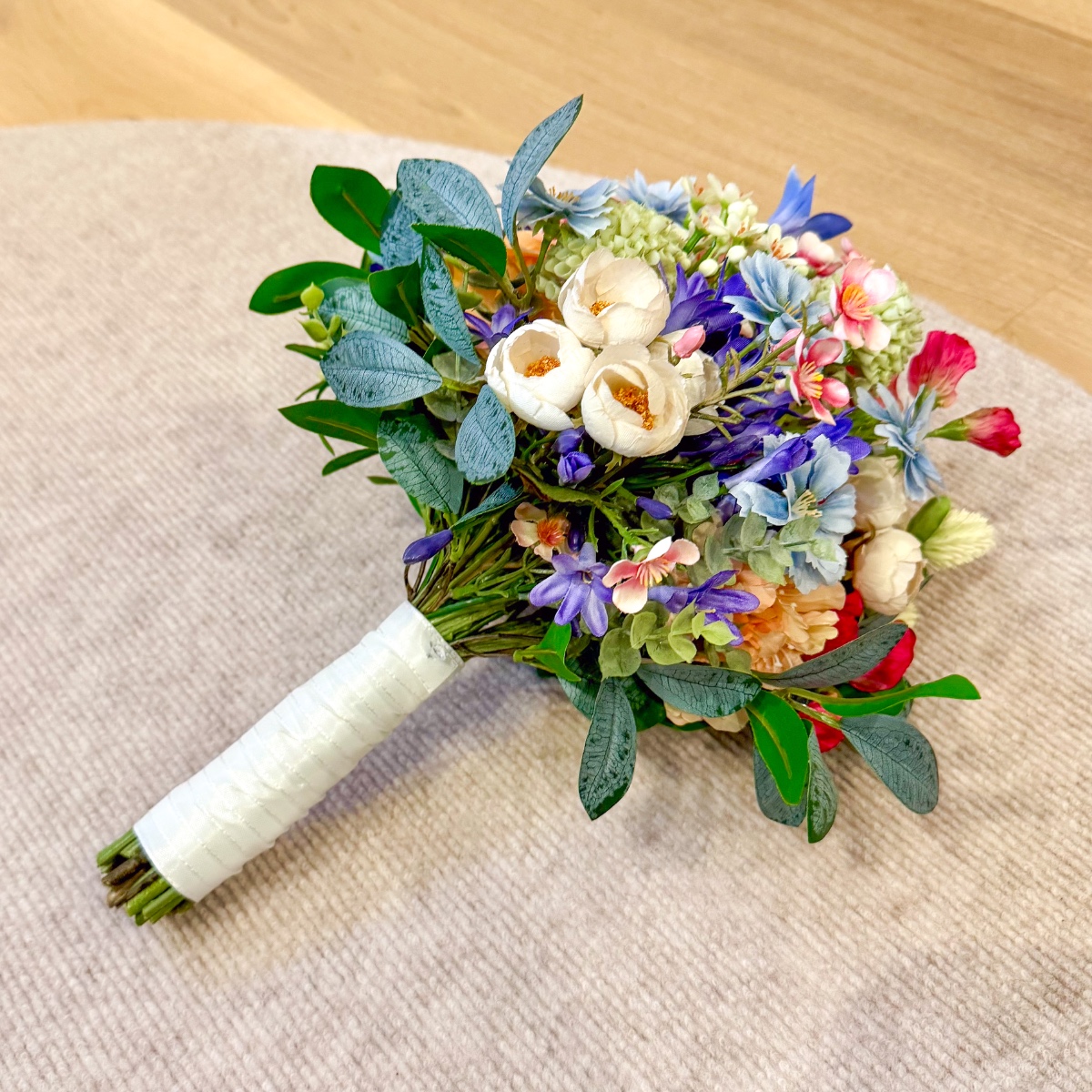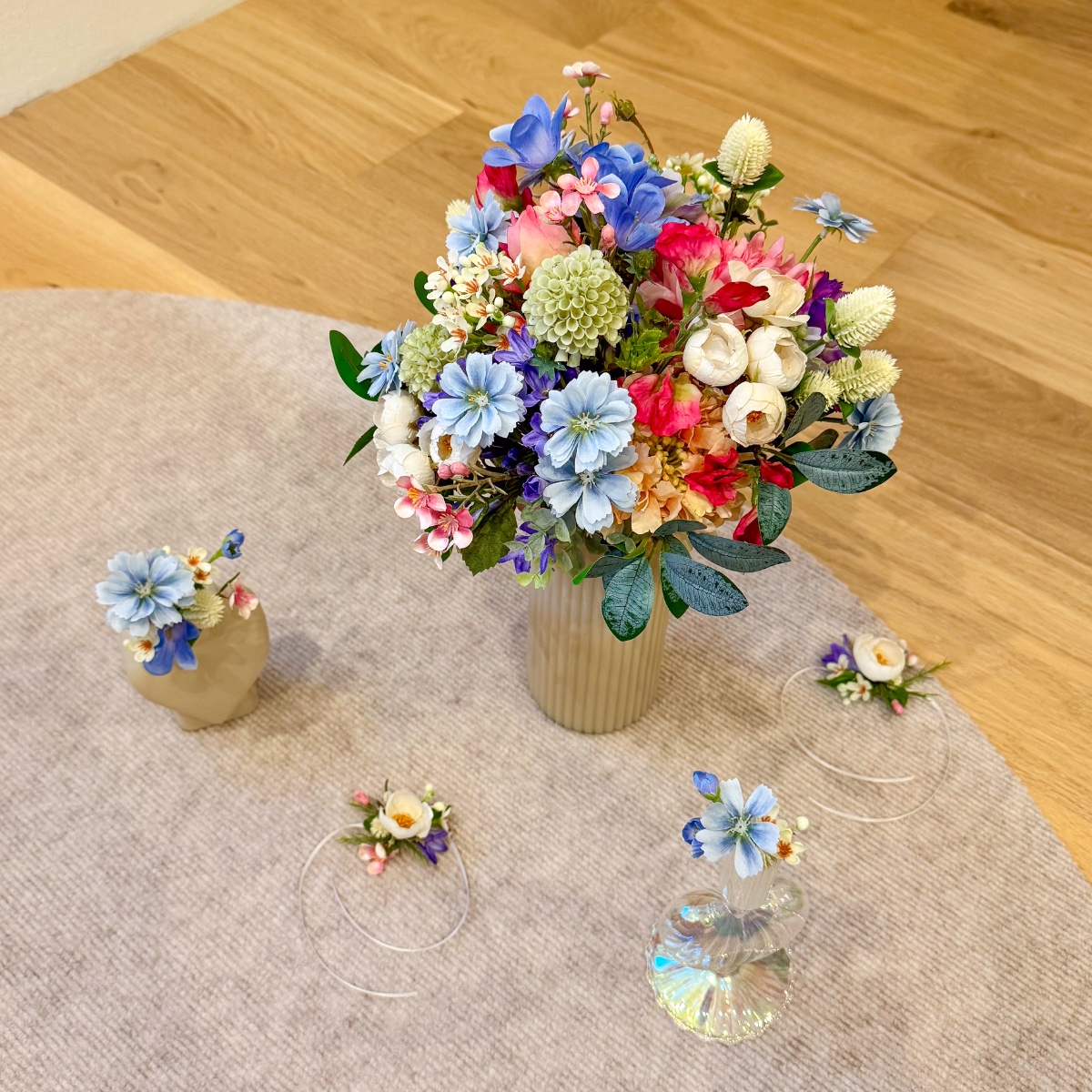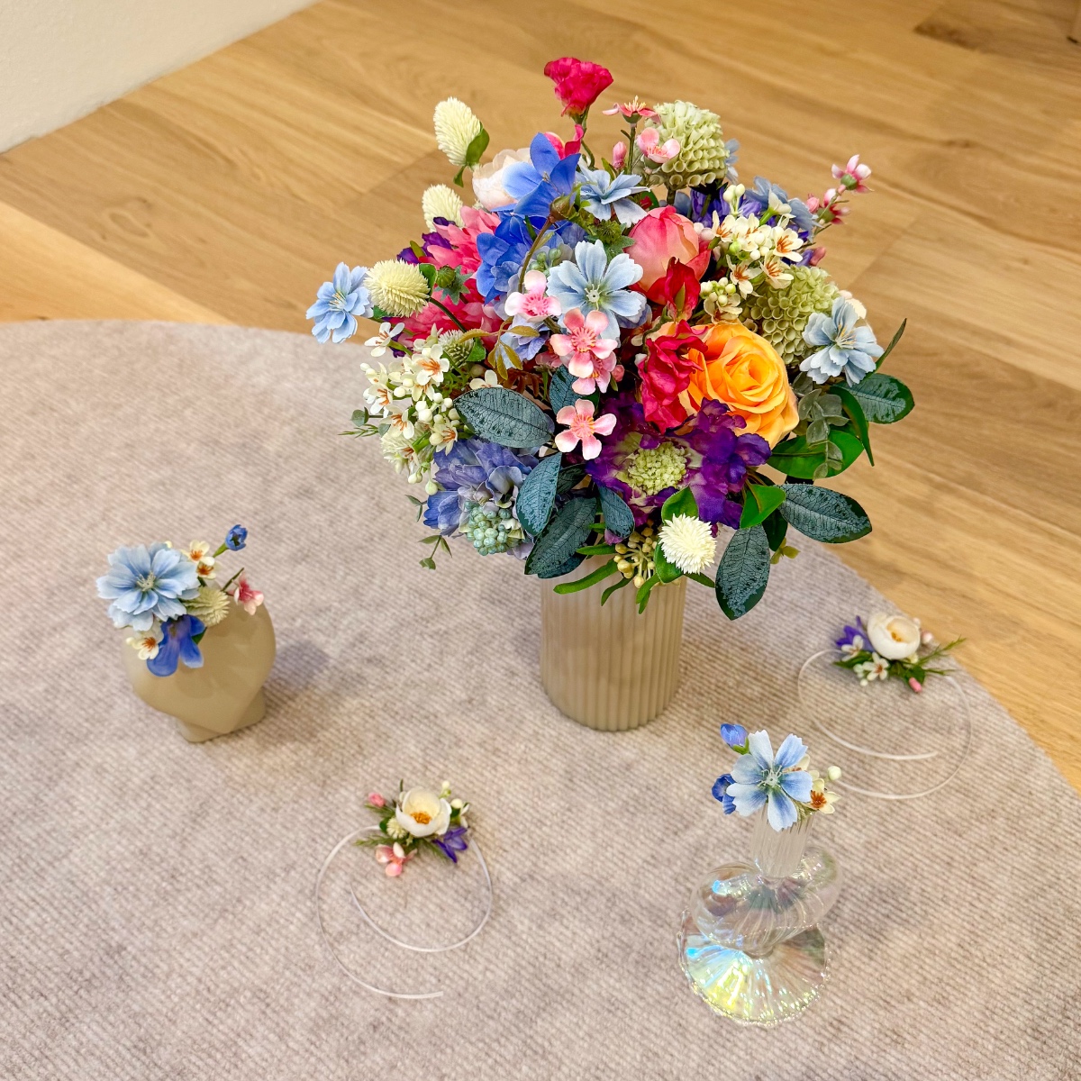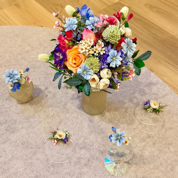 A Tuscan wedding in wildflower style! For her dream wedding in Tuscany, Italy, our client Corinna needed not only a bridal bouquet, but also floral boutonnieres for the groom and her son, as well as artistic bracelets for her two daughters. The chosen colour scheme of white and dove blue – to match the dress and hair accessories – was to be maintained, but at the same time brightened up with a few splashes of colour in the form of colourful meadow flowers. Our creative team got straight to work: for the blue-and-white arrangement, we used snowdrops, bellflowers, scabious sprigs, cabbage roses and waxflowers. Wildflowers such as sweet peas, dahlias, agapanthus and globe amaranth provided a splash of colour. Various eucalyptus branches gently frame the small but exquisite bouquet. For the corsages and bracelets, short-stemmed branches of the same flowers were cut off and tied together using paper wire, ribbons and pins. Would you also like an artificial bridal bouquet and floral wedding decorations? Shop the Look!