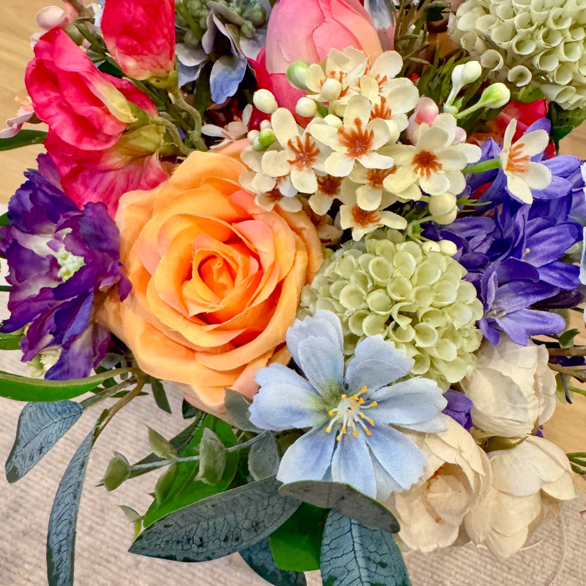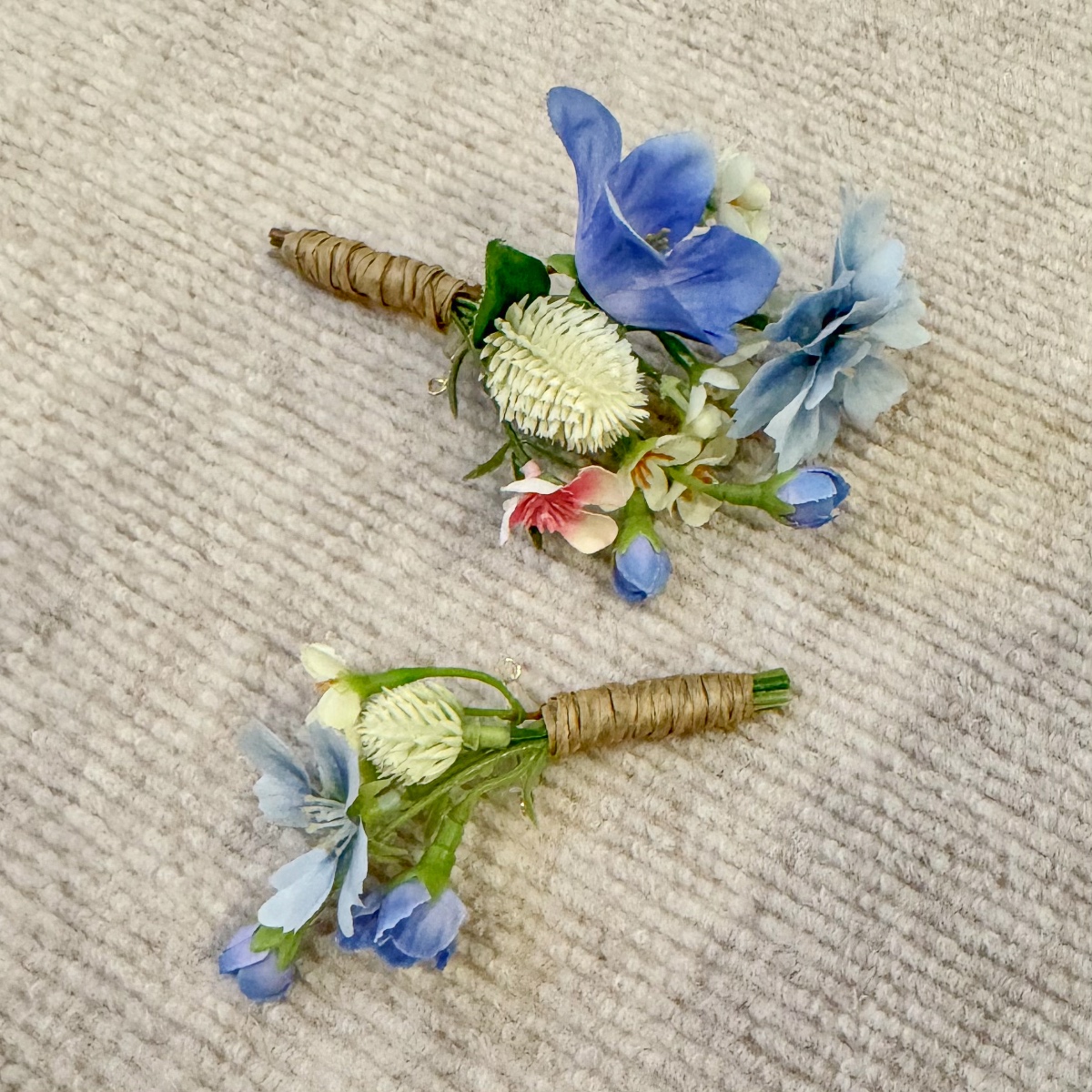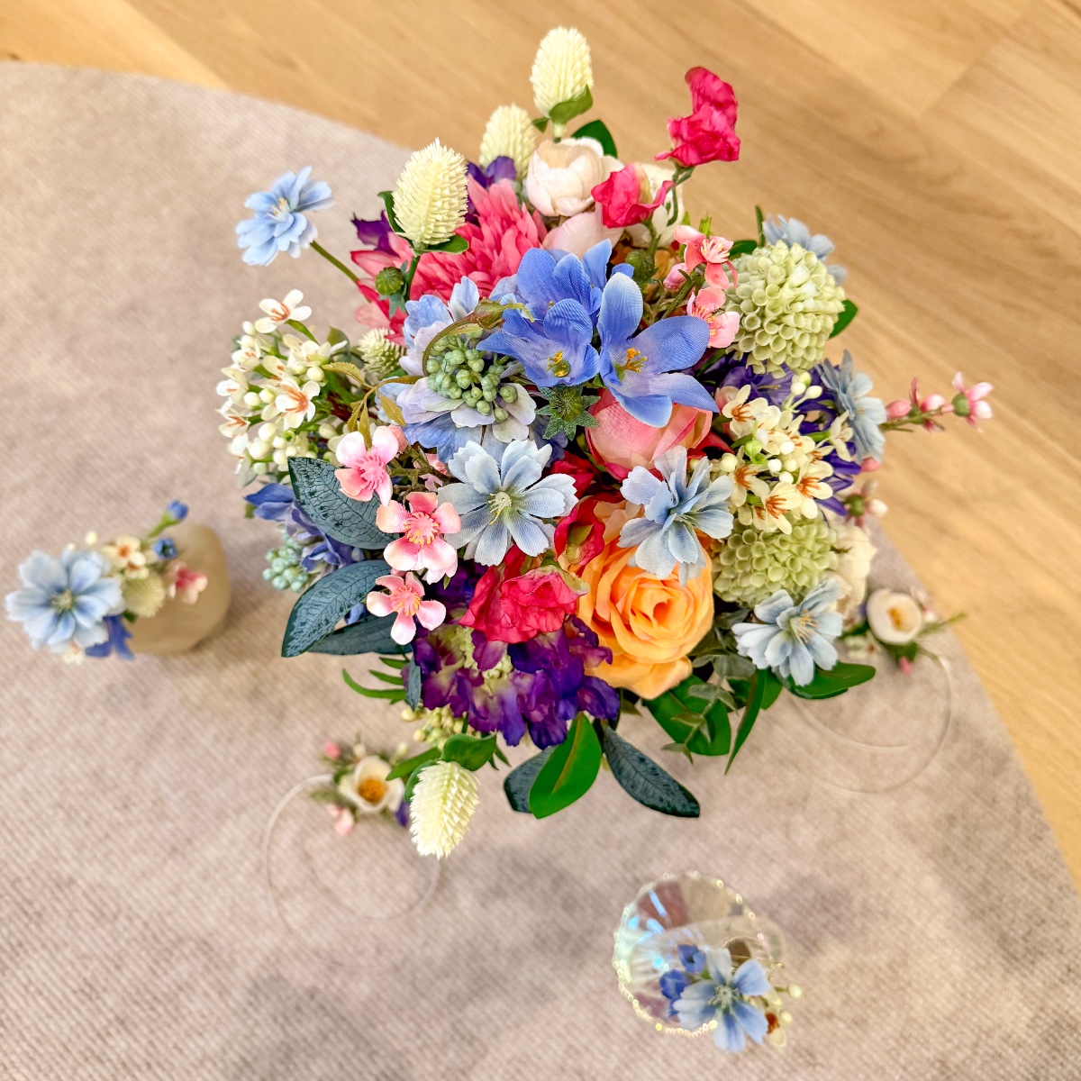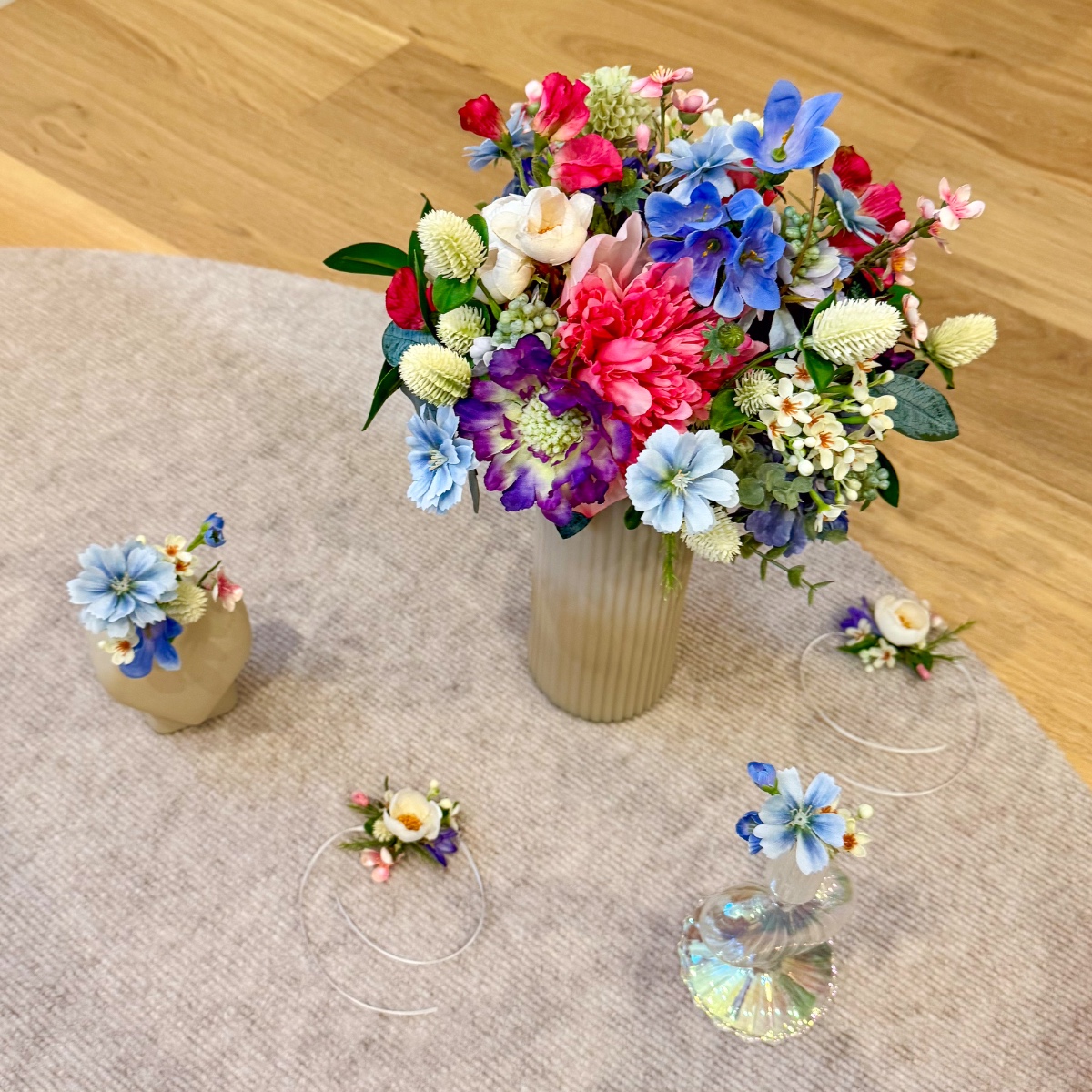 A Tuscan wedding in wildflower style! For her dream wedding in Tuscany, Italy, our client Corinna needed not only a bridal bouquet, but also floral boutonnieres for the groom and her son, as well as artistic bracelets for her two daughters. The chosen colour scheme of white and dove blue – to match the dress and hair accessories – was to be maintained, but at the same time brightened up with a few splashes of colour in the form of colourful meadow flowers. Our creative team got straight to work: for the blue-and-white arrangement, we used snowdrops, bellflowers, scabious sprigs, cabbage roses and waxflowers. Wildflowers such as sweet peas, dahlias, agapanthus and globe amaranth provided a splash of colour. Various eucalyptus branches gently frame the small but exquisite bouquet. For the corsages and bracelets, short-stemmed branches of the same flowers were cut off and tied together using paper wire, ribbons and pins. Would you also like an artificial bridal bouquet and floral wedding decorations? Shop the Look!