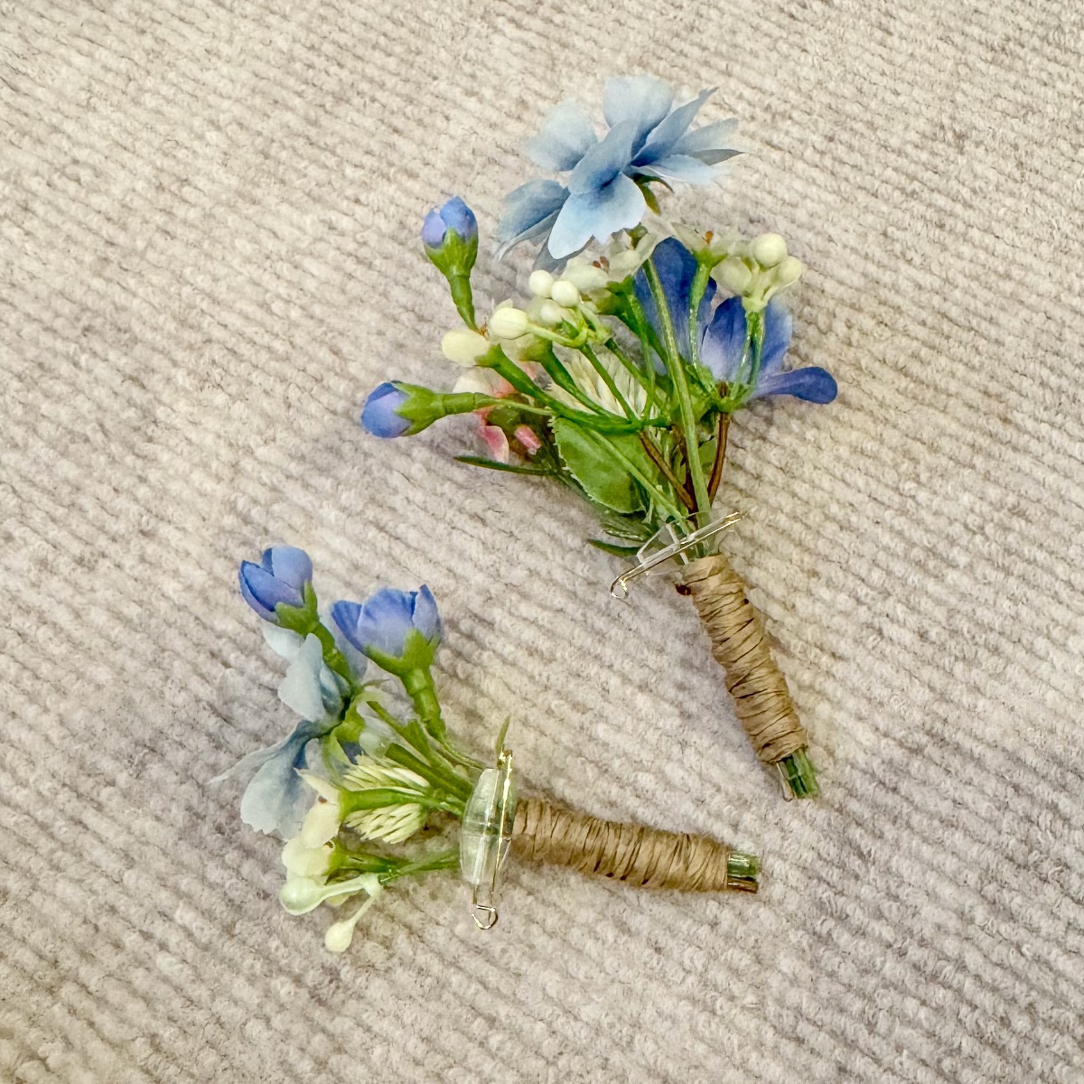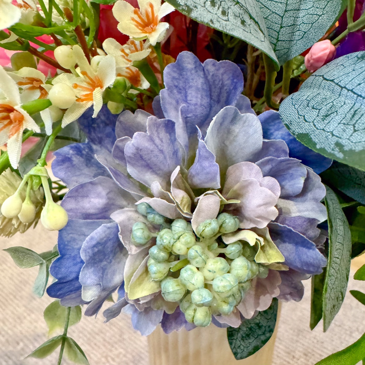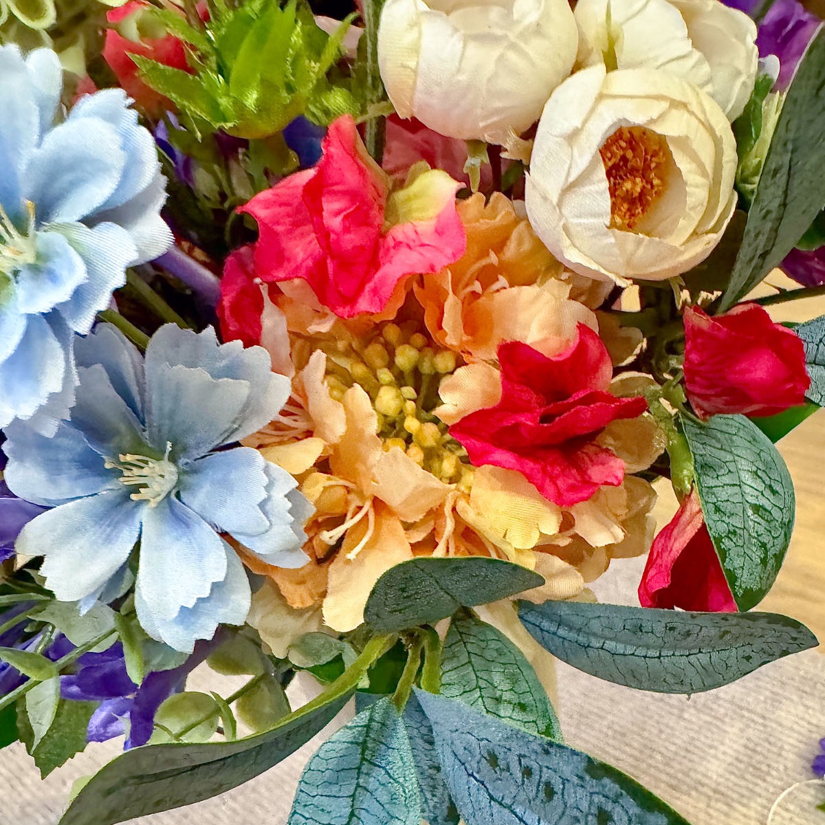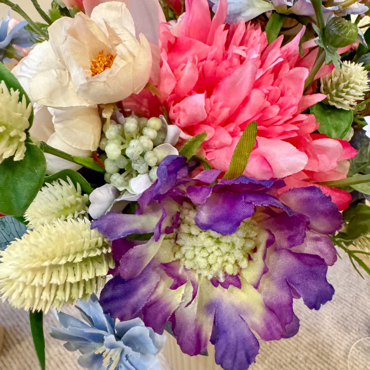 A Tuscan wedding in wildflower style! For her dream wedding in Tuscany, Italy, our client Corinna needed not only a bridal bouquet, but also floral boutonnieres for the groom and her son, as well as artistic bracelets for her two daughters. The chosen colour scheme of white and dove blue – to match the dress and hair accessories – was to be maintained, but at the same time brightened up with a few splashes of colour in the form of colourful meadow flowers. Our creative team got straight to work: for the blue-and-white arrangement, we used snowdrops, bellflowers, scabious sprigs, cabbage roses and waxflowers. Wildflowers such as sweet peas, dahlias, agapanthus and globe amaranth provided a splash of colour. Various eucalyptus branches gently frame the small but exquisite bouquet. For the corsages and bracelets, short-stemmed branches of the same flowers were cut off and tied together using paper wire, ribbons and pins. Would you also like an artificial bridal bouquet and floral wedding decorations? Shop the Look!