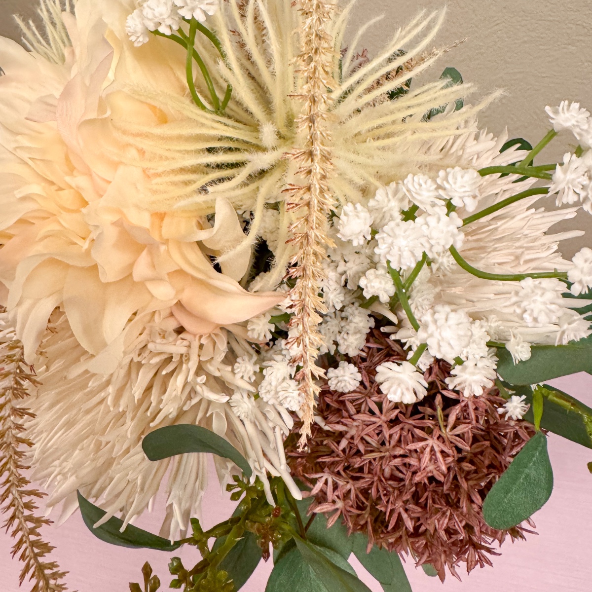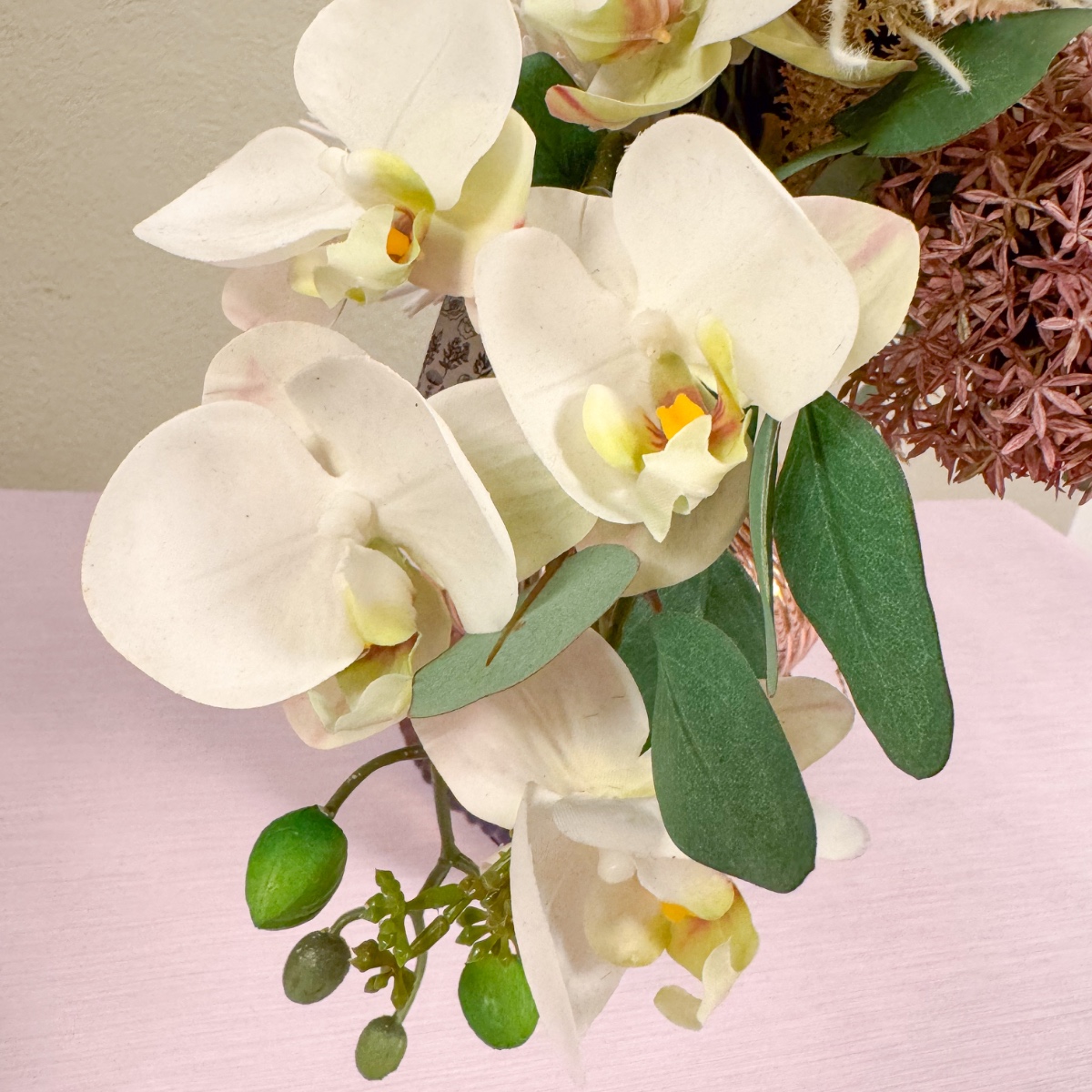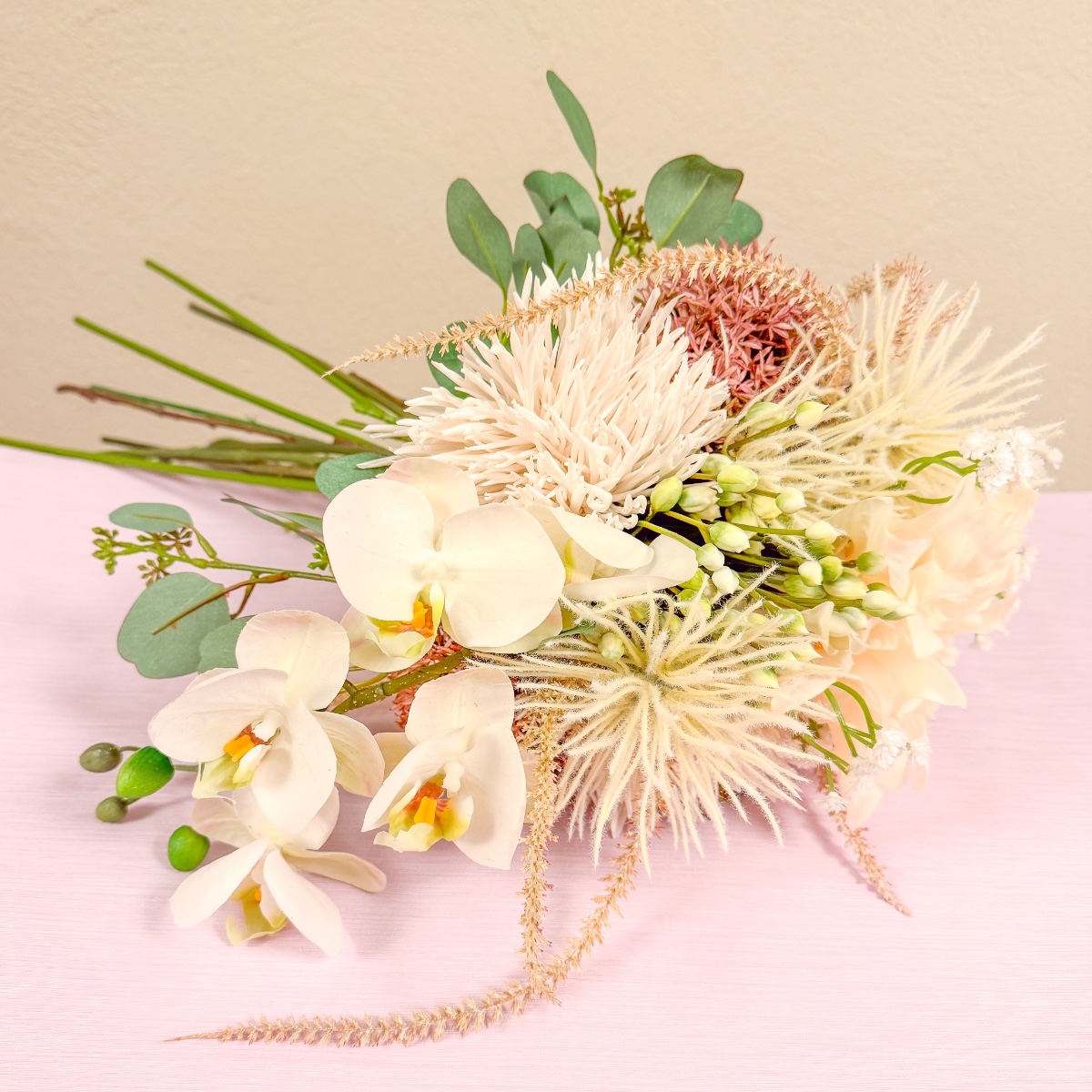 Wild chrysanthemums and elegant orchids! The only thing missing from her delicate blush wedding dress was the perfect bridal bouquet. Orchids were a must – combined with flowers that perfectly matched the colour of the dress. The result was an elegant bouquet that picked up the soft tones of the outfit and stylishly completed Celina's look. Shop the look!