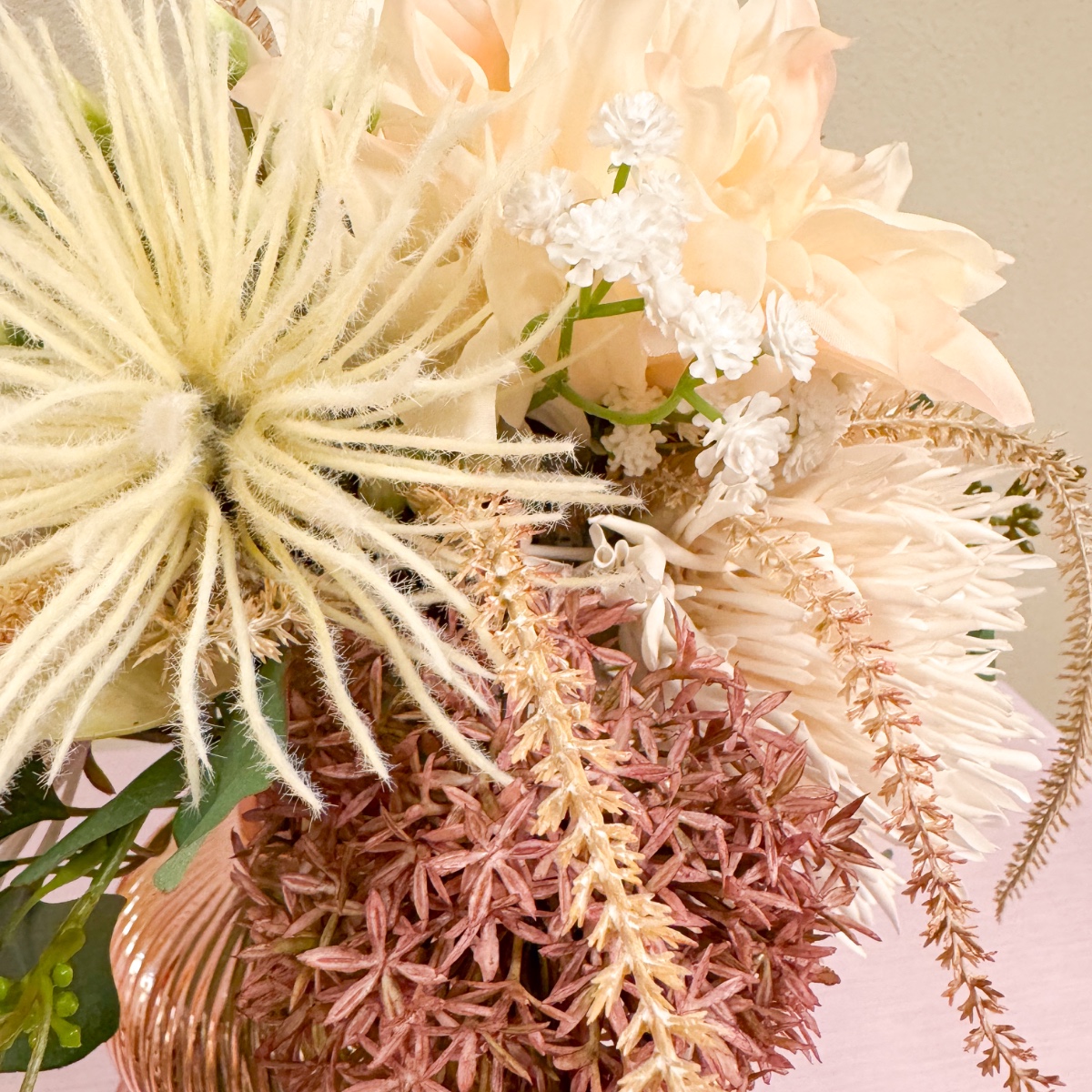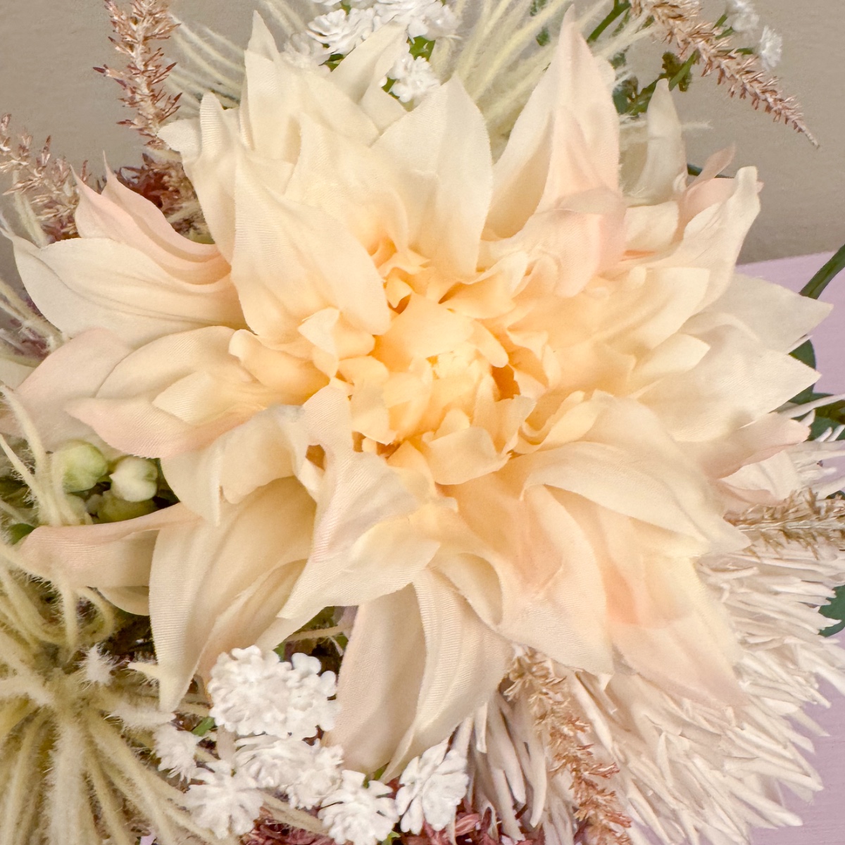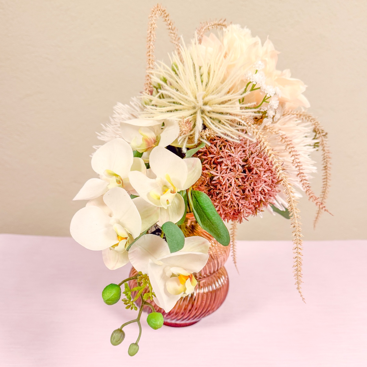 Wild chrysanthemums and elegant orchids! The only thing missing from her delicate blush wedding dress was the perfect bridal bouquet. Orchids were a must – combined with flowers that perfectly matched the colour of the dress. The result was an elegant bouquet that picked up the soft tones of the outfit and stylishly completed Celina's look. Shop the look!