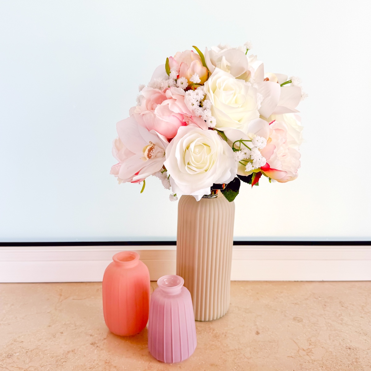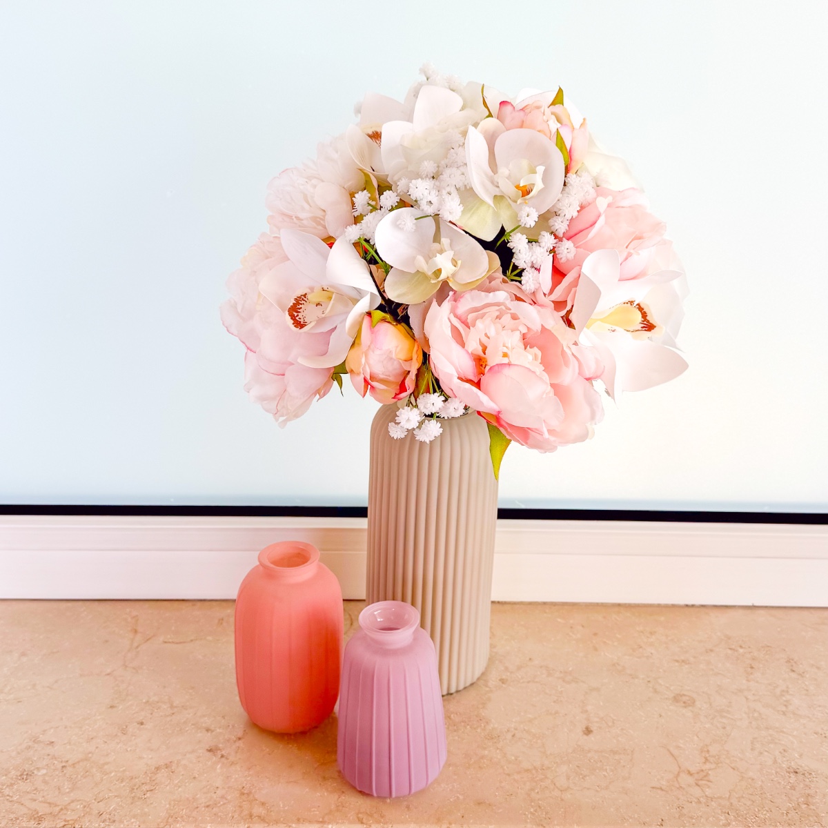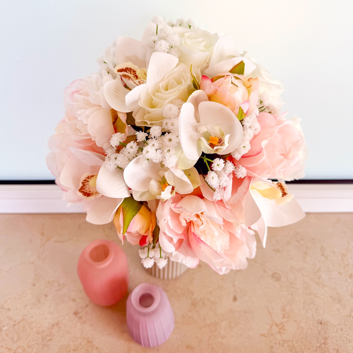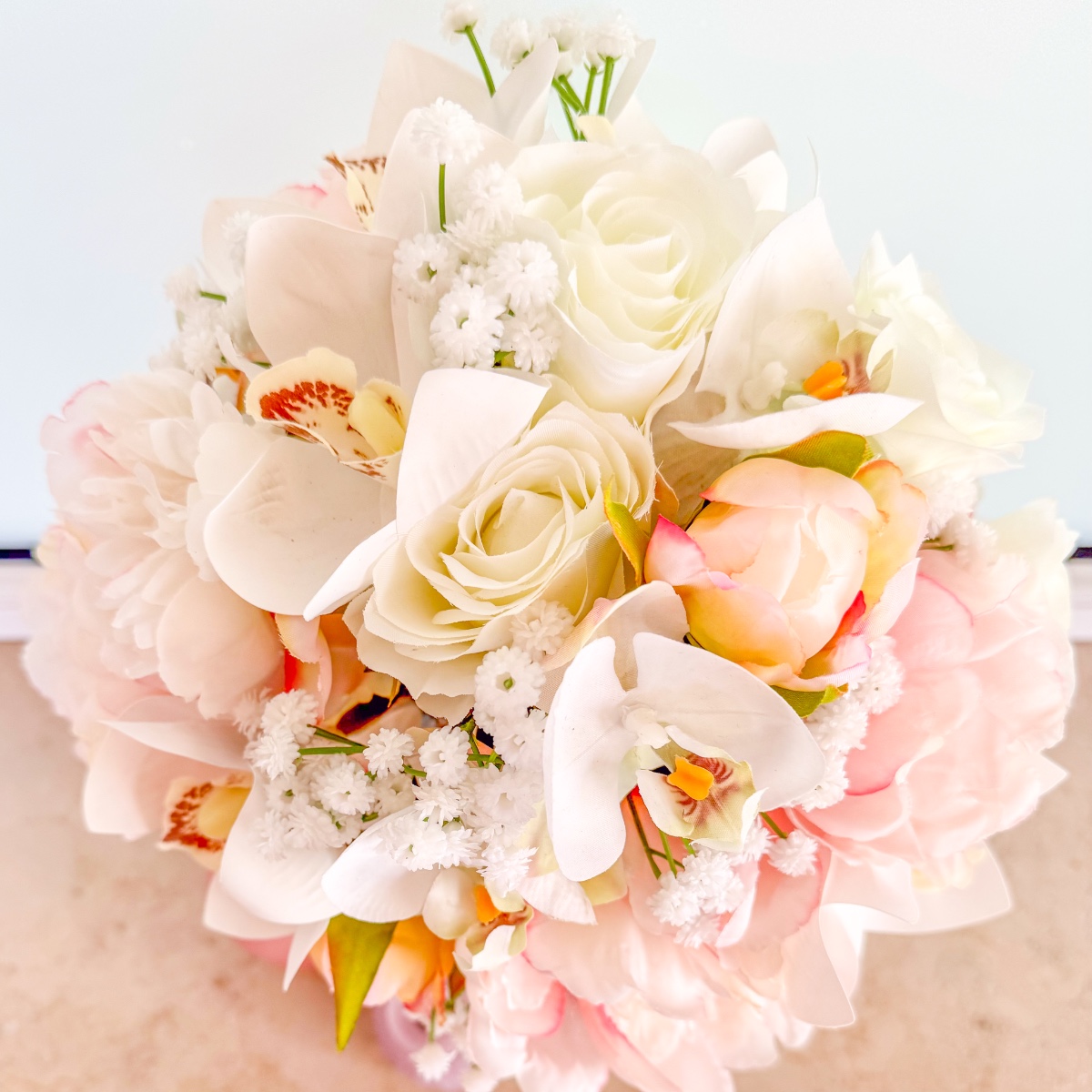 The blossom of elegance – your dream bouquet for your special day! An elegant bridal bouquet that combines timeless elegance with romantic delicacy. The magnificent white Cymbidium and Phalaenopsis orchids form the centrepiece of this creation and give the bouquet an exclusive, luxurious look. Delicate pink peonies add a playful touch, while classic white roses symbolise pure purity. Fine gypsophila completes the arrangement, adding lightness and harmony. Let yourself be enchanted by this wedding bouquet and make your day unforgettable! Shop the look!