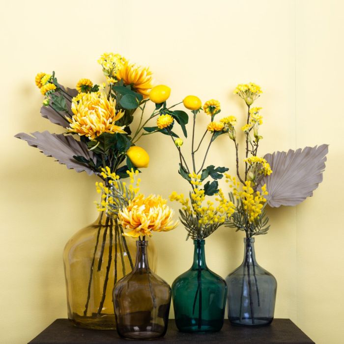...the possibilities are endless! A lemon branch as part of a bouquet? That's only possible with Artplants! Our look is quite yellow! And that's what we wanted to achieve with this look. Yellow is the colour of cheerfulness and positivity. This is also the effect of our look, consisting of chrysanthemums, mimosa and maple blossoms. Framed by a palm frond, the colouring stays discreetly in the background and gives the flowers even more luminosity. The glass balloon bottles come in so many colours, they just go with everything! Shop the Look!