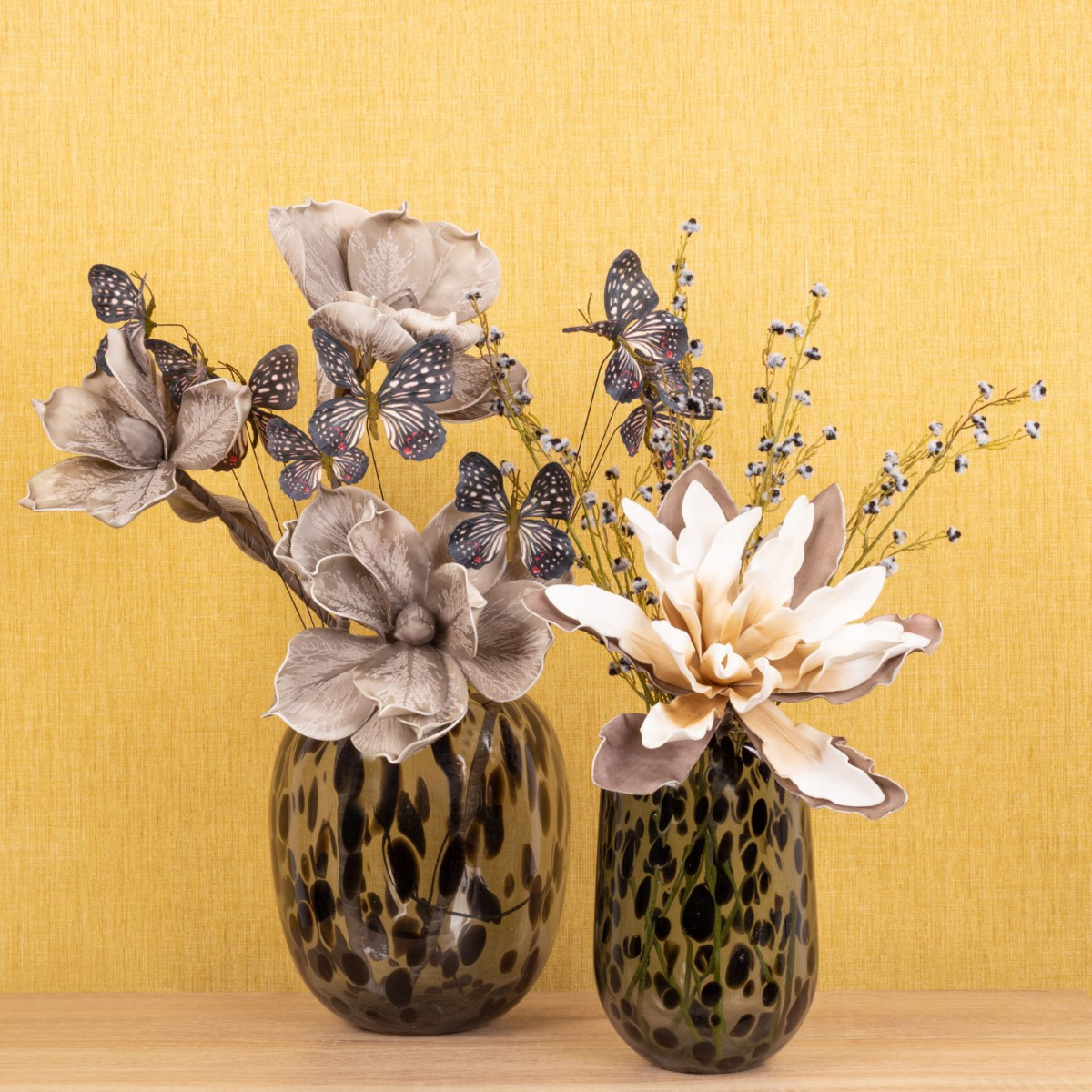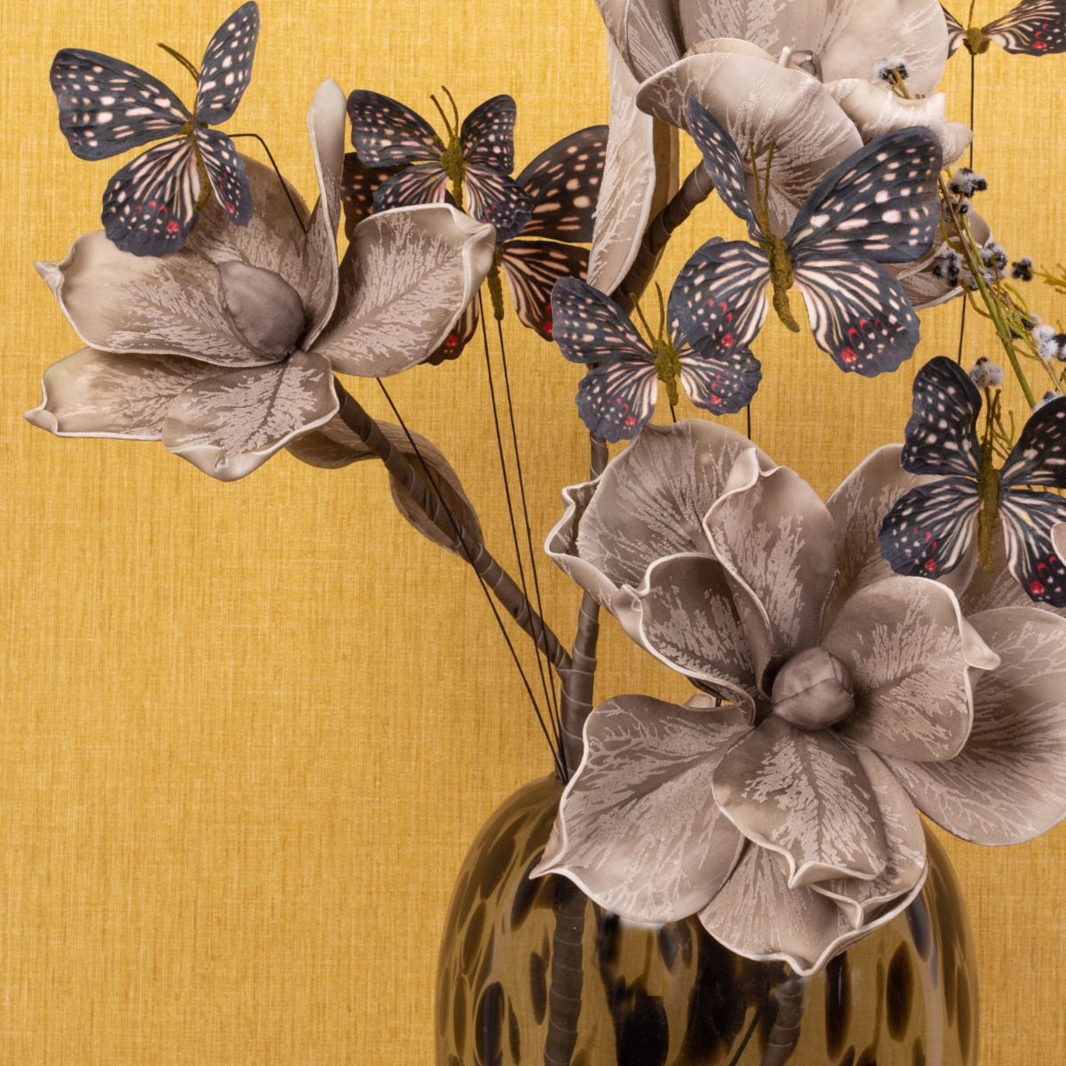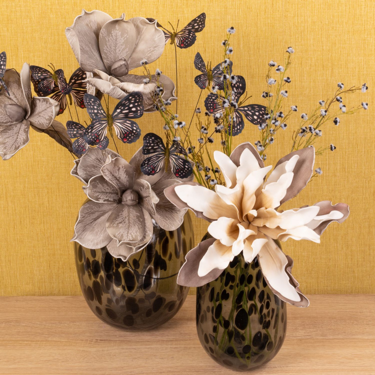 Romanticism and melancholy! This wintry mood is created in our fancy look with artificial flowers that appear as if they are from a dream world. Large flowers that are soft to the touch and contribute to a melancholy mood with warm grey tones. Butterflies symbolise dreams and wishes that flutter in our hearts and remind us of the warm season. This look becomes particularly trendy with the vases in leo design, which are an eye-catcher in every living room. You too can dream with this beautiful arrangement of artificial flowers! Shop the Look!