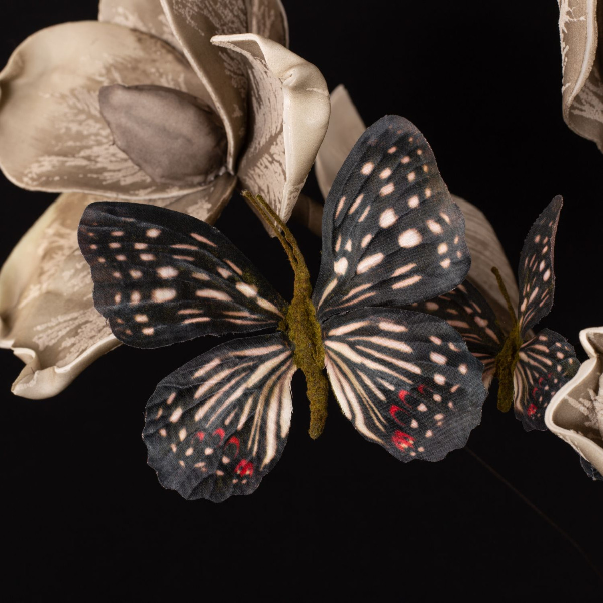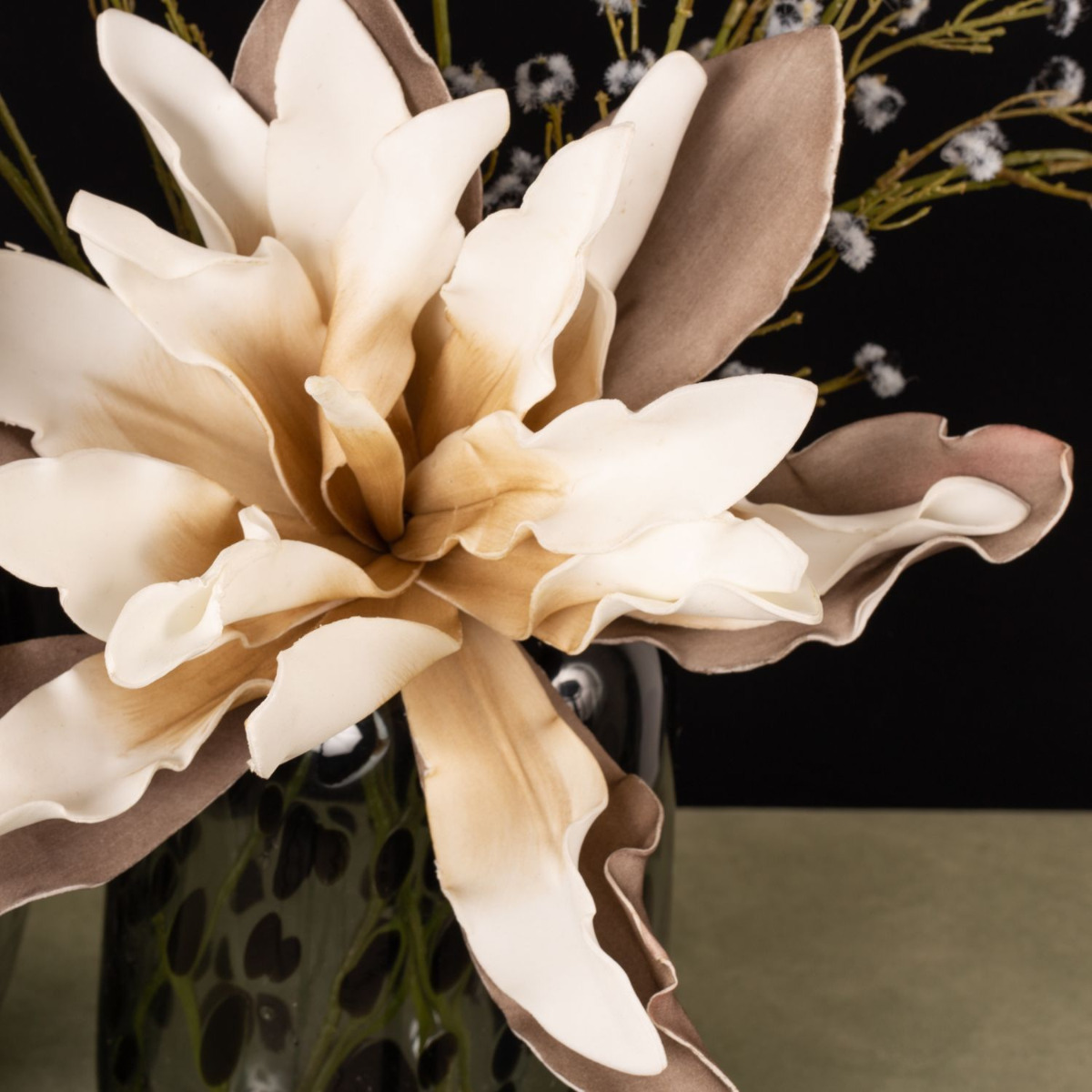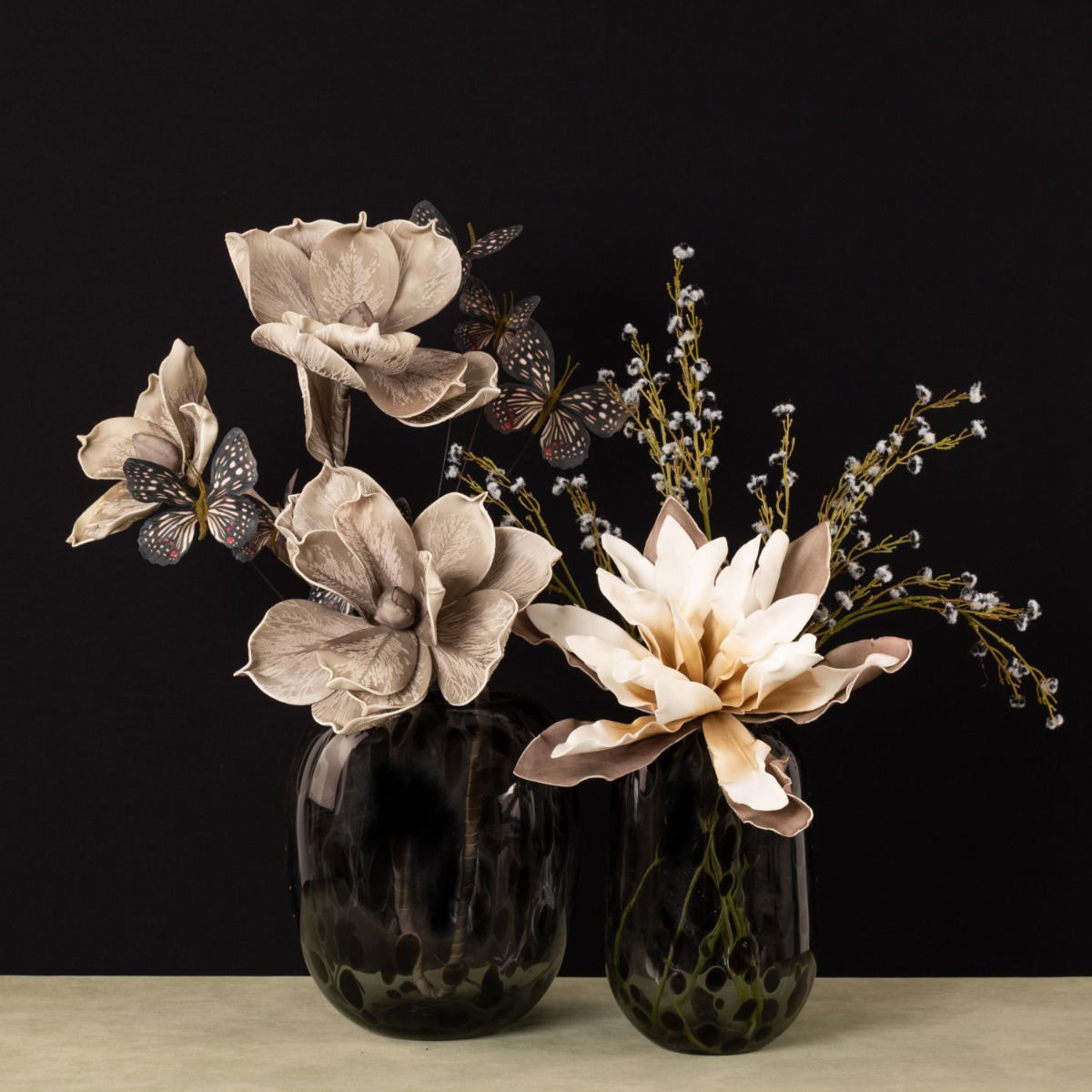 Romanticism and melancholy! This wintry mood is created in our fancy look with artificial flowers that appear as if they are from a dream world. Large flowers that are soft to the touch and contribute to a melancholy mood with warm grey tones. Butterflies symbolise dreams and wishes that flutter in our hearts and remind us of the warm season. This look becomes particularly trendy with the vases in leo design, which are an eye-catcher in every living room. You too can dream with this beautiful arrangement of artificial flowers! Shop the Look!