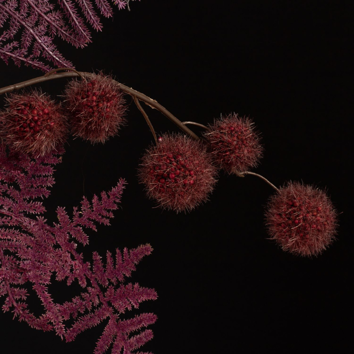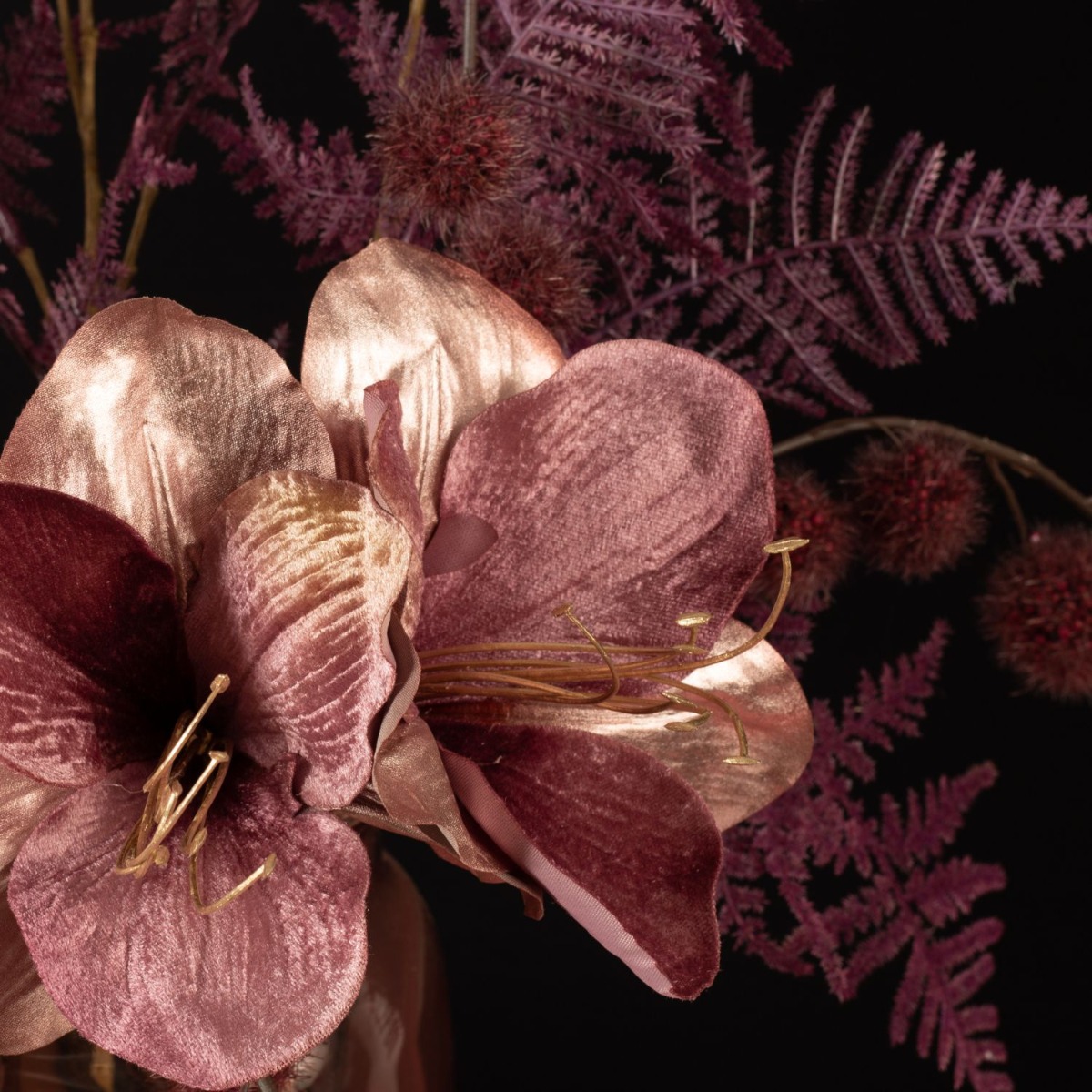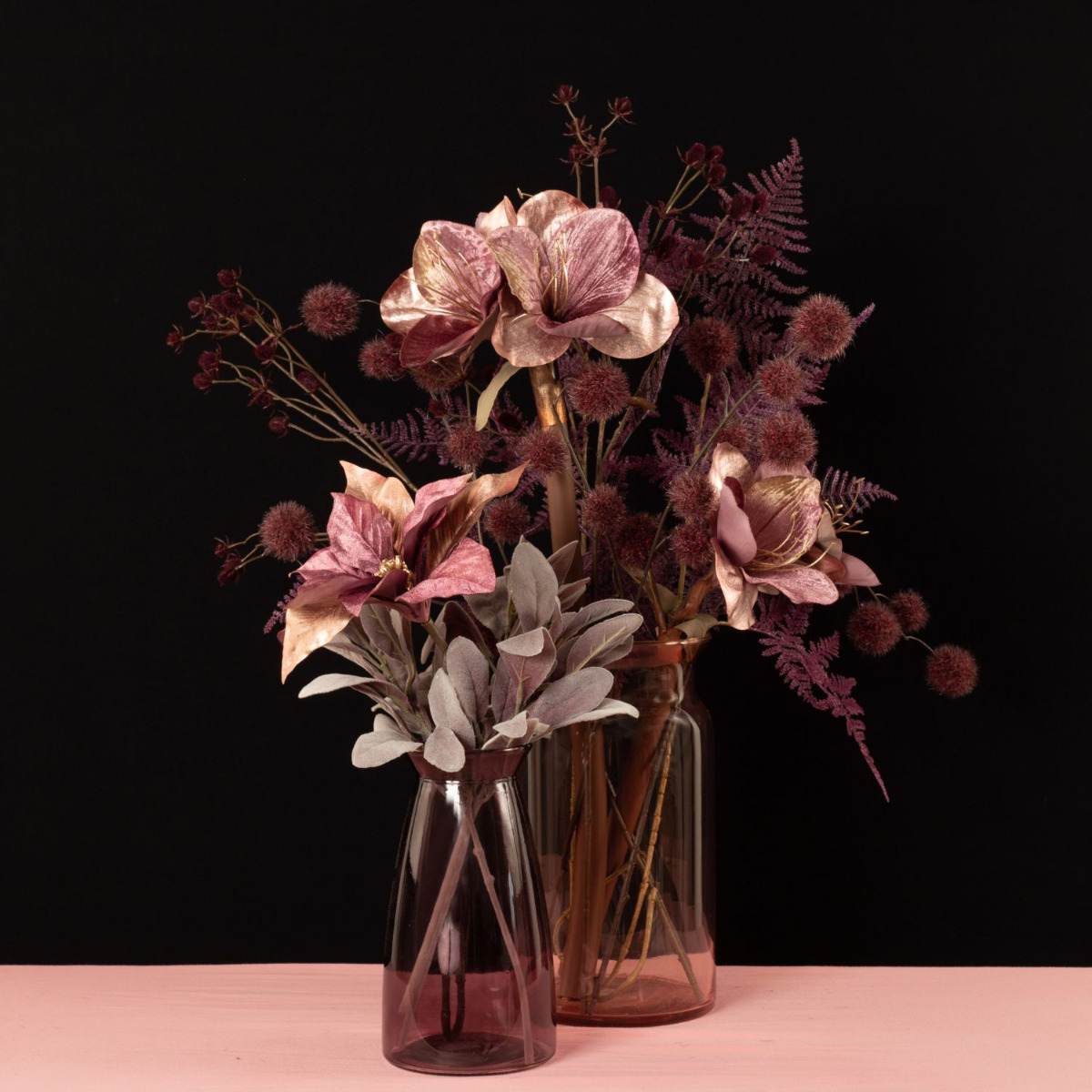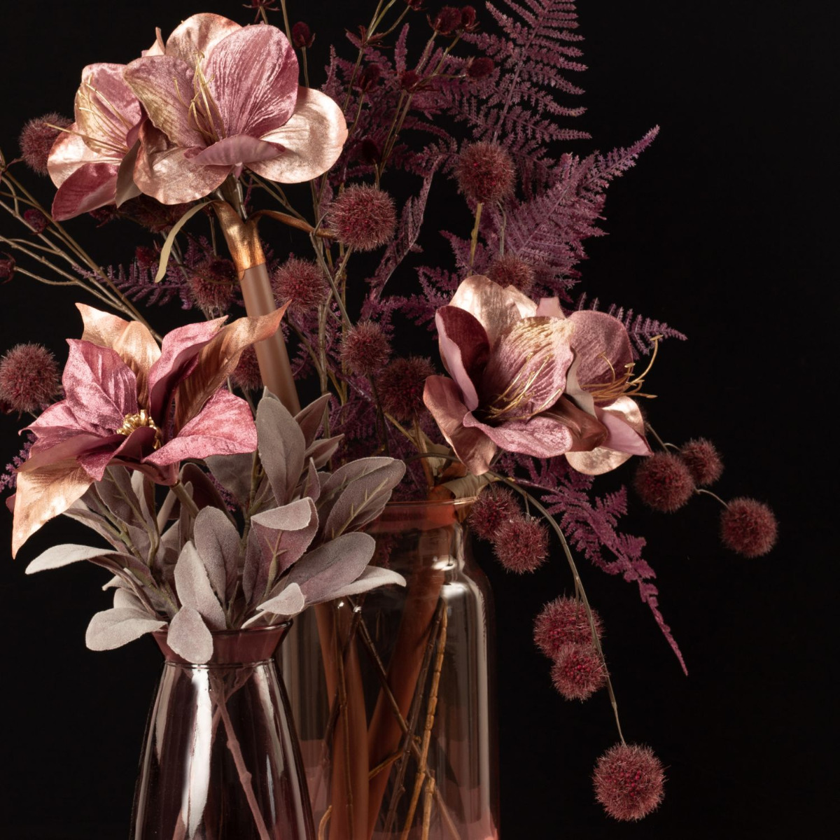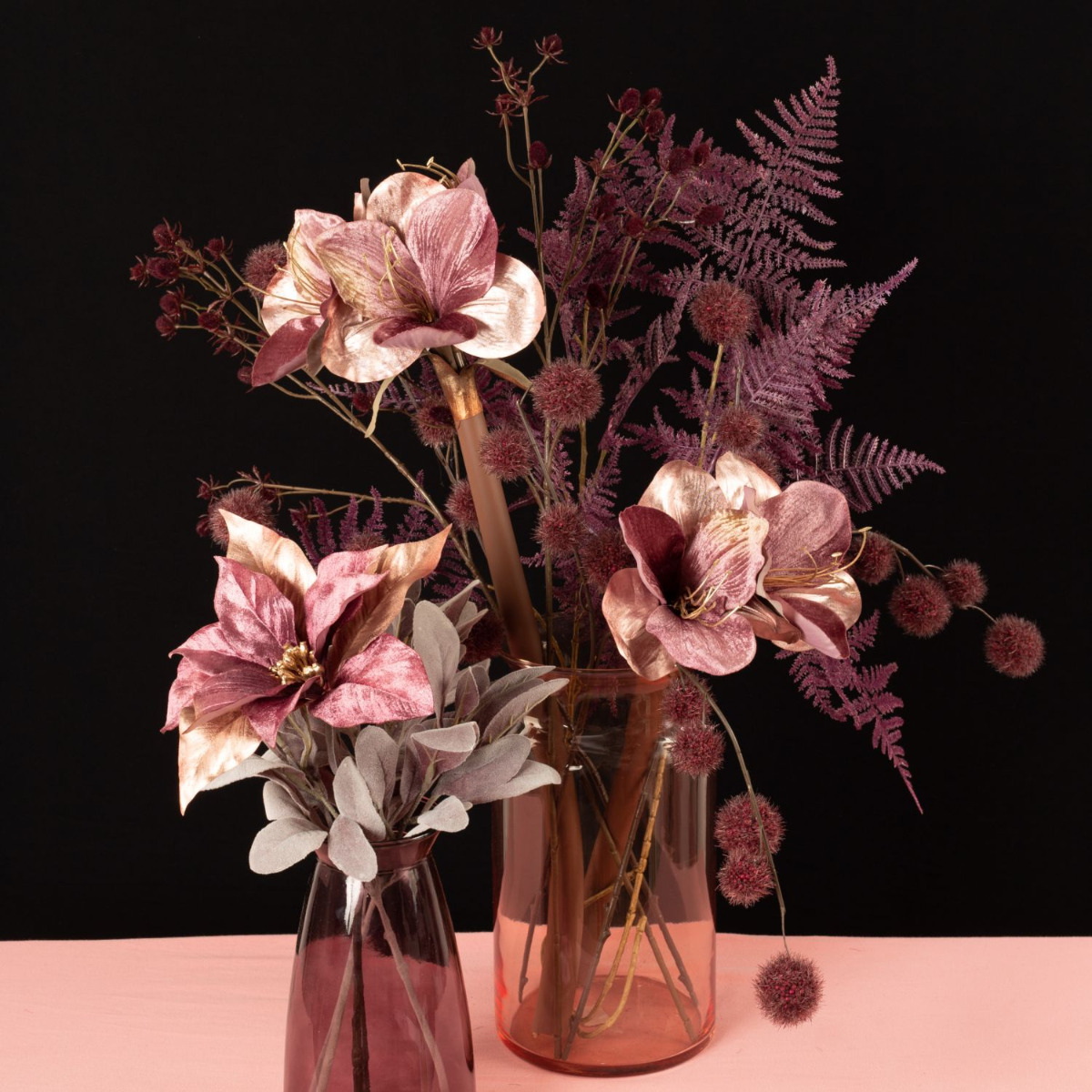 Rosé and burgundy! These are not only good wines that go well with winter, these colours also conjure up warmth in your home. The velvety winter flowers used here are a modern interpretation of Christmas in this unusual colour scheme. A sprig of wine-red Gomphorcarpus balls is reminiscent of small Christmas balls that surround the large flowers. For all those who have had enough of red and green at Christmas time. Shop the Look!