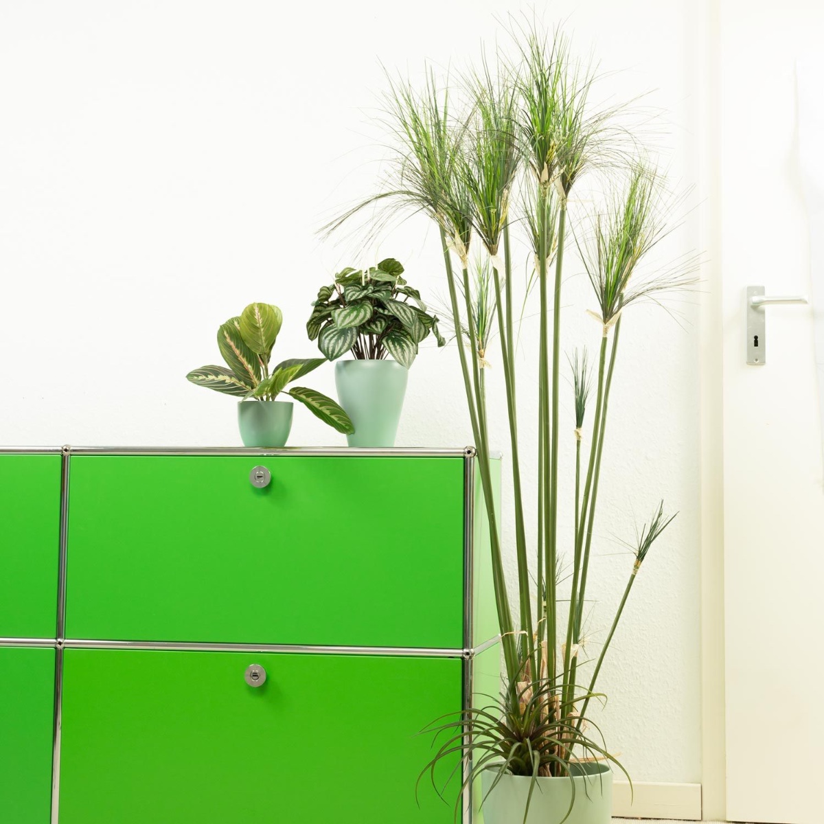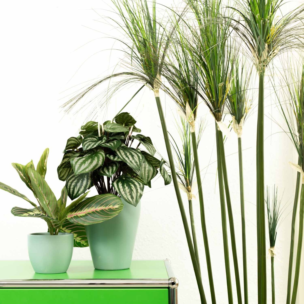 Green and mint! Green plants are particularly suitable as decorations for the office because they are relaxing for the eyes and the mind. It's practical that you don't even have to water them when you're absorbed in your work, because artificial plants always stay green and require little care. The peperomia and arrowroot harmonise perfectly in this look and go well with the mint-coloured pots. Work can look so beautiful! Shop the look!