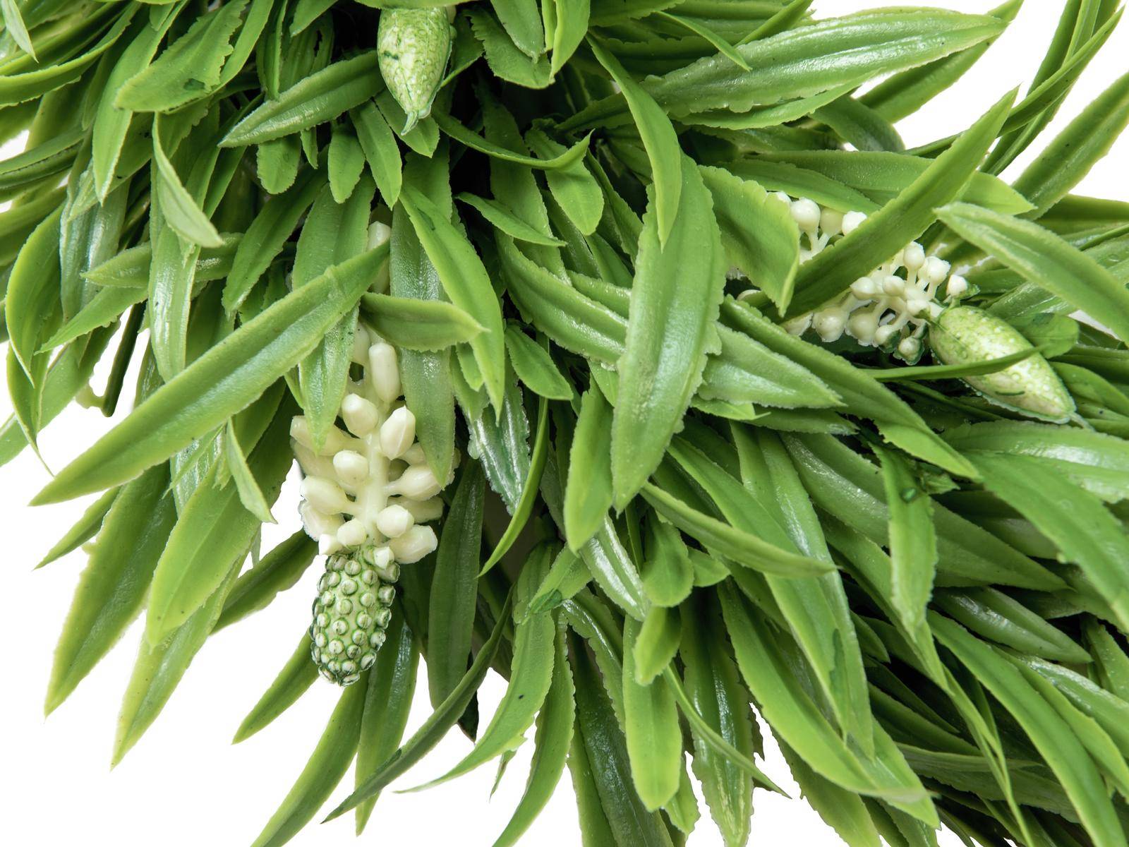 - The wreath is adorned with many white lavender flowers and longish green leaves for a natural look